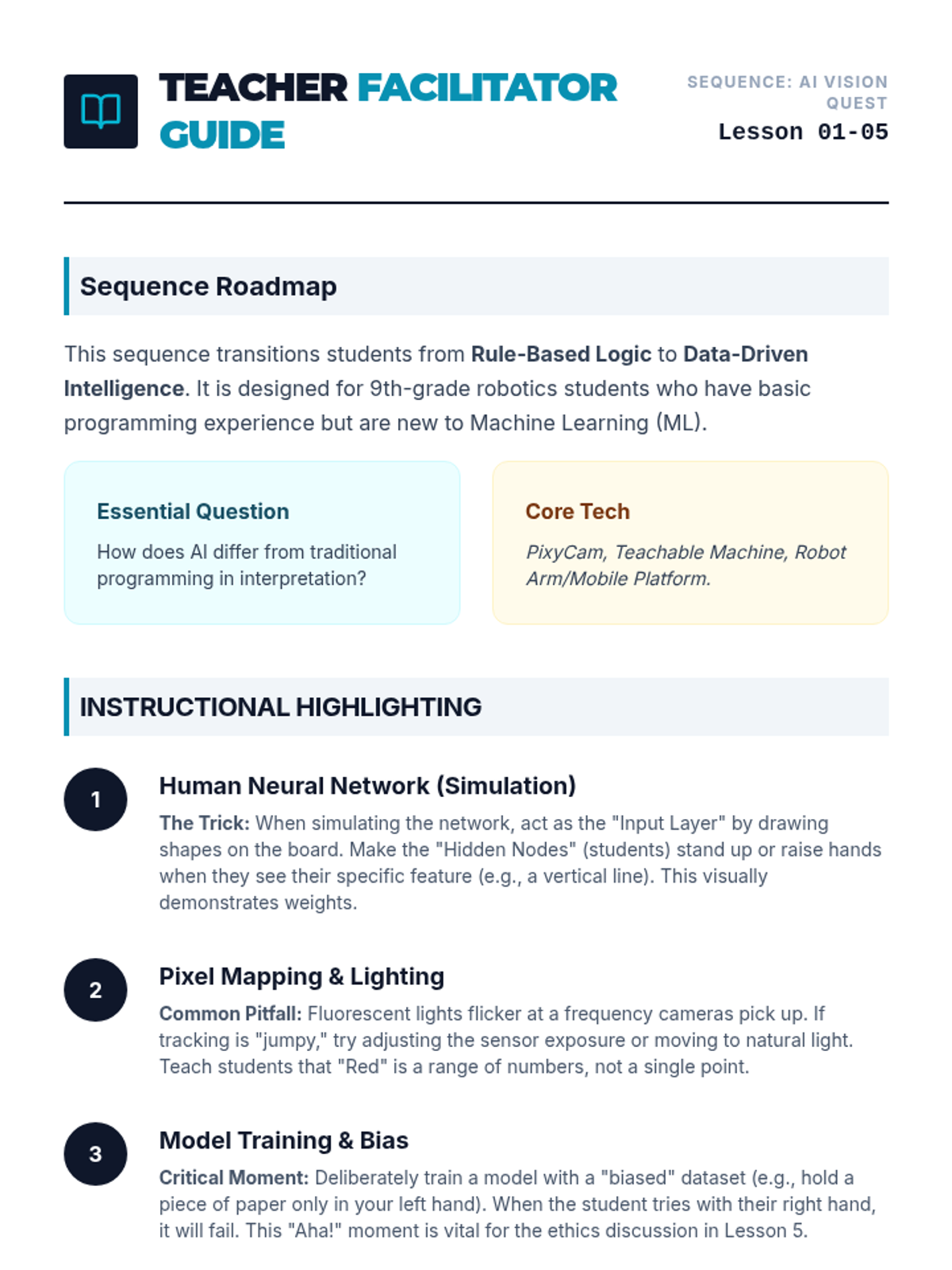 An advanced 9th-grade engineering sequence exploring AI and computer vision in robotics. Students transition from traditional logic to machine learning, training models to interpret visual data and applying these skills to a physical sorting robot project.