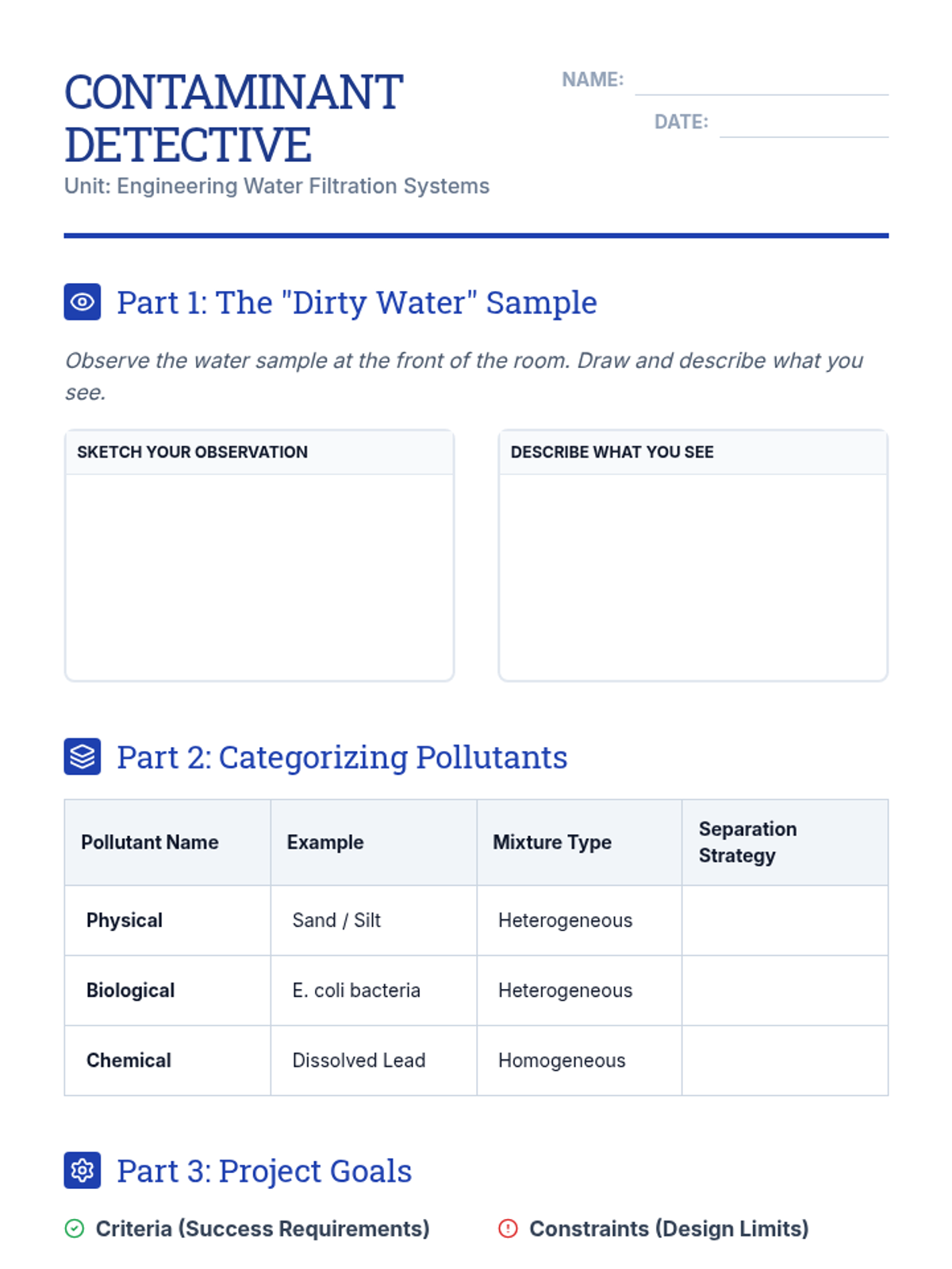 An engineering-focused unit where 8th-grade students design, build, and test water filtration systems, applying concepts of heterogeneous and homogeneous mixtures to solve real-world water purification challenges.