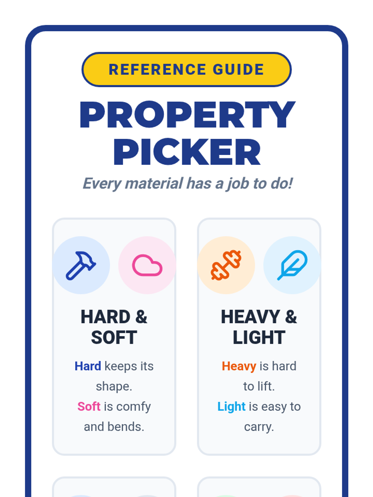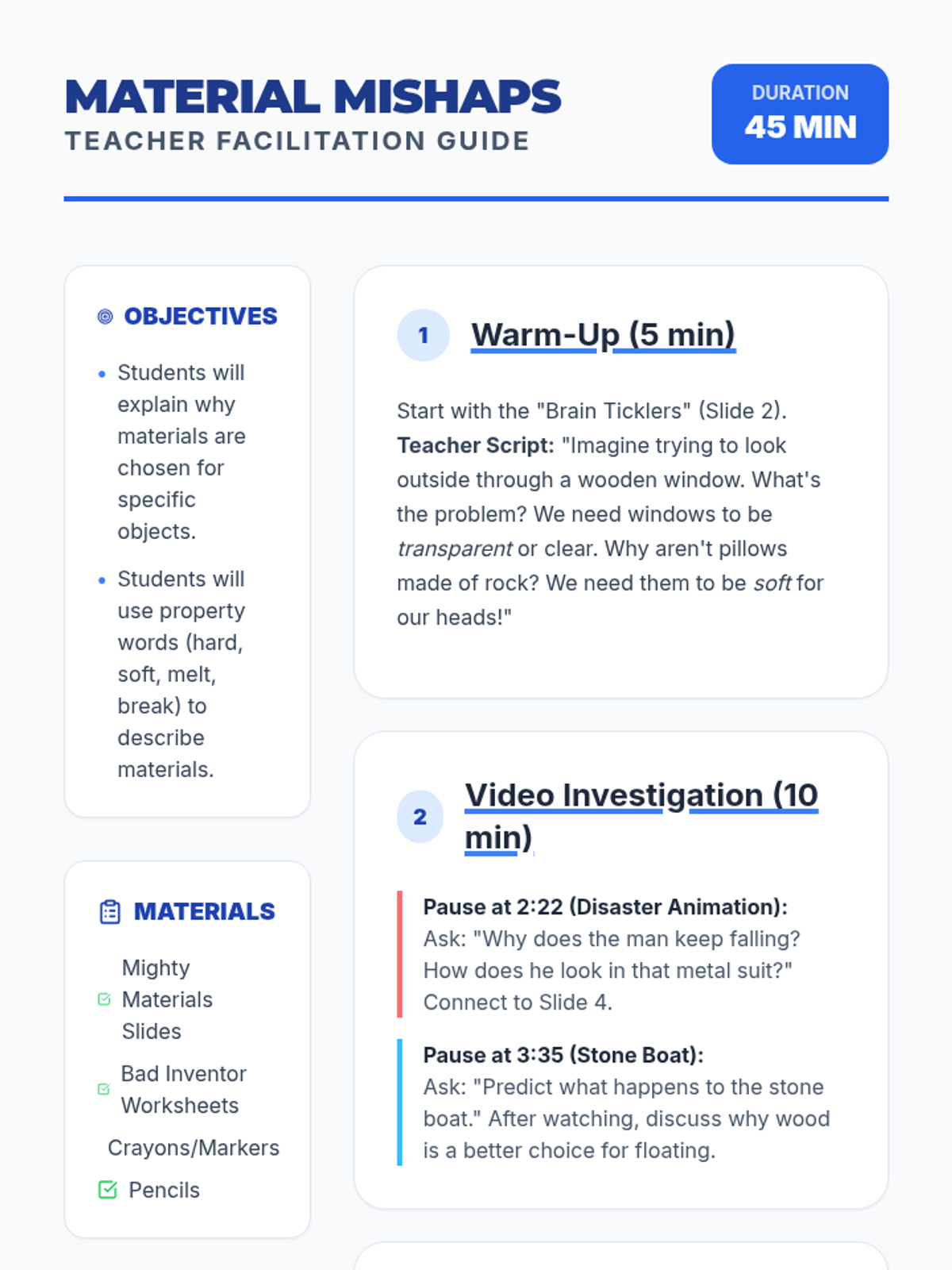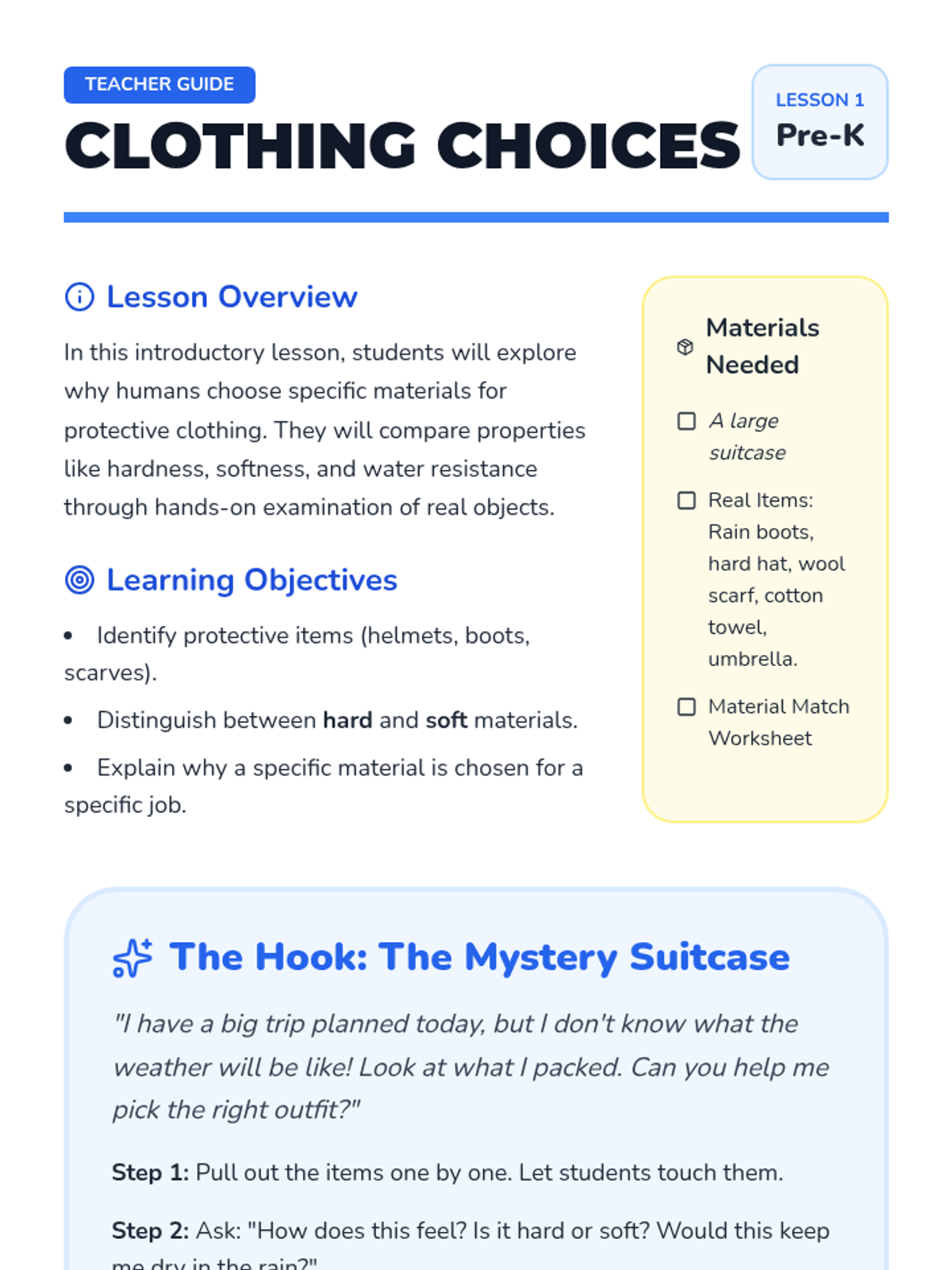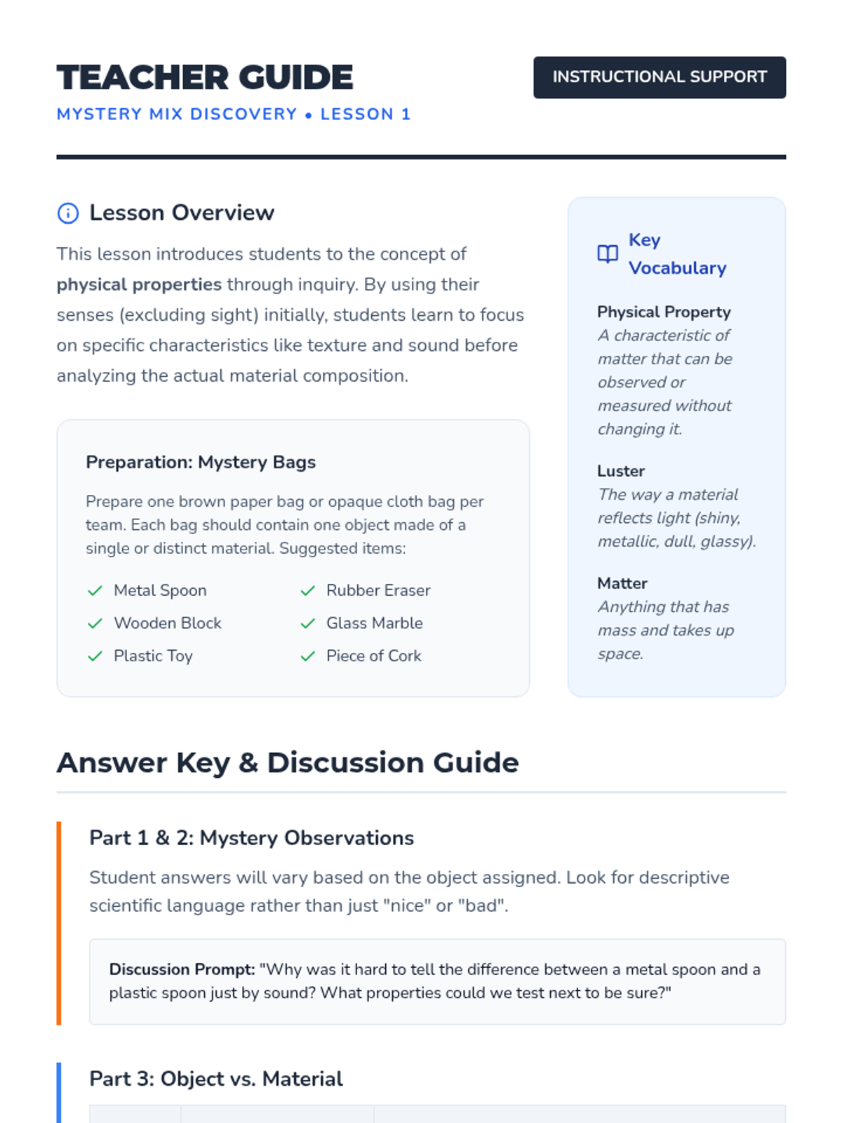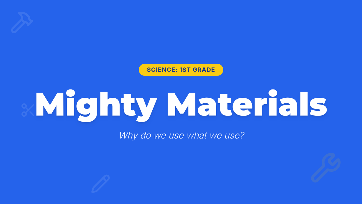 A 1st-grade science sequence focused on identifying physical properties of materials and understanding the relationship between a material's structure and its function. Students explore real-world examples and use creative problem-solving to explain why specific materials are chosen for objects.