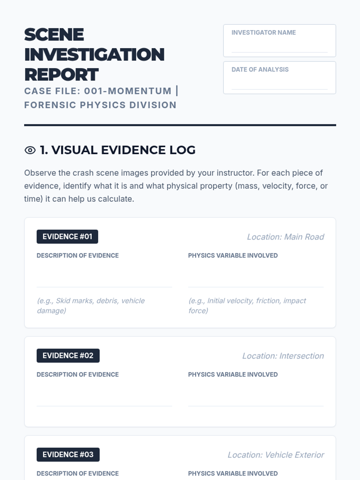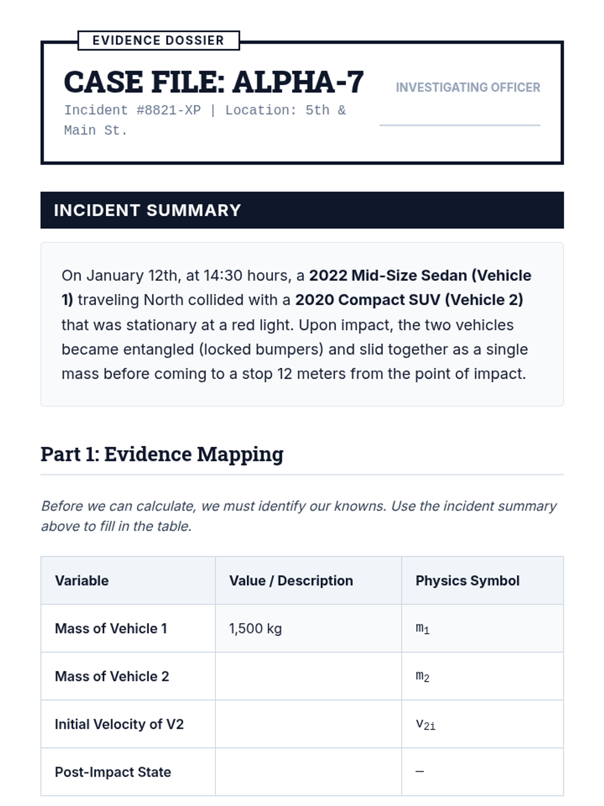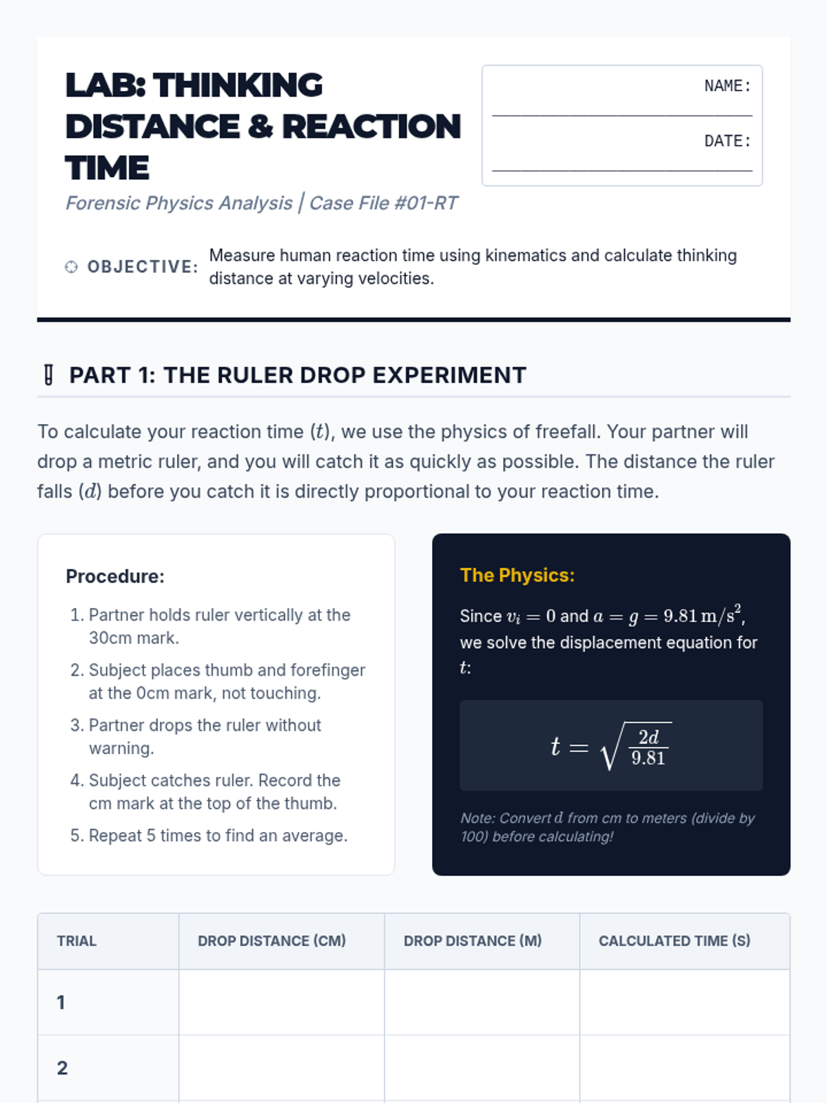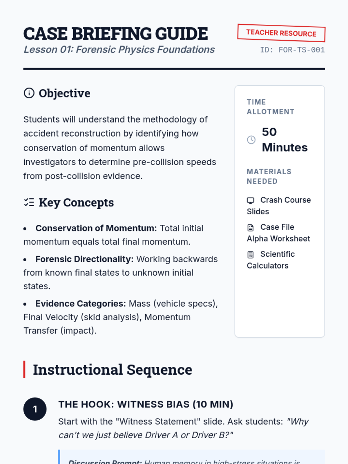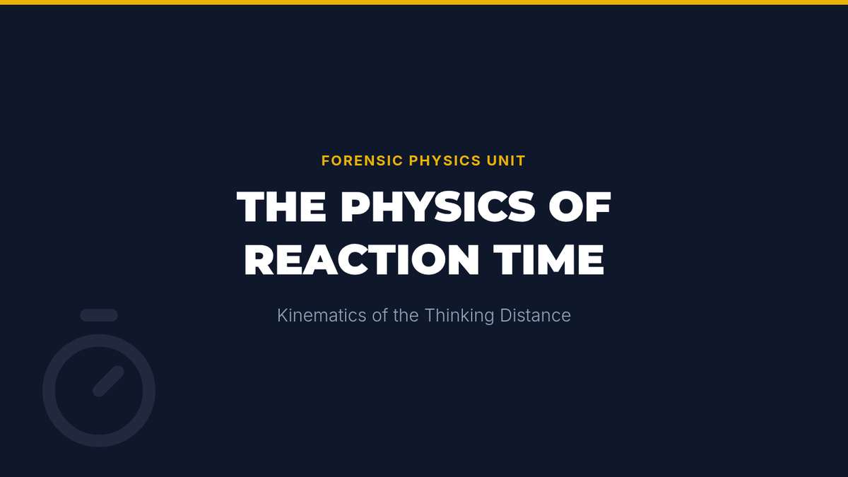 A comprehensive 5-lesson sequence applying kinematic principles to forensic accident reconstruction. Students explore reaction times, braking distances, intersection timing, and following gaps to analyze traffic safety and legal liability through the lens of one-dimensional motion.