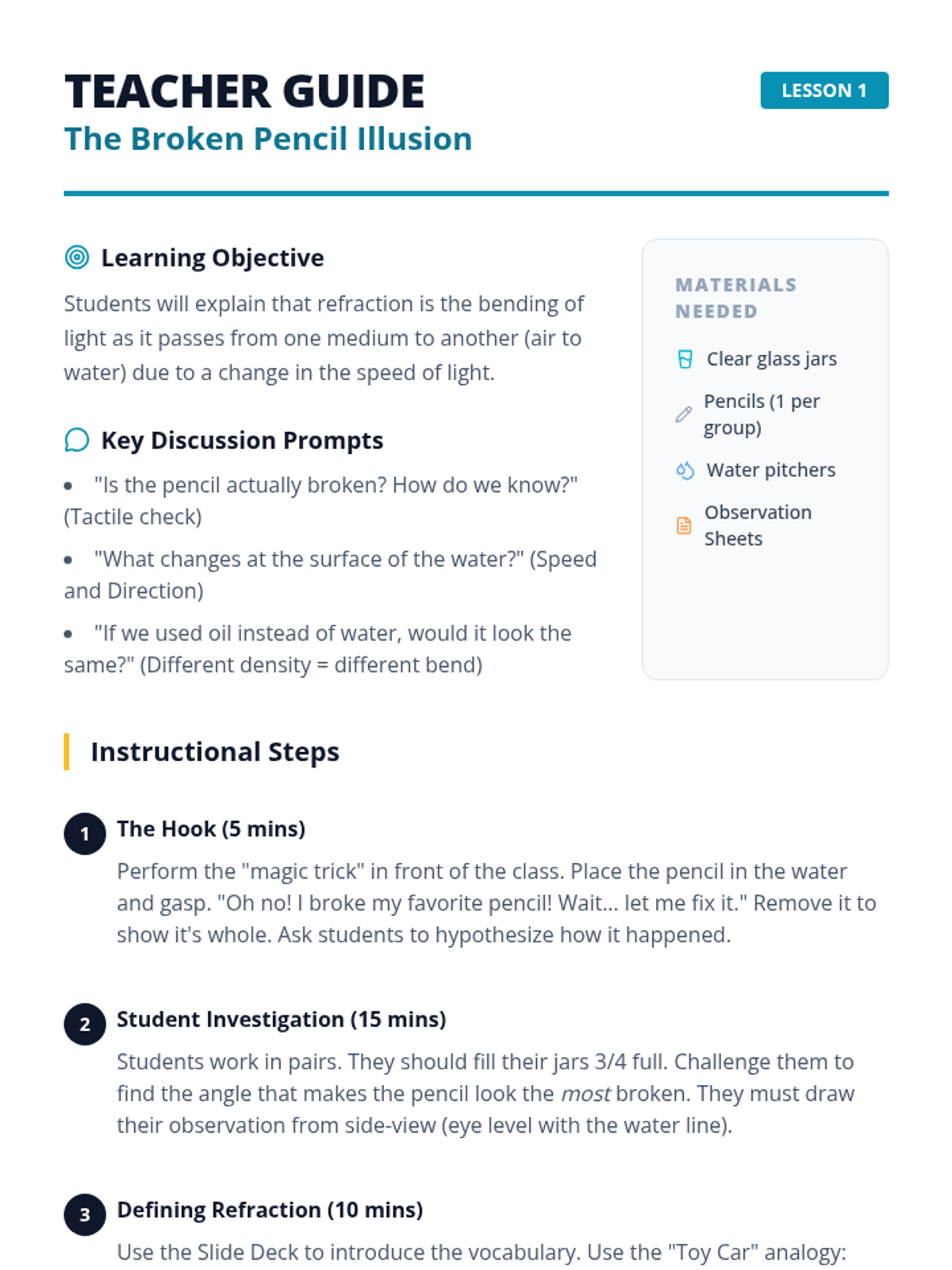 A 5-lesson unit for 4th graders exploring refraction, prisms, and lenses. Students use a hands-on lab approach to investigate how light bends and splits into colors.