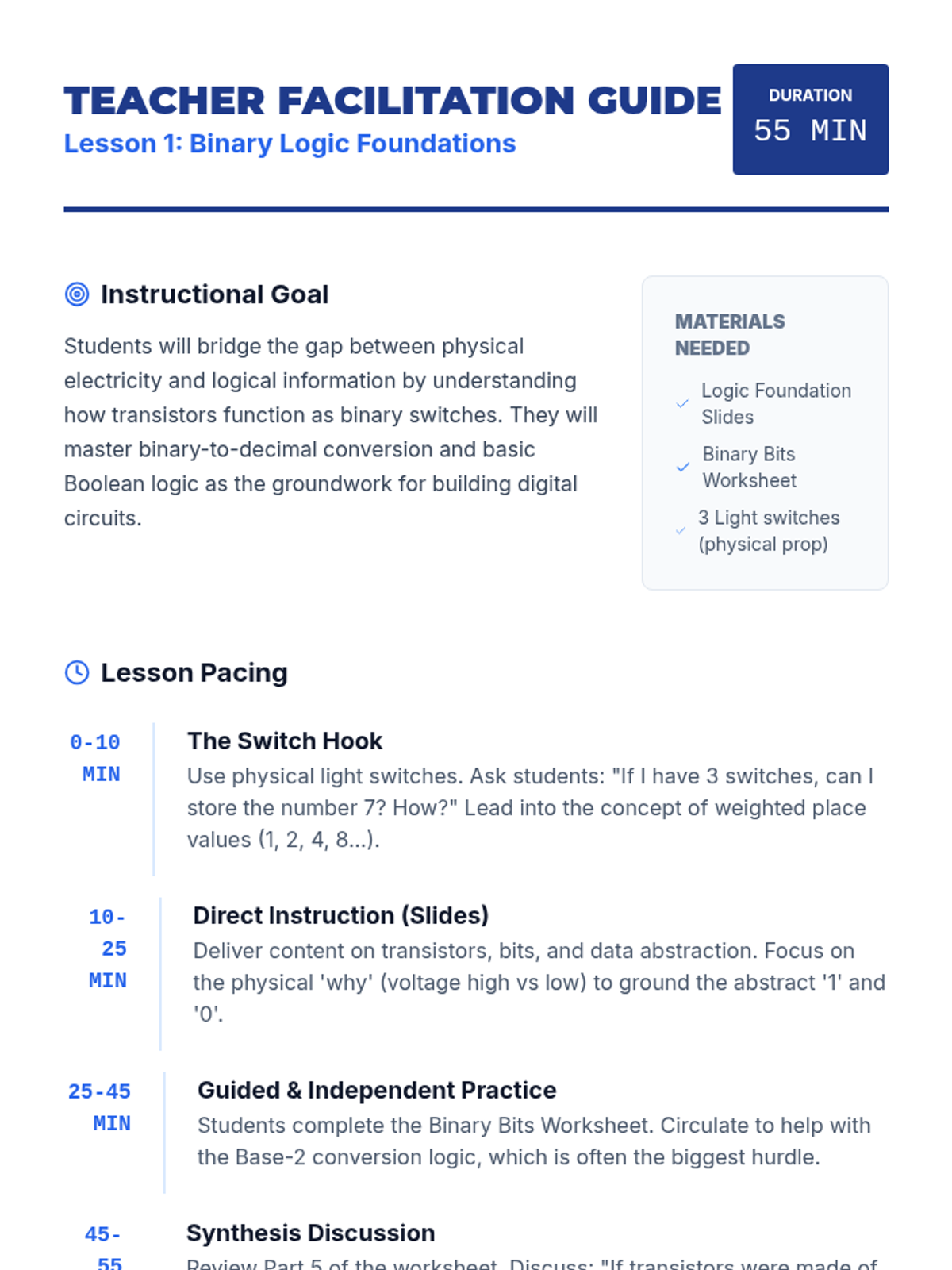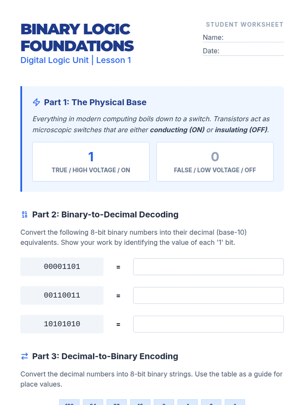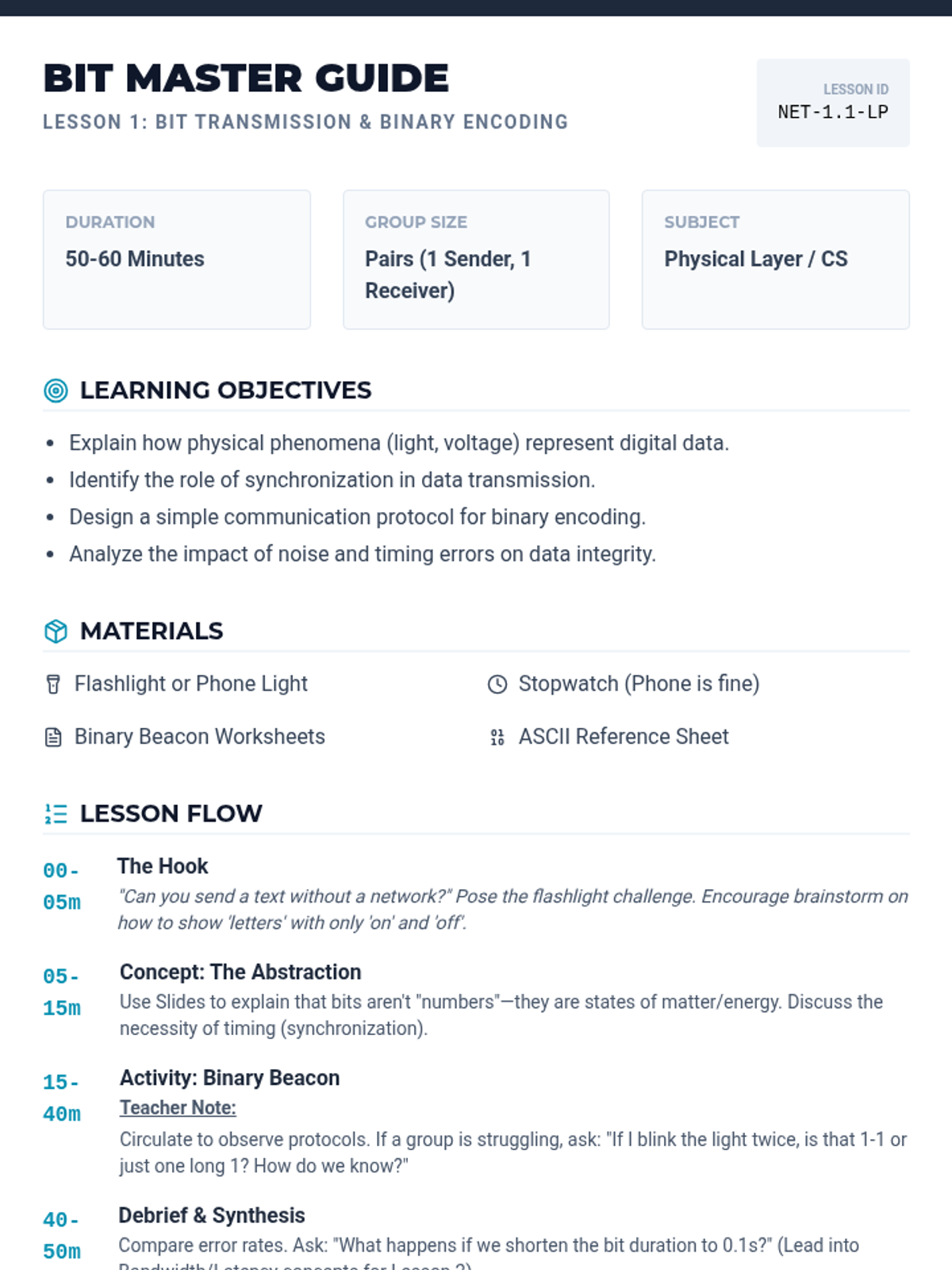 This sequence introduces 11th-grade students to the physical and logical foundations of computer networks. Students explore bit transmission, analyze performance metrics like bandwidth and latency, compare physical media, and design local network topologies.
