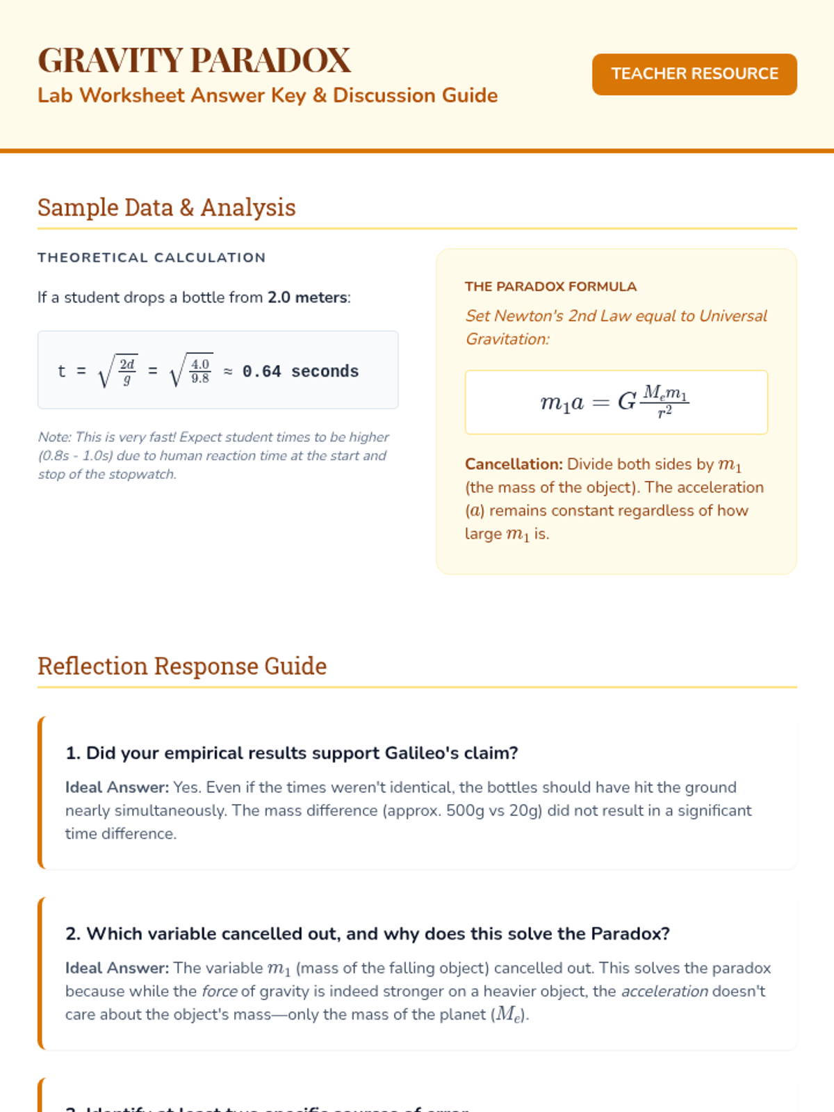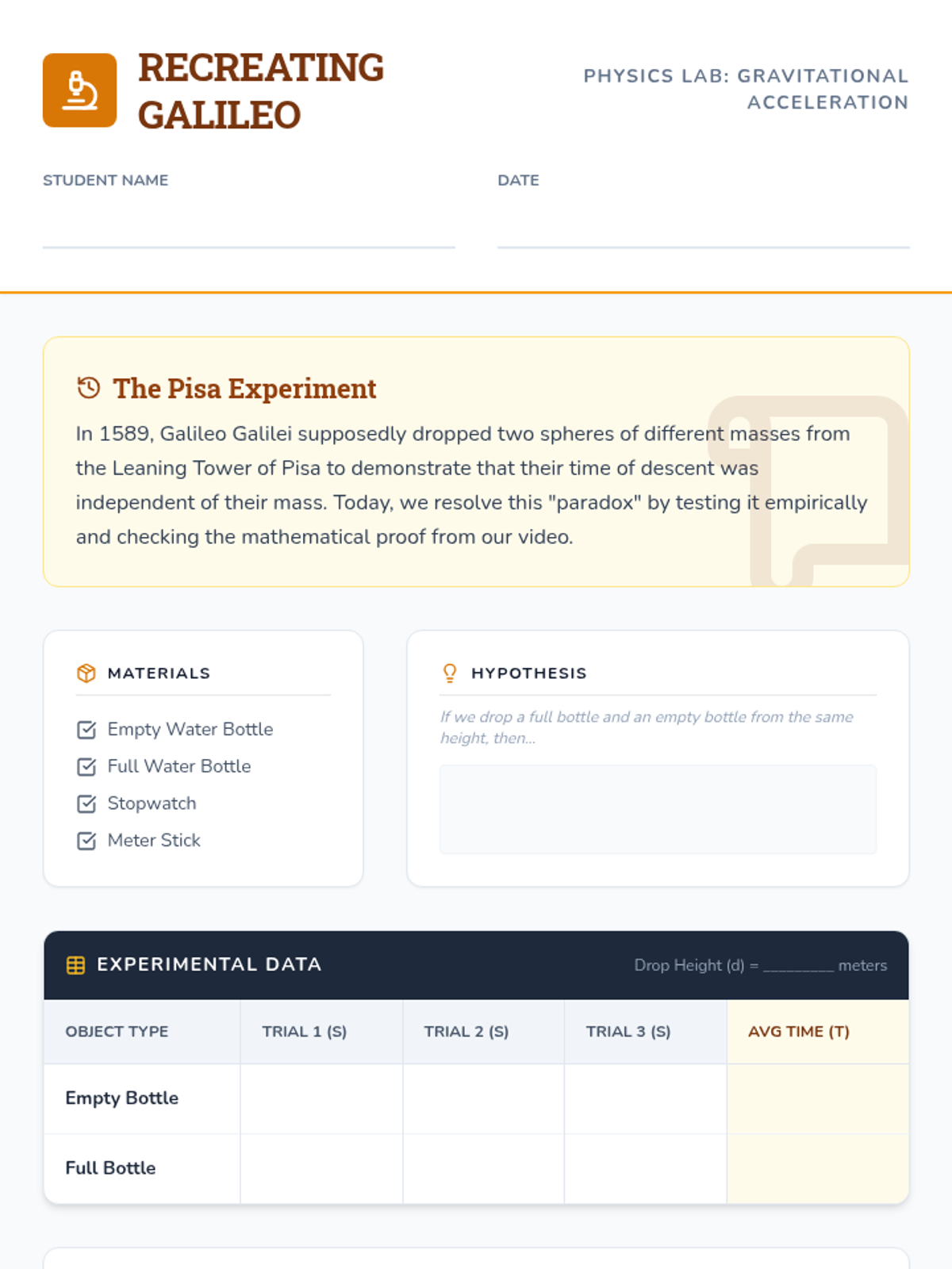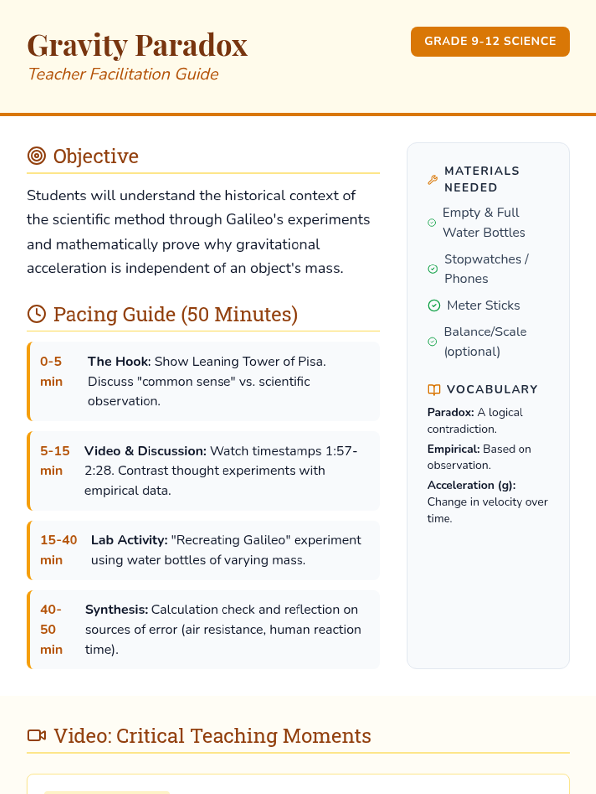 A lesson focused on Galileo's gravitational experiments and the mathematical resolution of the 'gravity paradox,' where mass cancels out in the calculation of acceleration. Students conduct a hands-on lab using bottles of different masses to test empirical results against theoretical models.