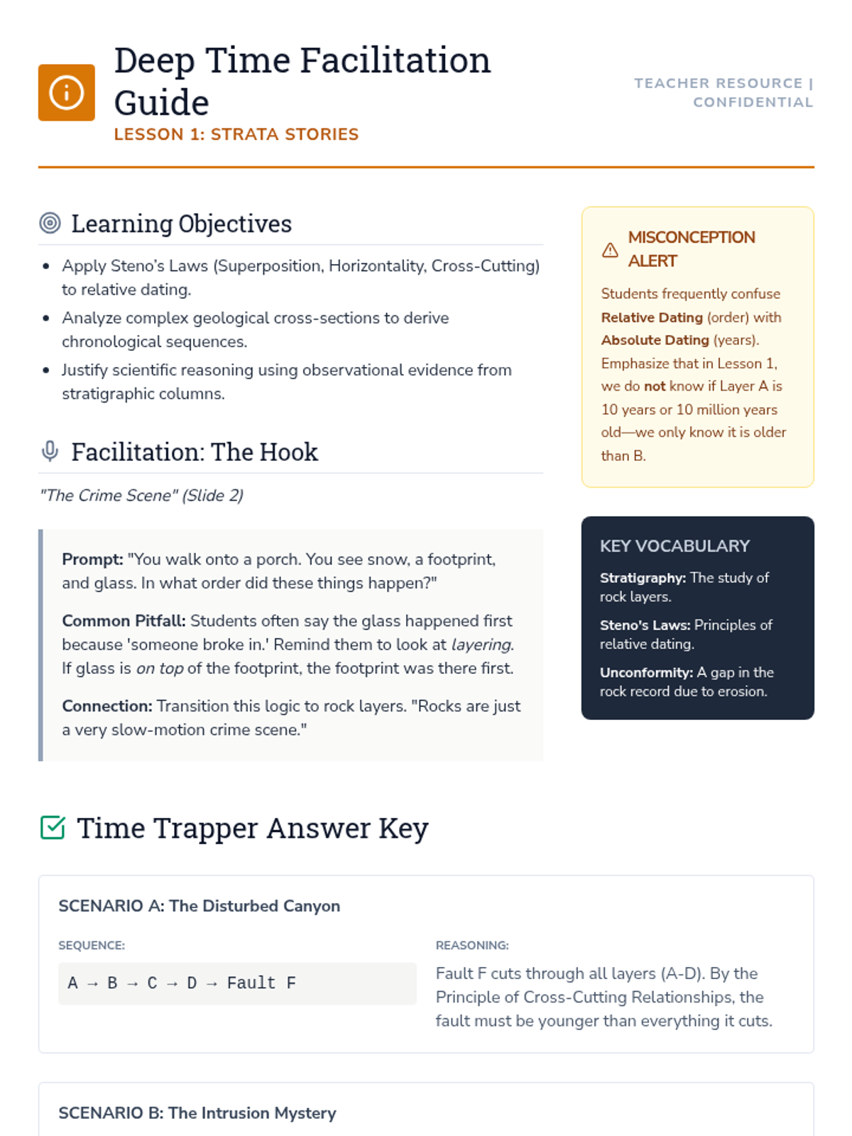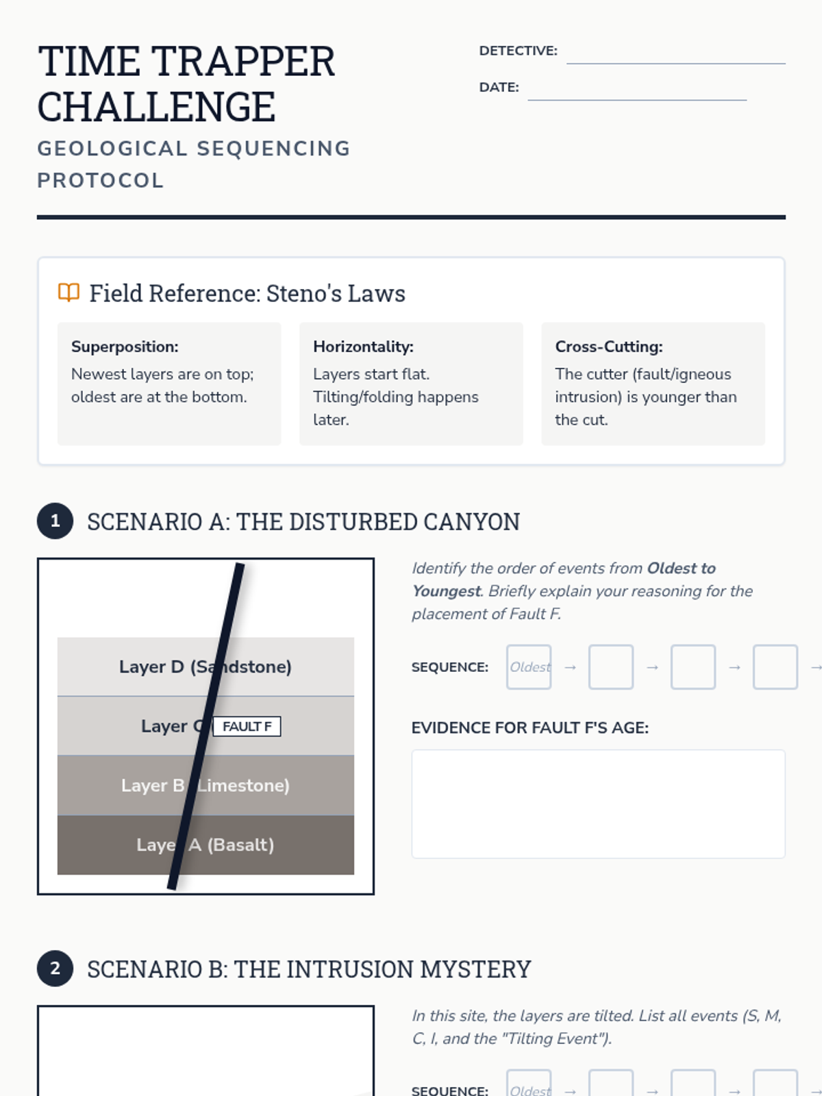 A comprehensive 5-lesson sequence on stratigraphy and geochronology, moving from qualitative relative dating to quantitative radiometric analysis. Students act as geological detectives to reconstruct Earth's history using Steno's laws, index fossils, and radioactive decay.