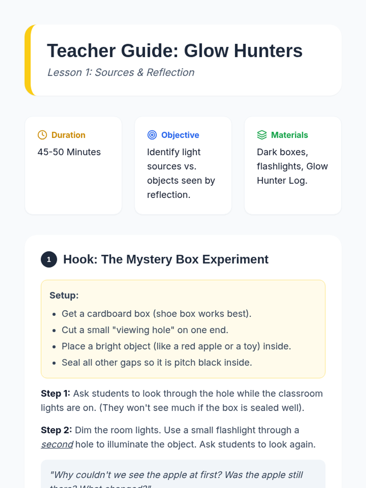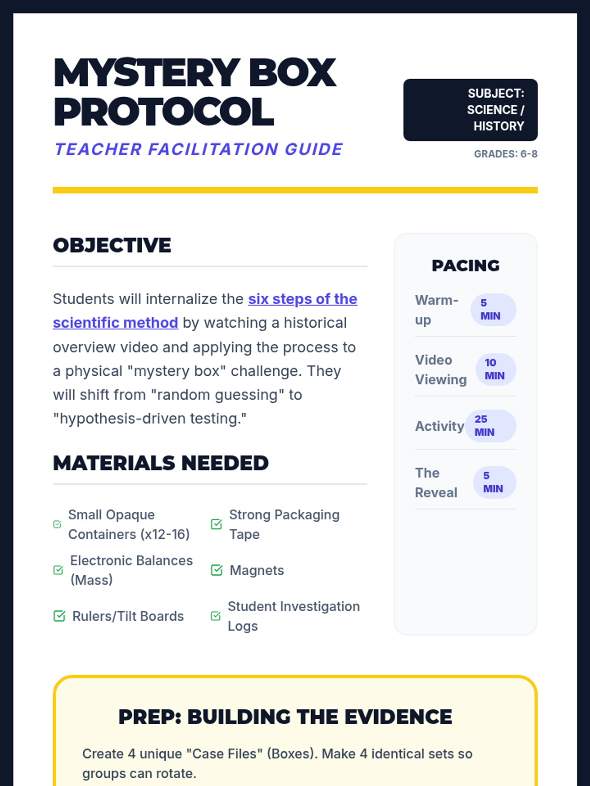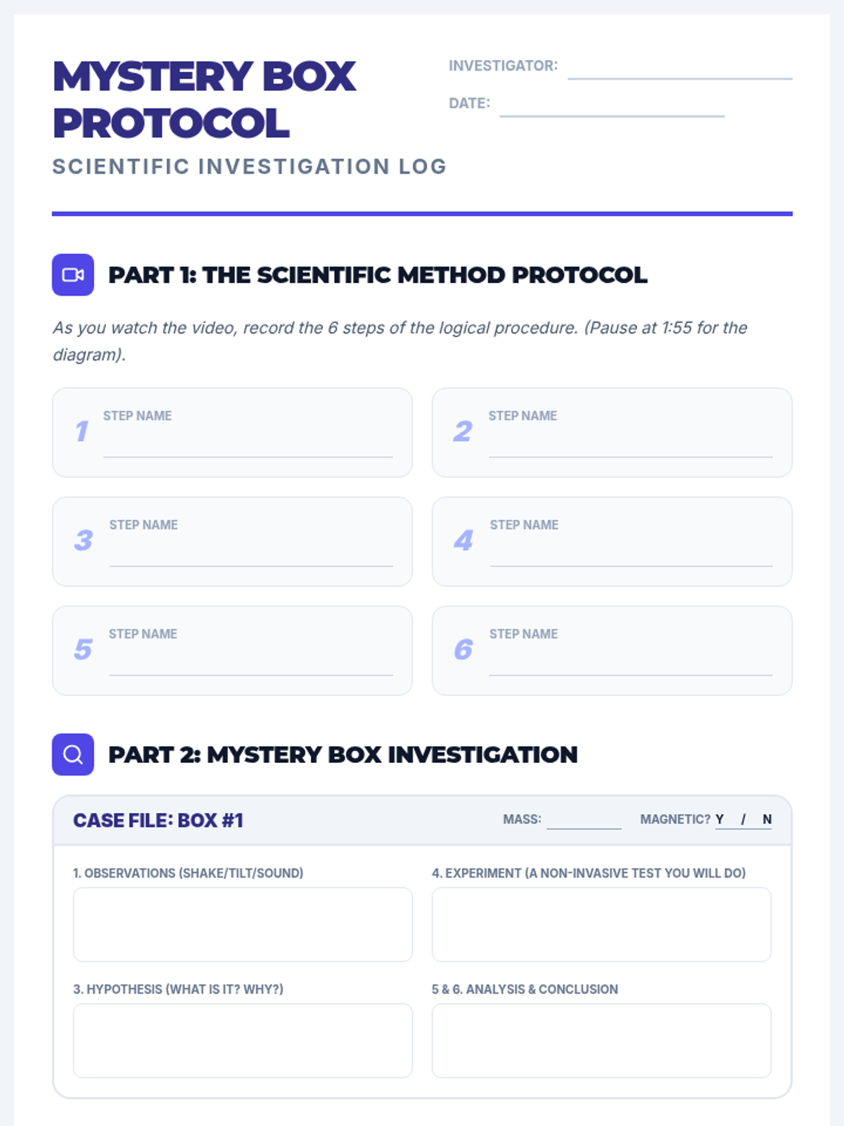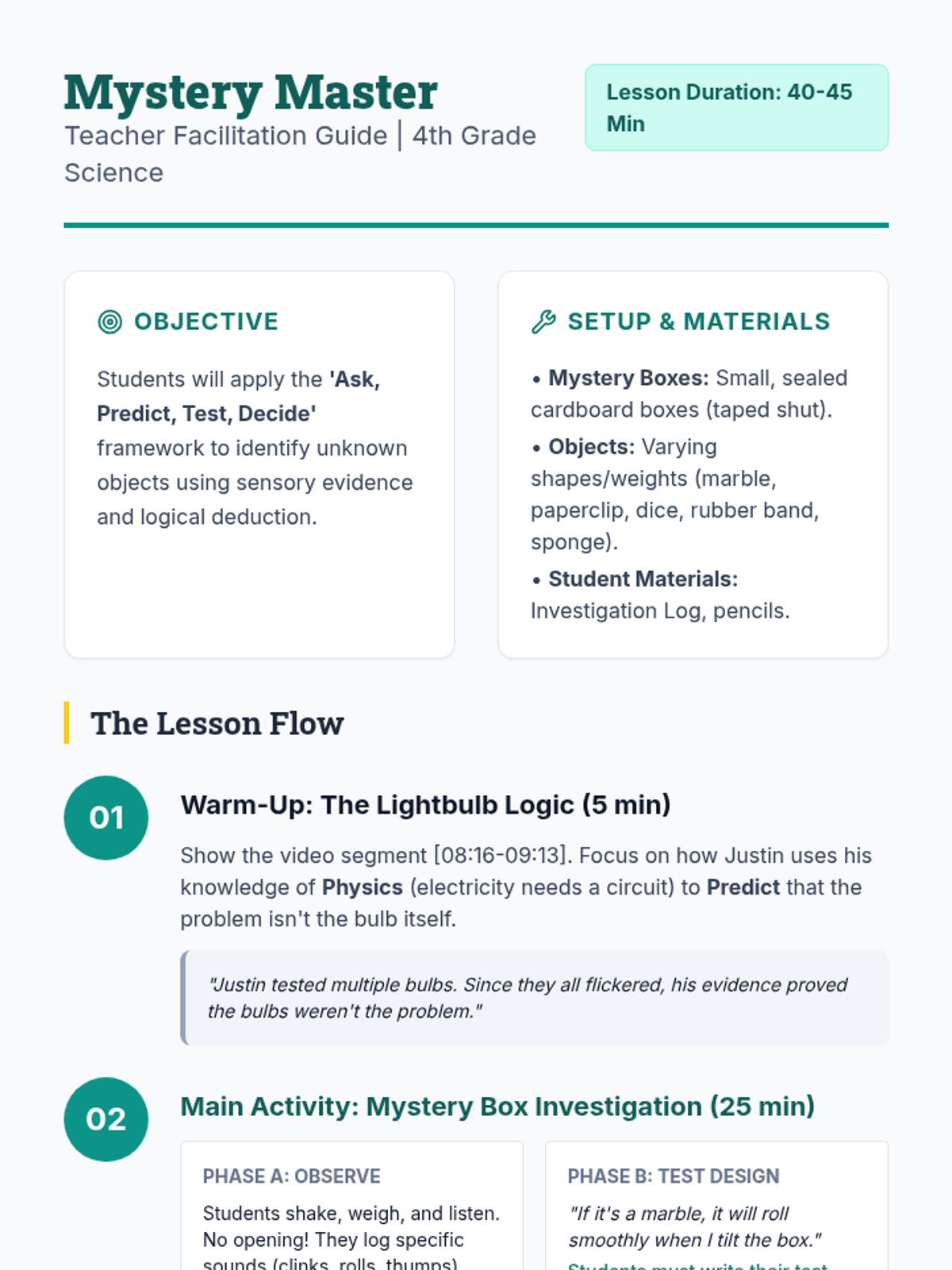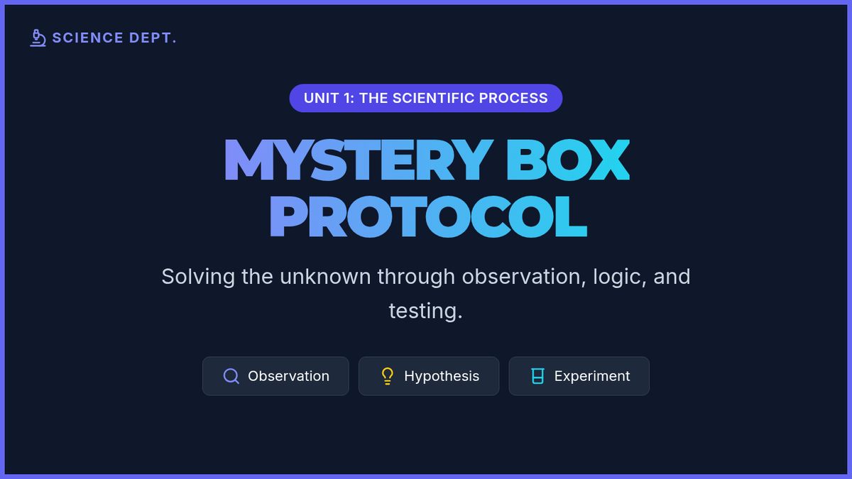 A lesson sequence focused on the scientific method, using a mystery box activity to practice observation, hypothesis formation, and experimentation. Students explore the historical roots of the method and apply it to solve physical puzzles.