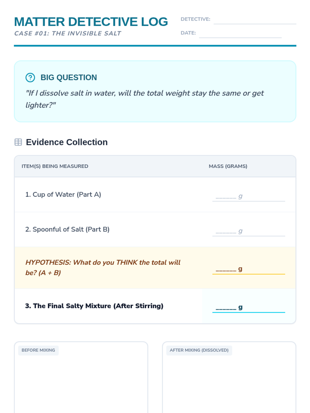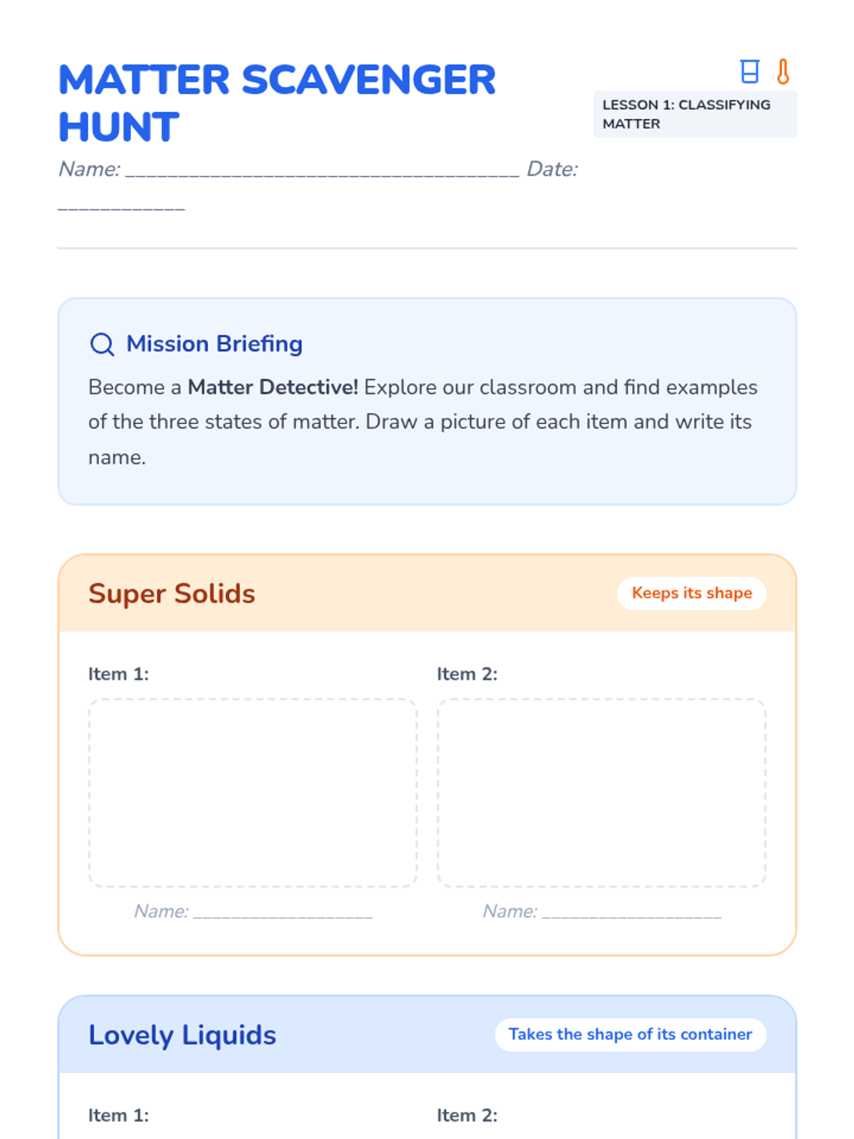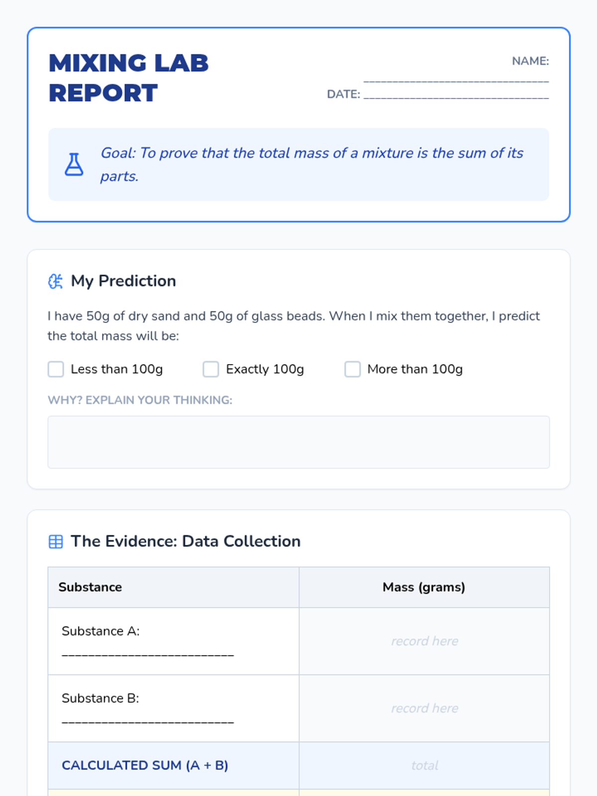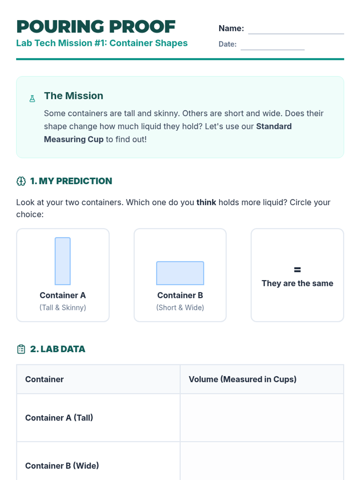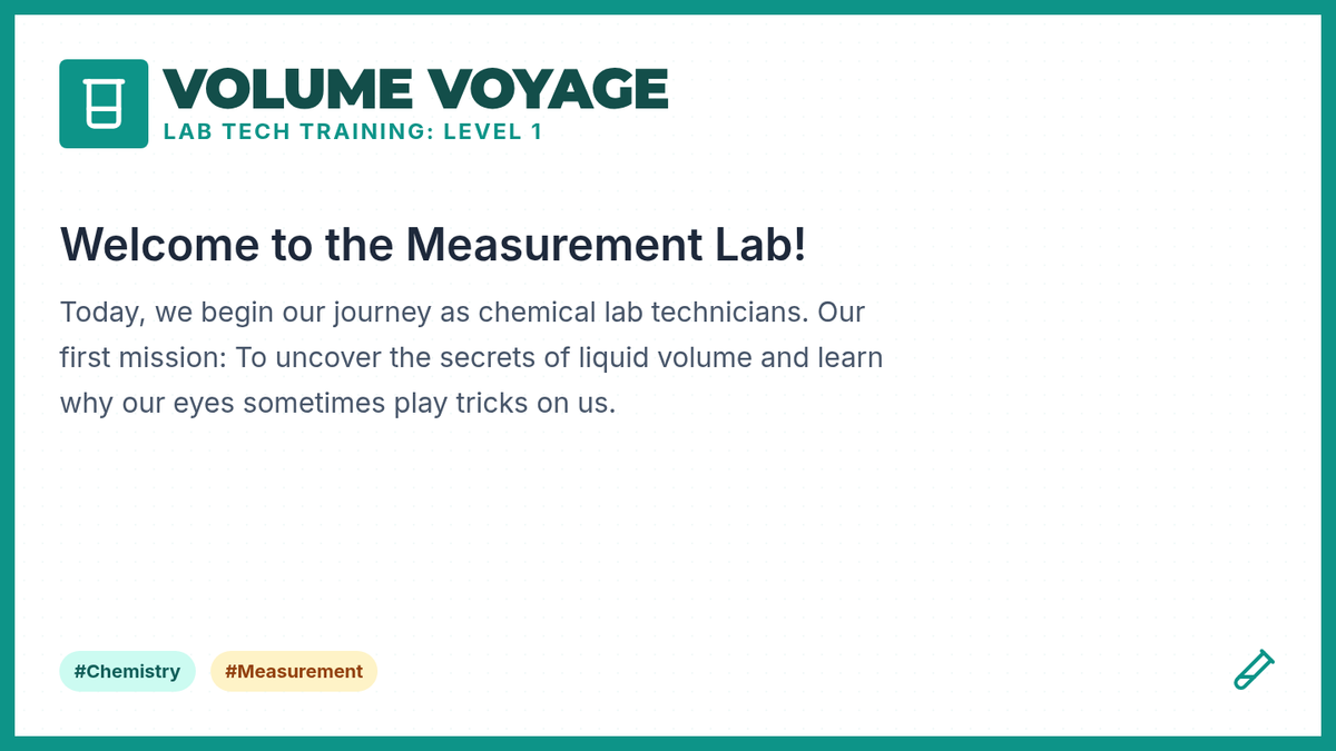 A 2nd-grade chemistry sequence where students transform into lab technicians to master measuring liquid volume and mass. Through hands-on 'Lab Mixing Station' activities, students learn to use beakers, graduated cylinders, and balance scales to follow precise formulas for chemical reactions.