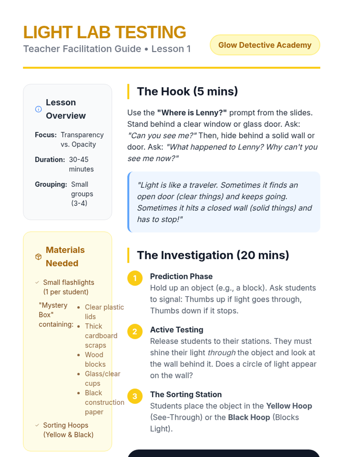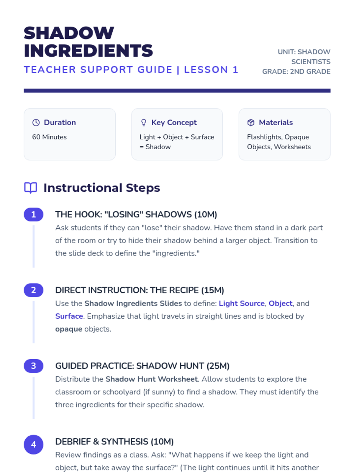 A 2nd-grade science sequence where students investigate how light interacts with materials, culminating in a design challenge to block light effectively. Students progress from identifying light sources to classifying materials as transparent, translucent, and opaque.