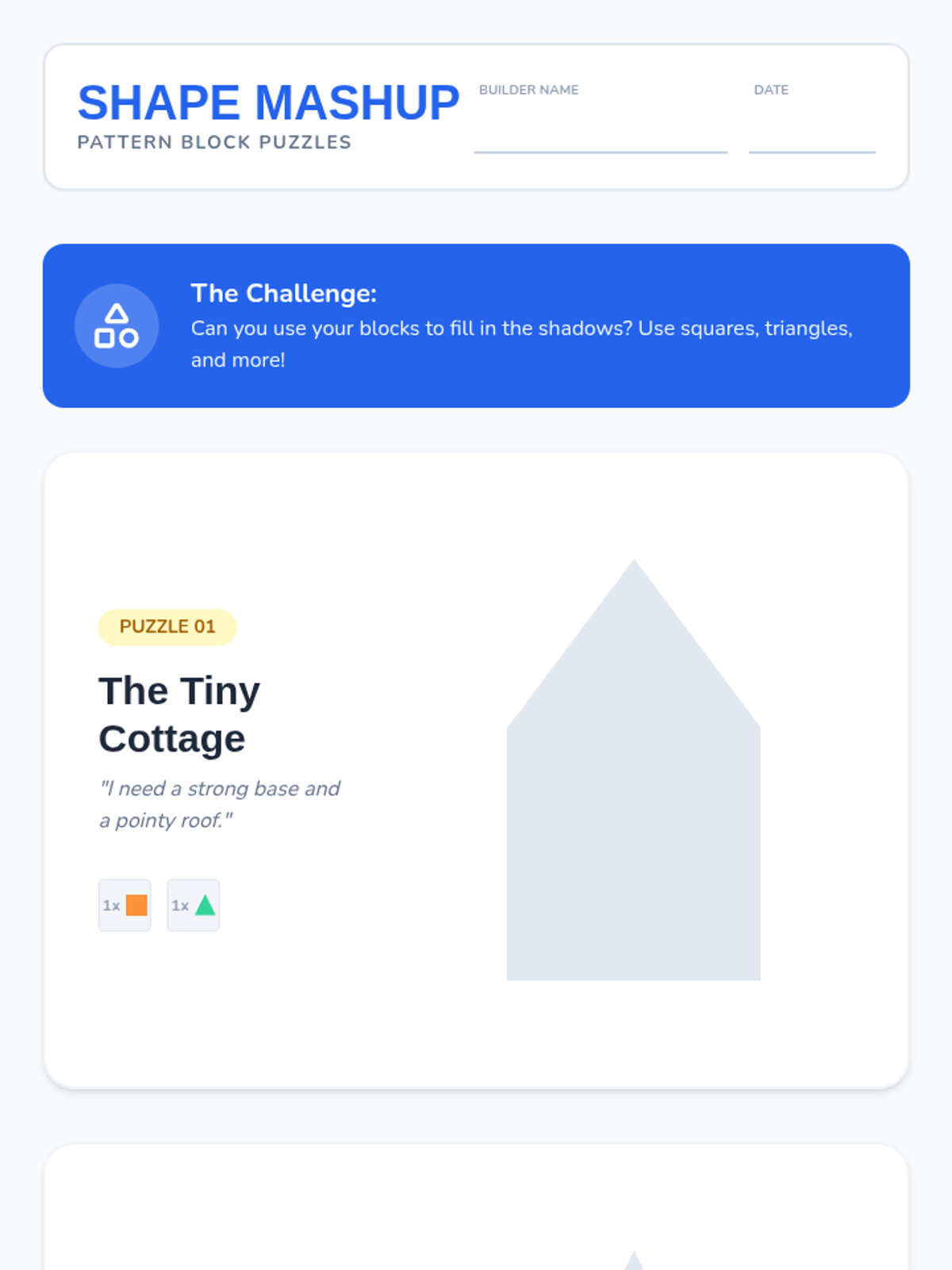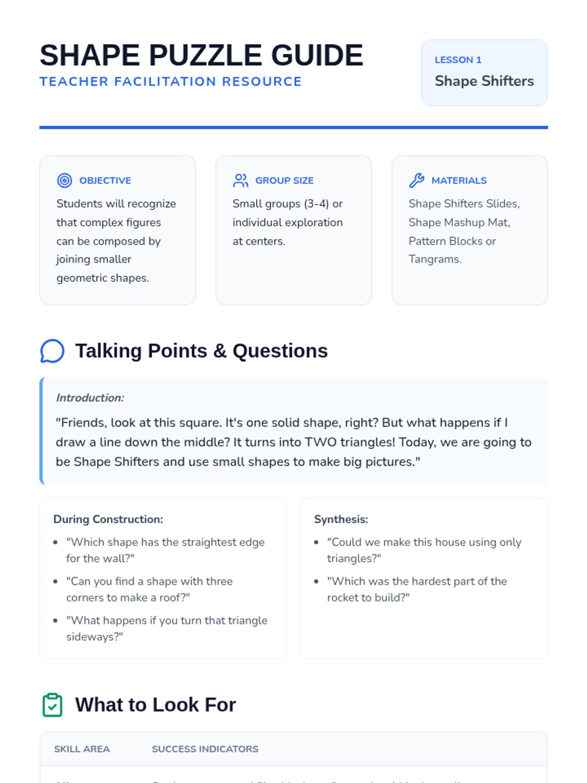 A Pre-K engineering sequence exploring shape composition, stability, and structural design through hands-on block play and spatial reasoning challenges.