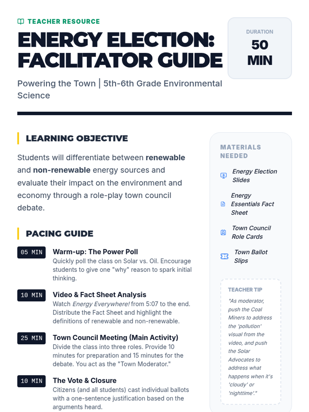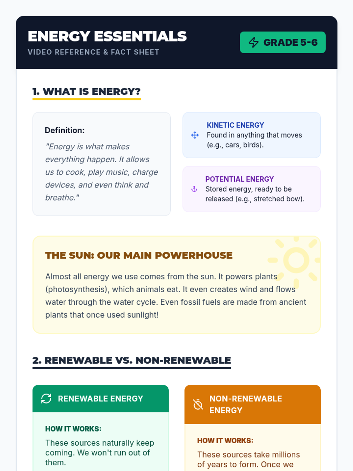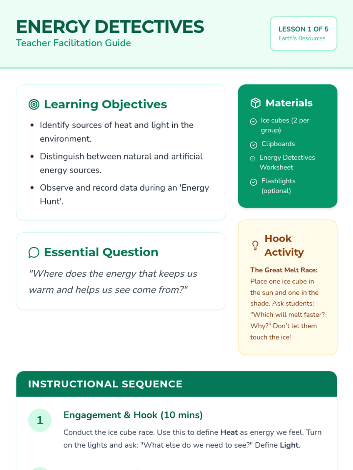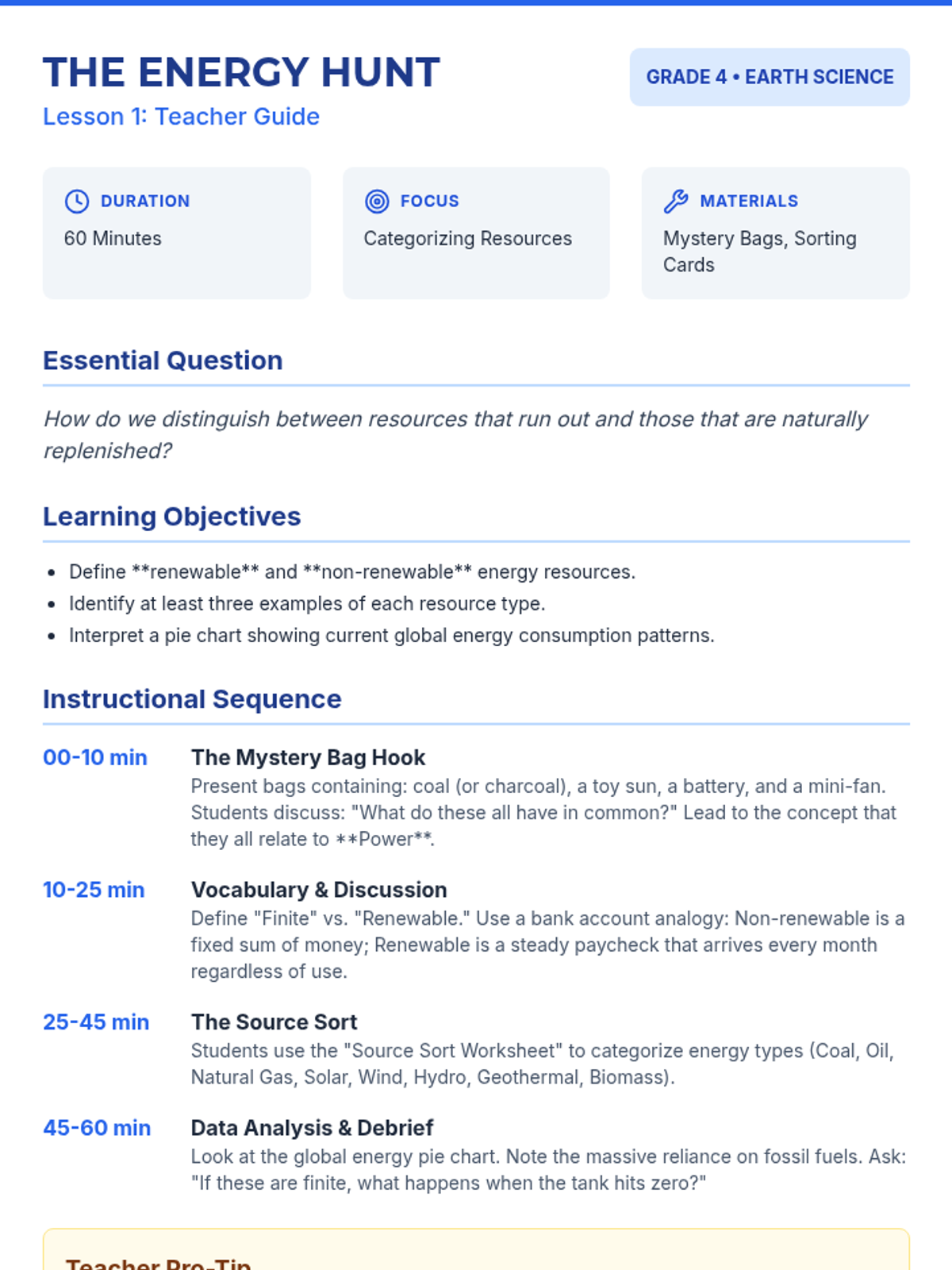 A 2nd-grade science unit exploring renewable and non-renewable energy resources through hands-on inquiry, experiments, and a final design challenge. Students learn to distinguish between different energy sources and understand the importance of sustainability.