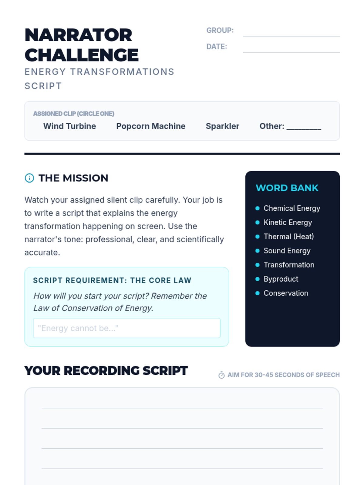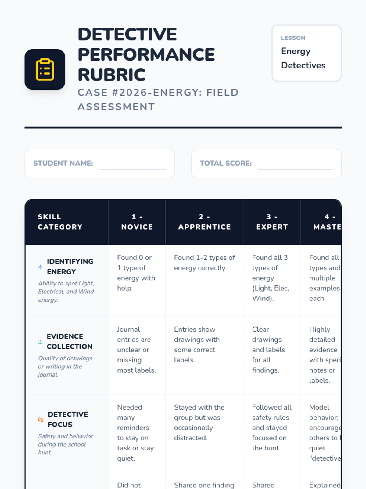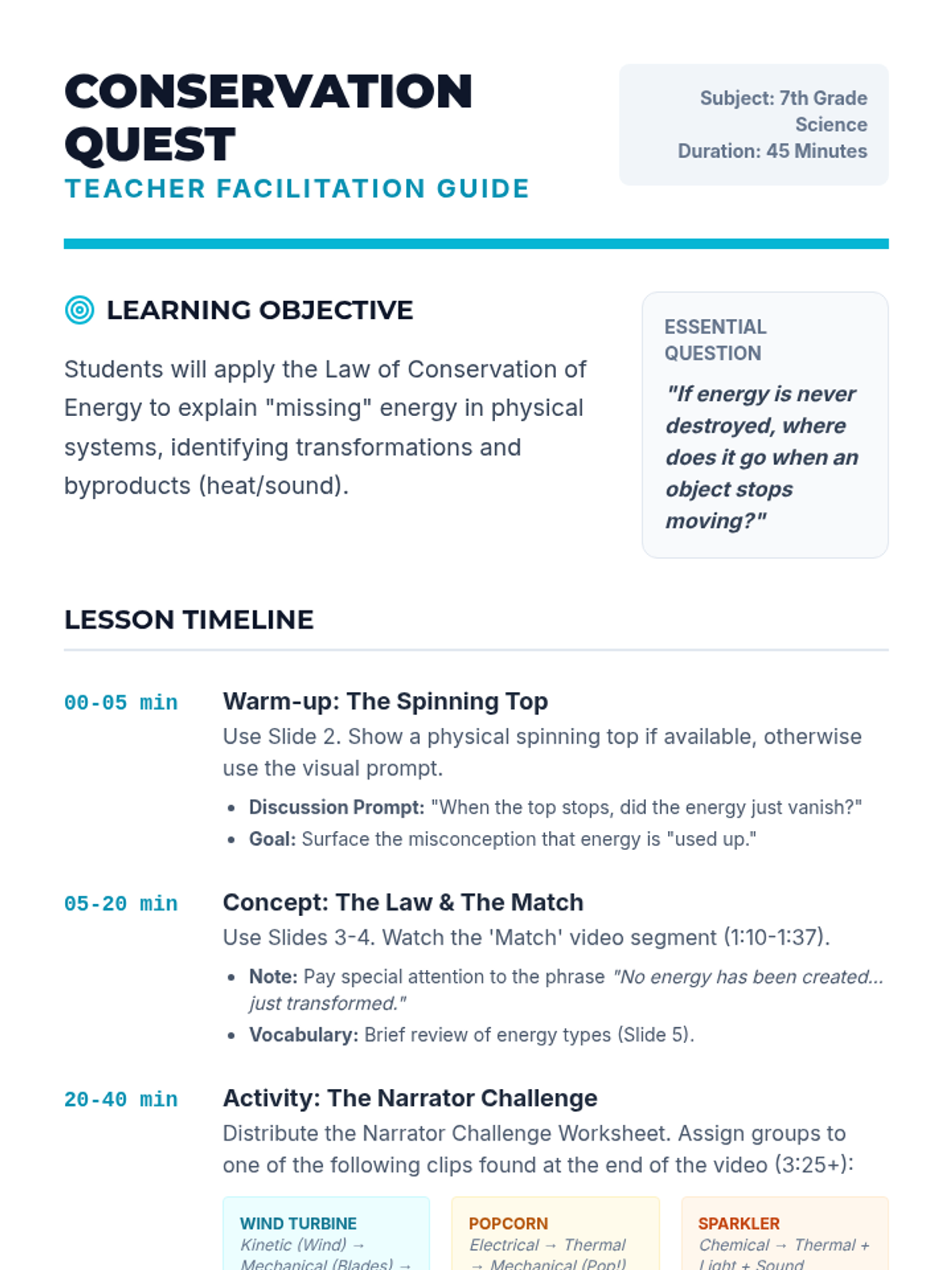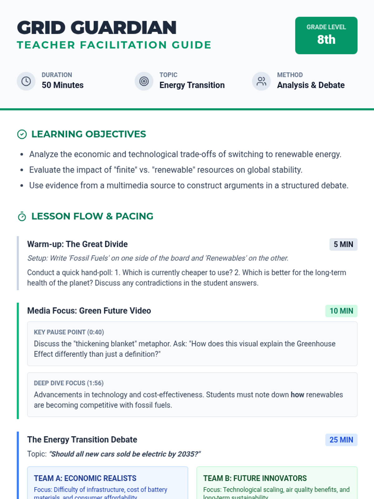 A 2nd-grade science unit exploring renewable and non-renewable energy resources through hands-on inquiry, experiments, and a final design challenge. Students learn to distinguish between different energy sources and understand the importance of sustainability.