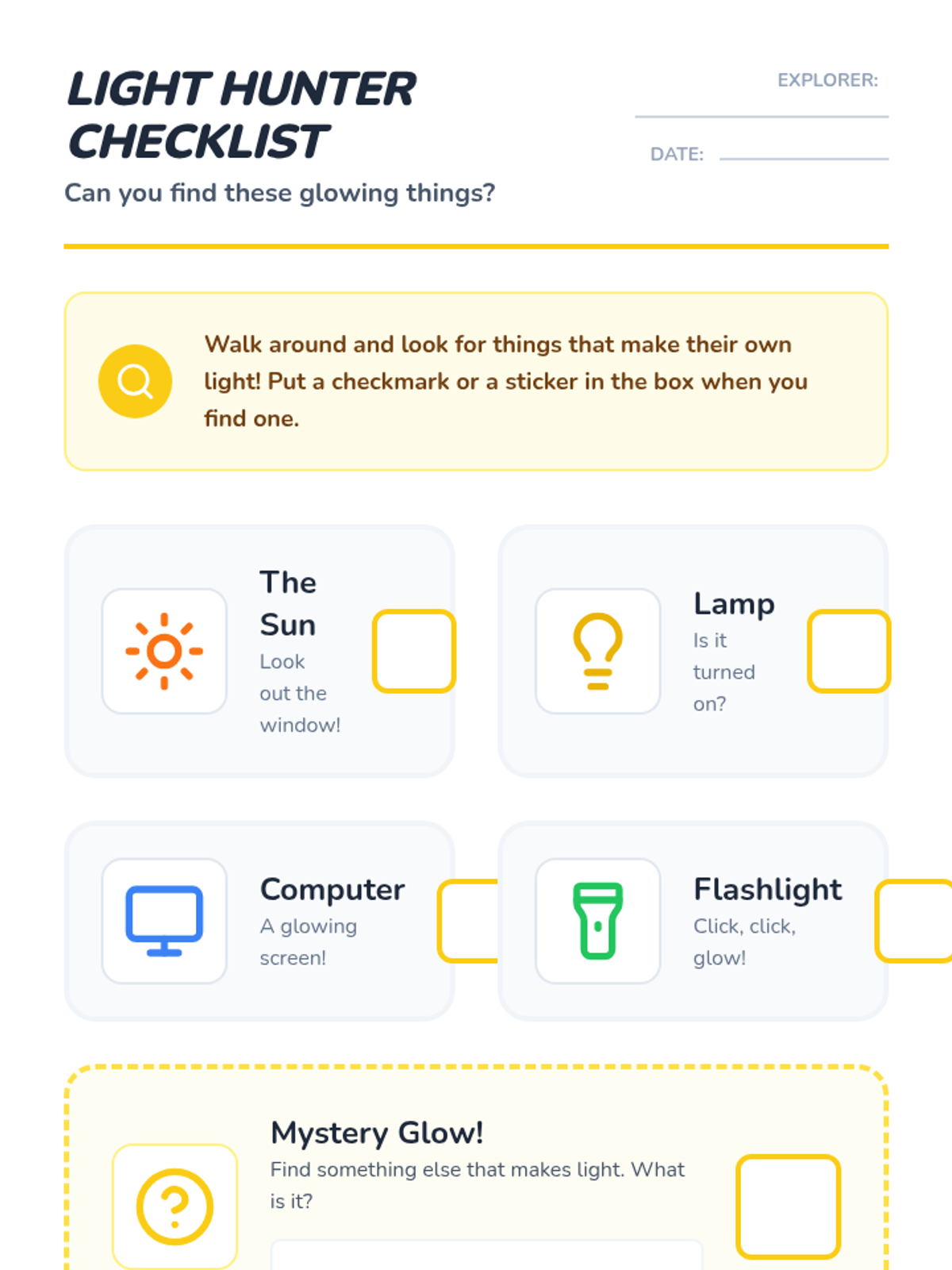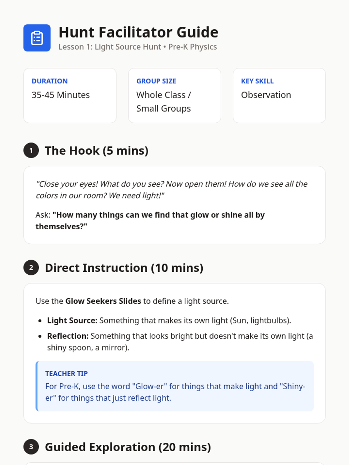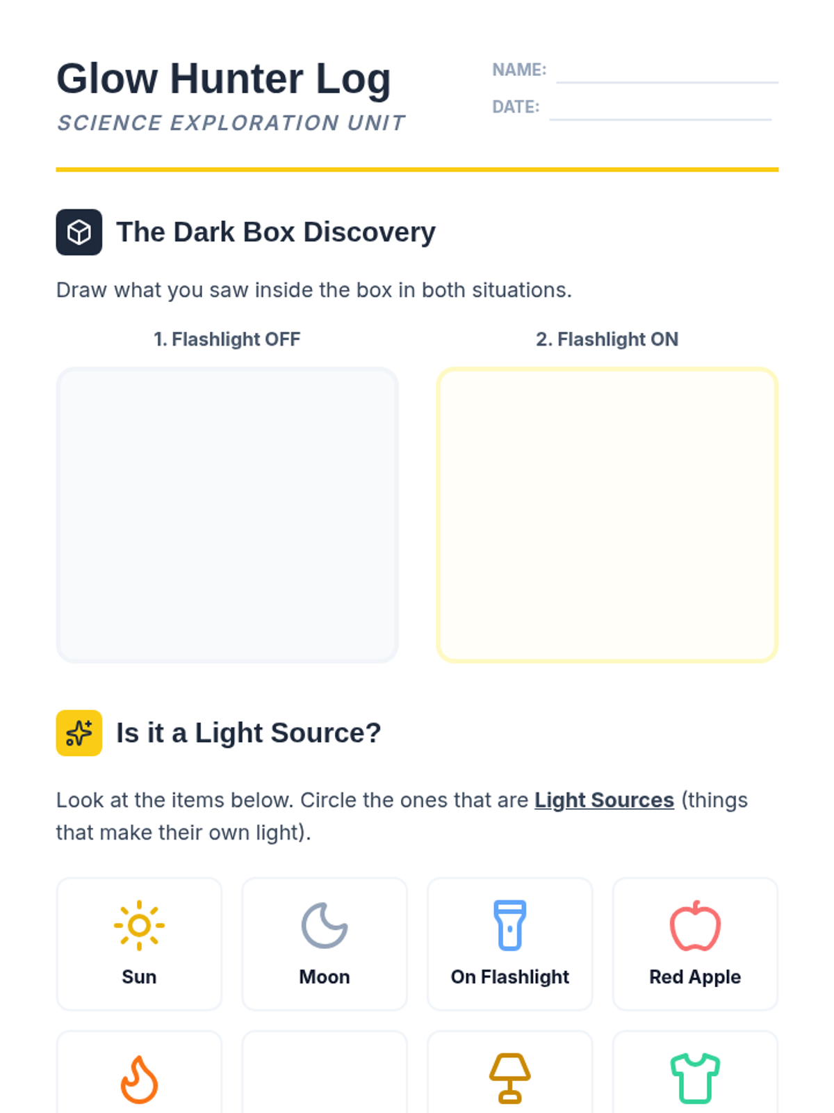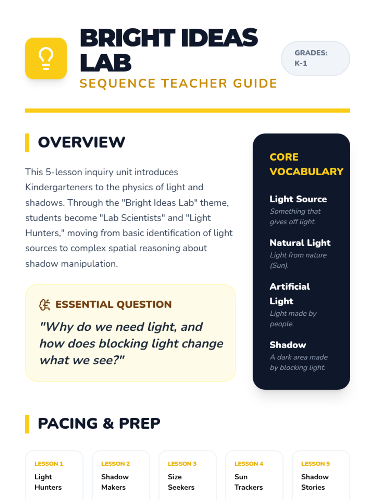 A Pre-K science sequence exploring light sources, natural vs. artificial light, rainbows, color mixing, and sensory light play. Students engage in inquiry-based hunts, sorting activities, and engineering with light tables.