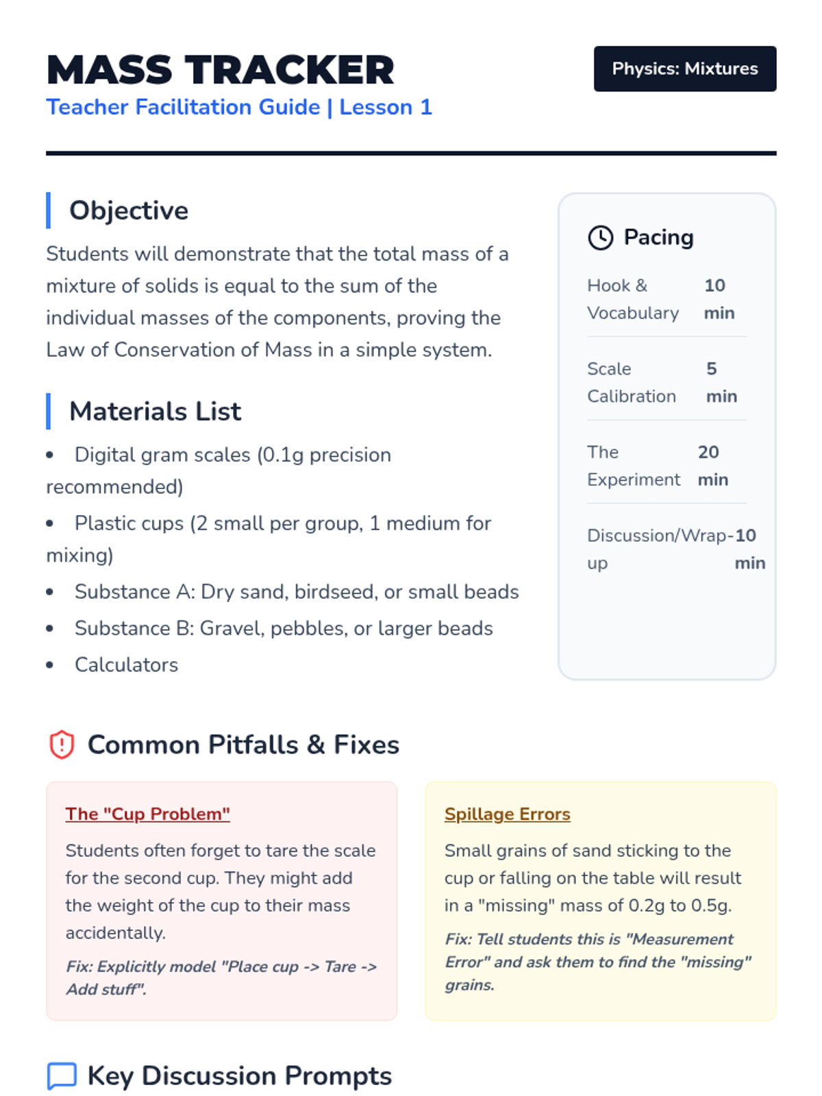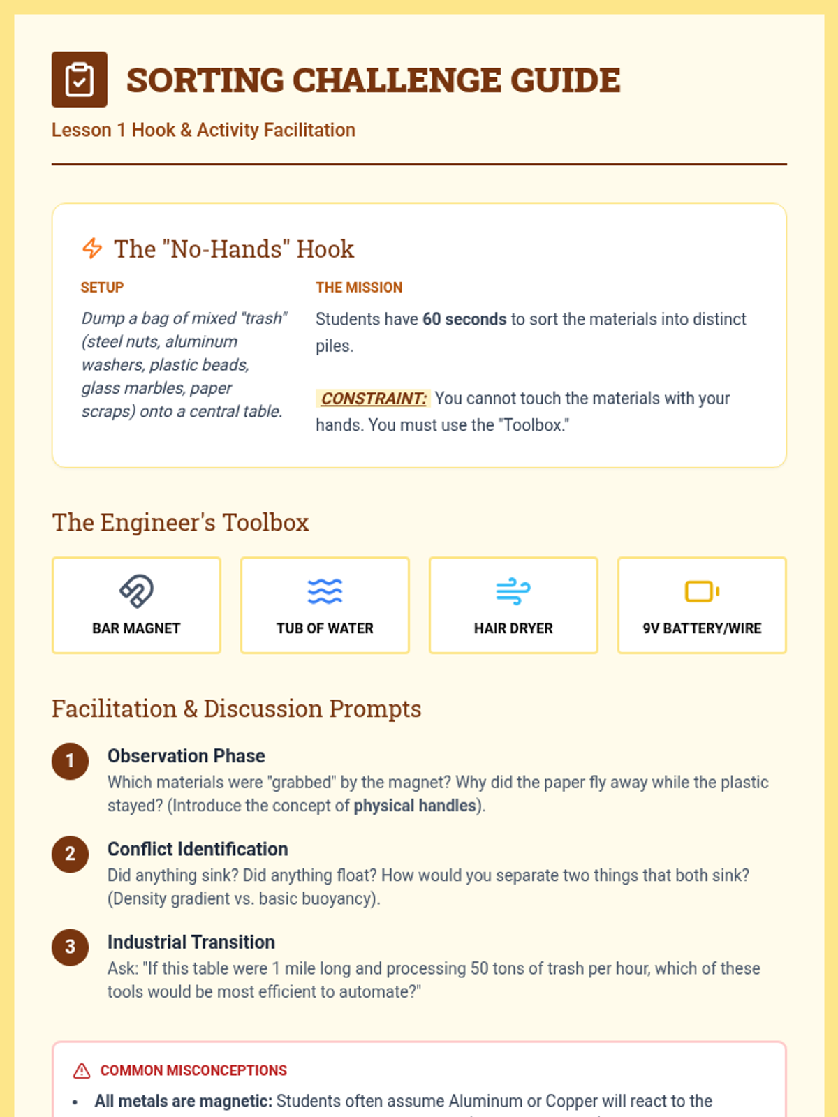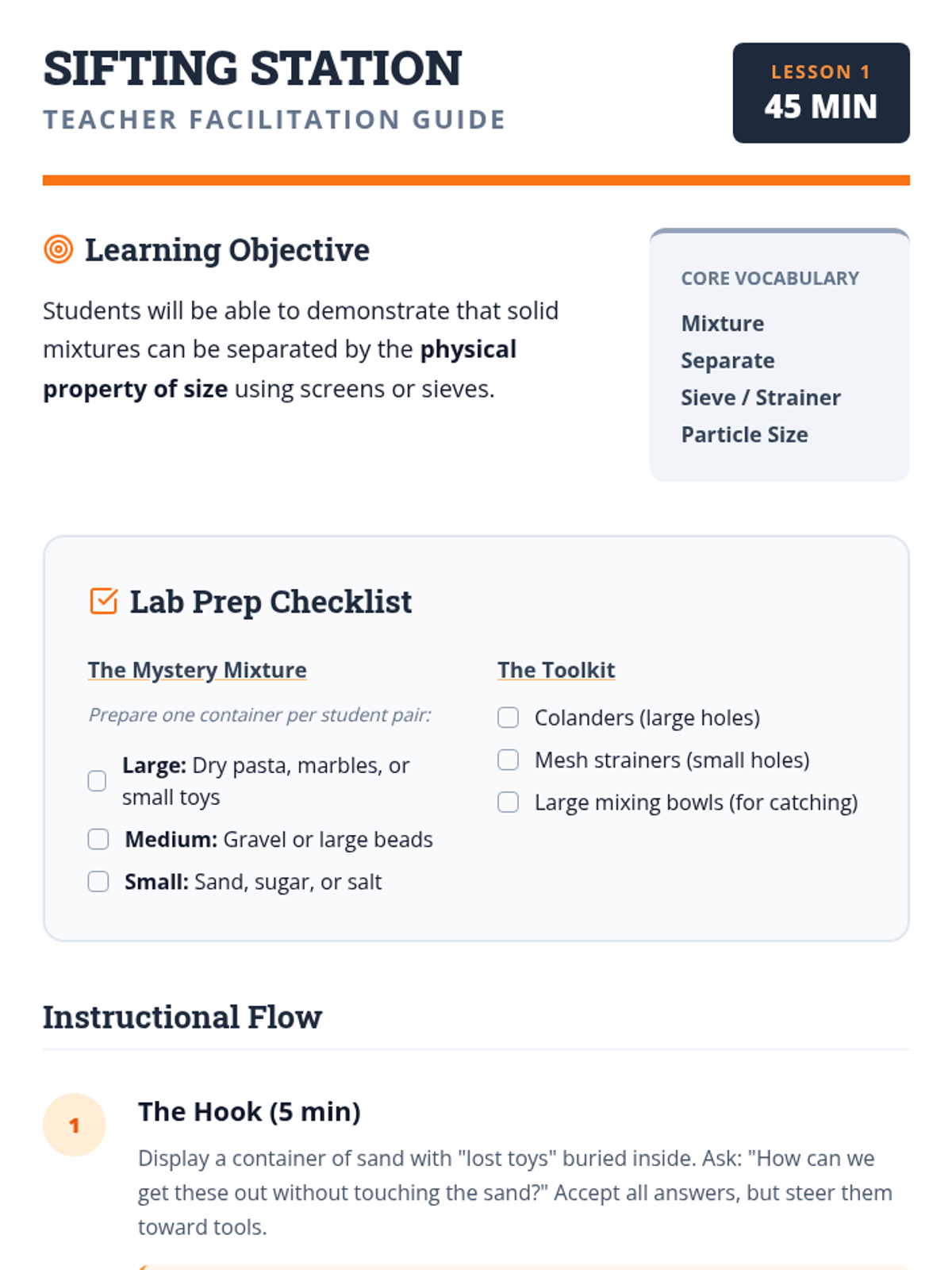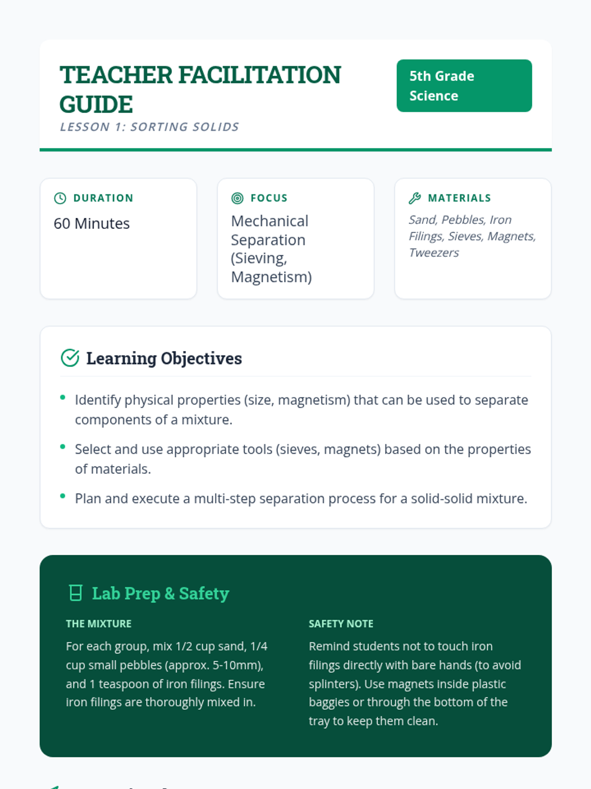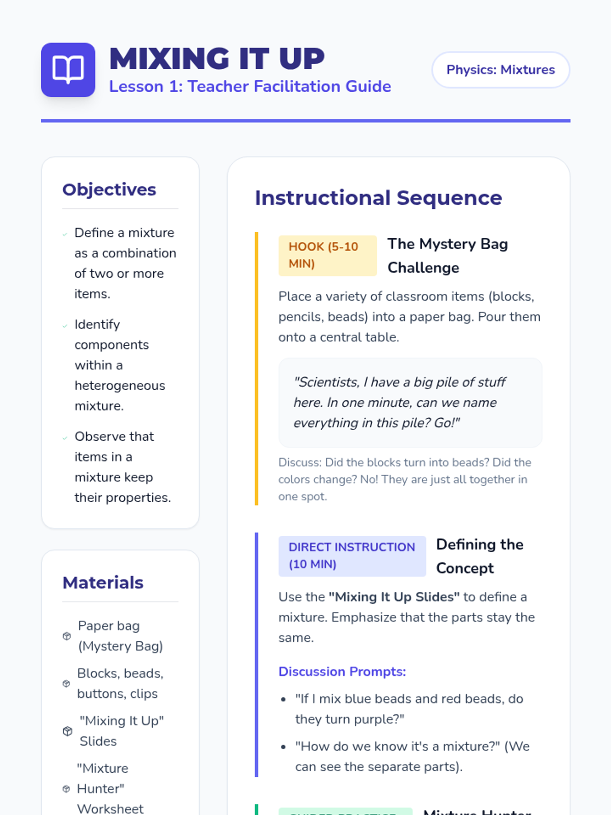A foundational physics sequence for 2nd graders to explore heterogeneous mixtures through hands-on sorting, mixing, and separating activities. Students learn that individual components retain their properties when physically combined and develop strategies to separate them based on size, shape, and magnetism.