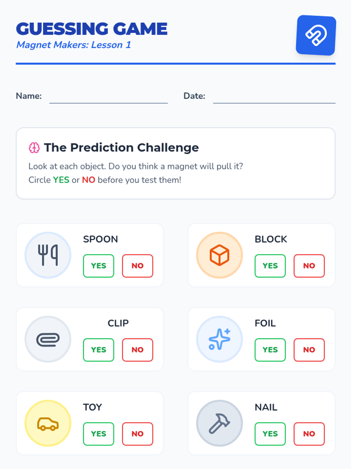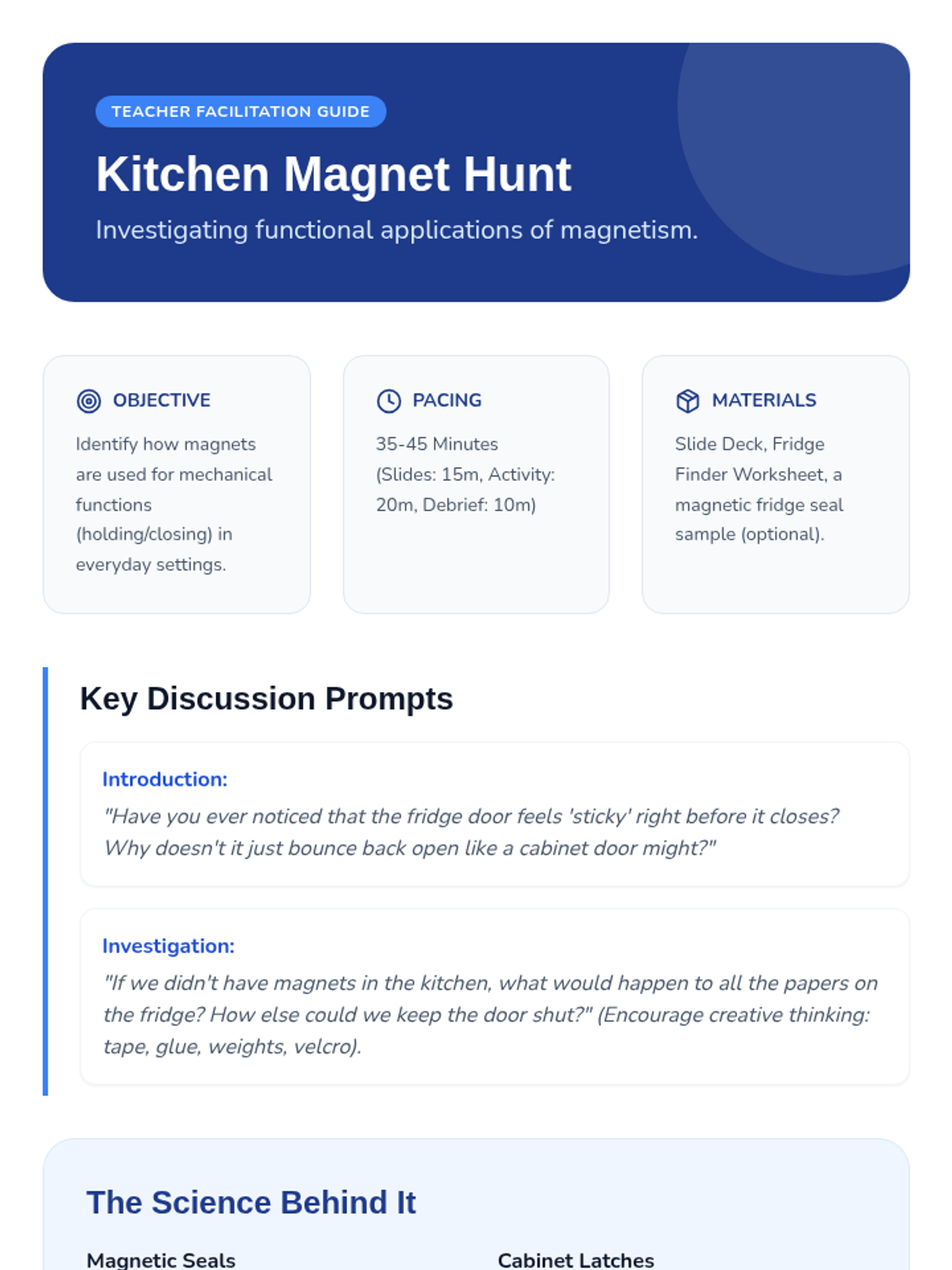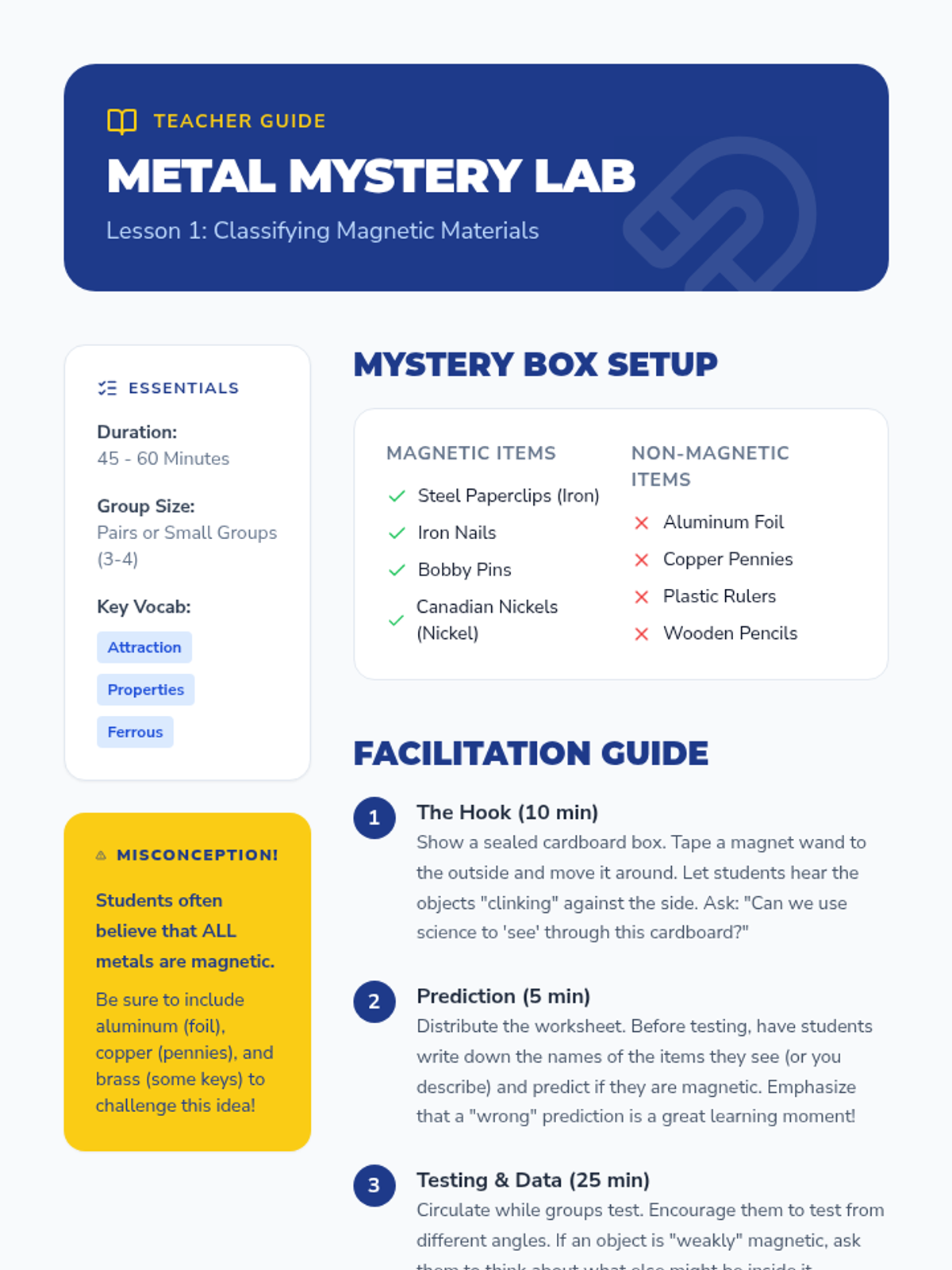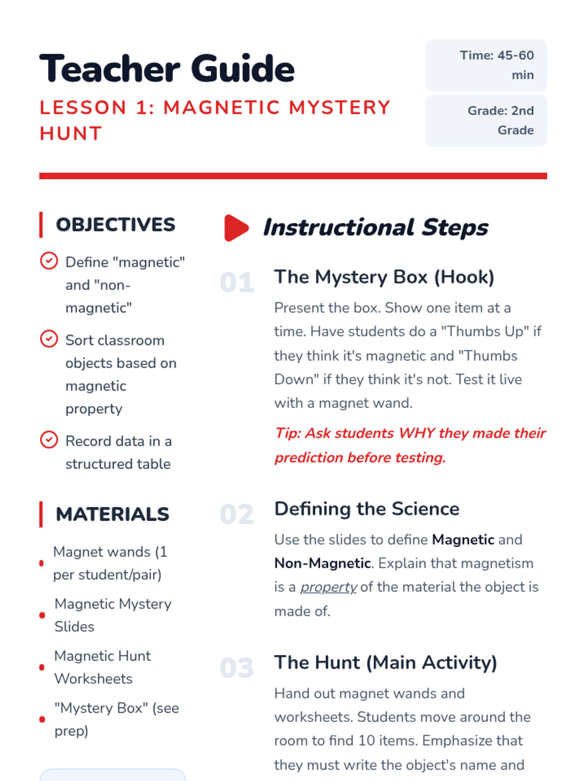 A hands-on exploration of magnetism for 2nd-grade students, focusing on material properties, metal identification, and force through barriers. Students move from basic classification to evidence-based prediction.