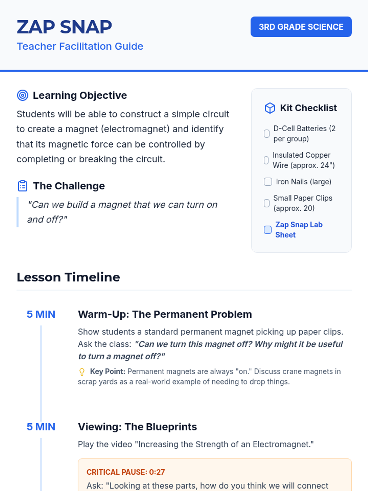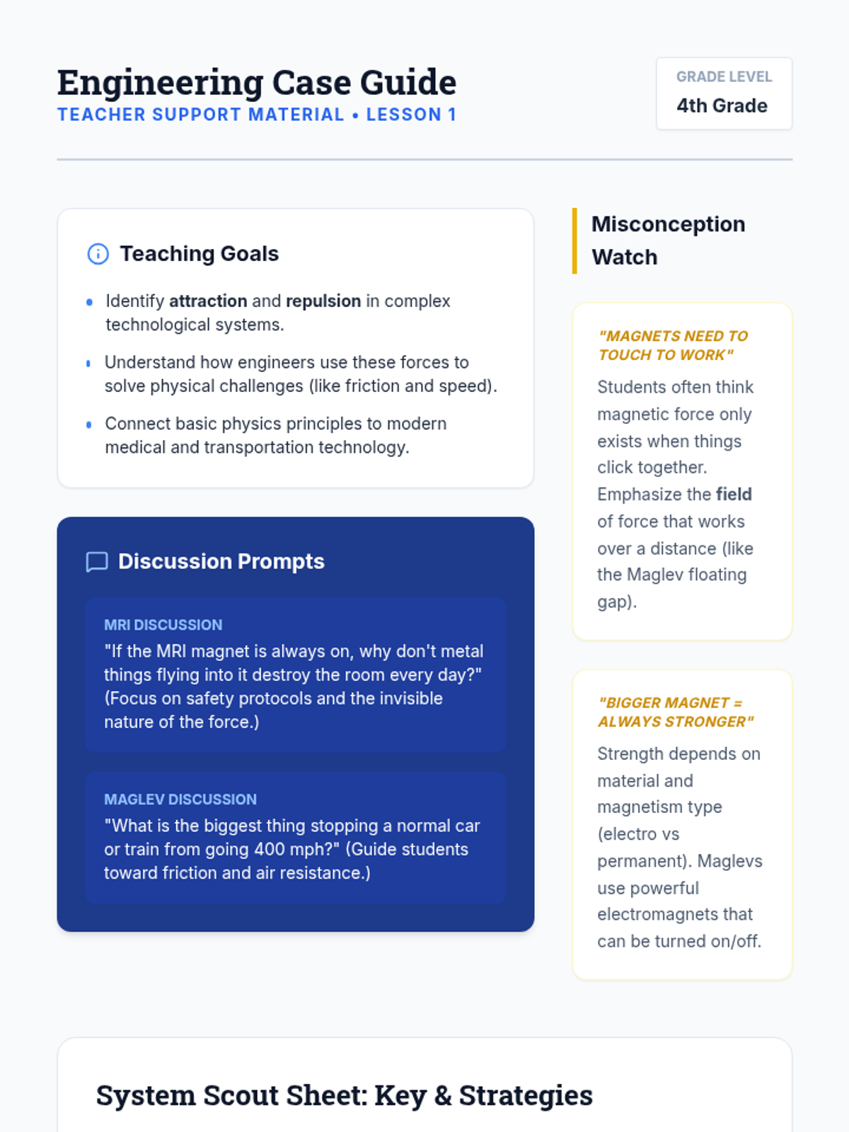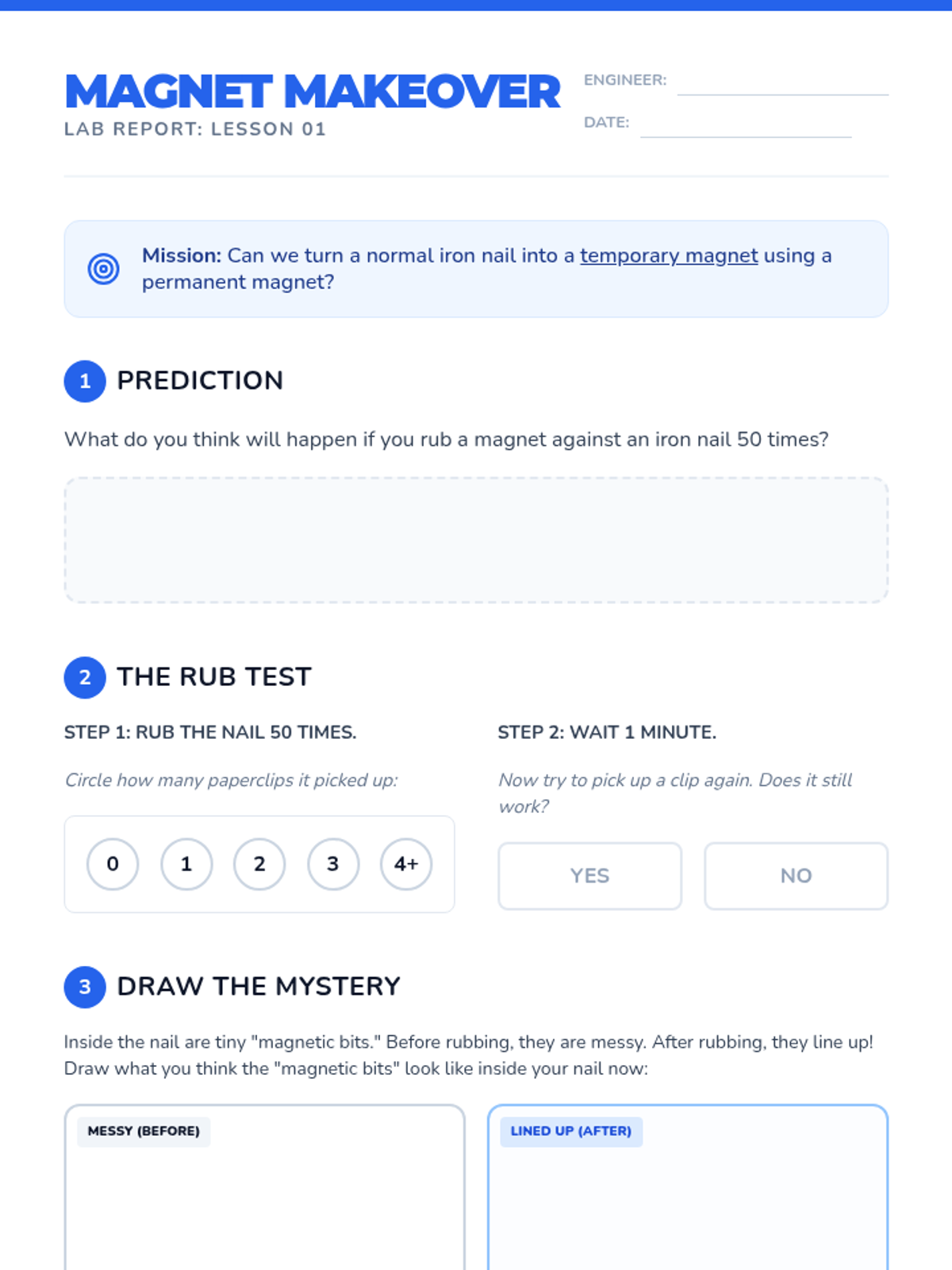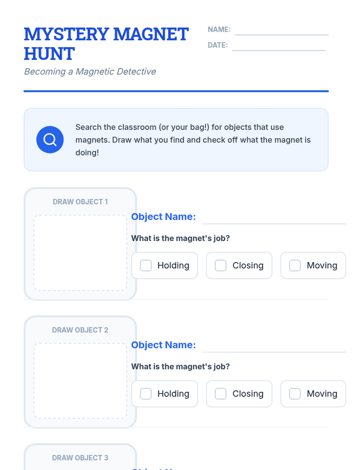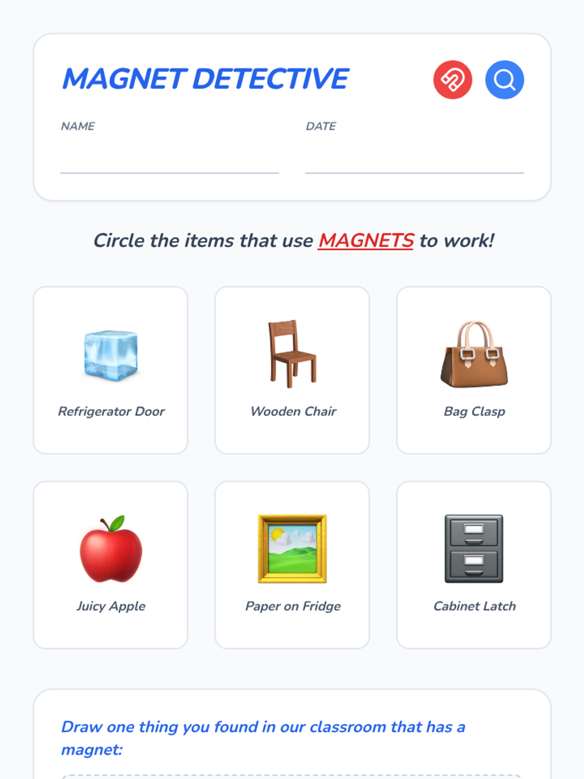 A hands-on exploration of magnetism for 2nd-grade students, focusing on material properties, metal identification, and force through barriers. Students move from basic classification to evidence-based prediction.