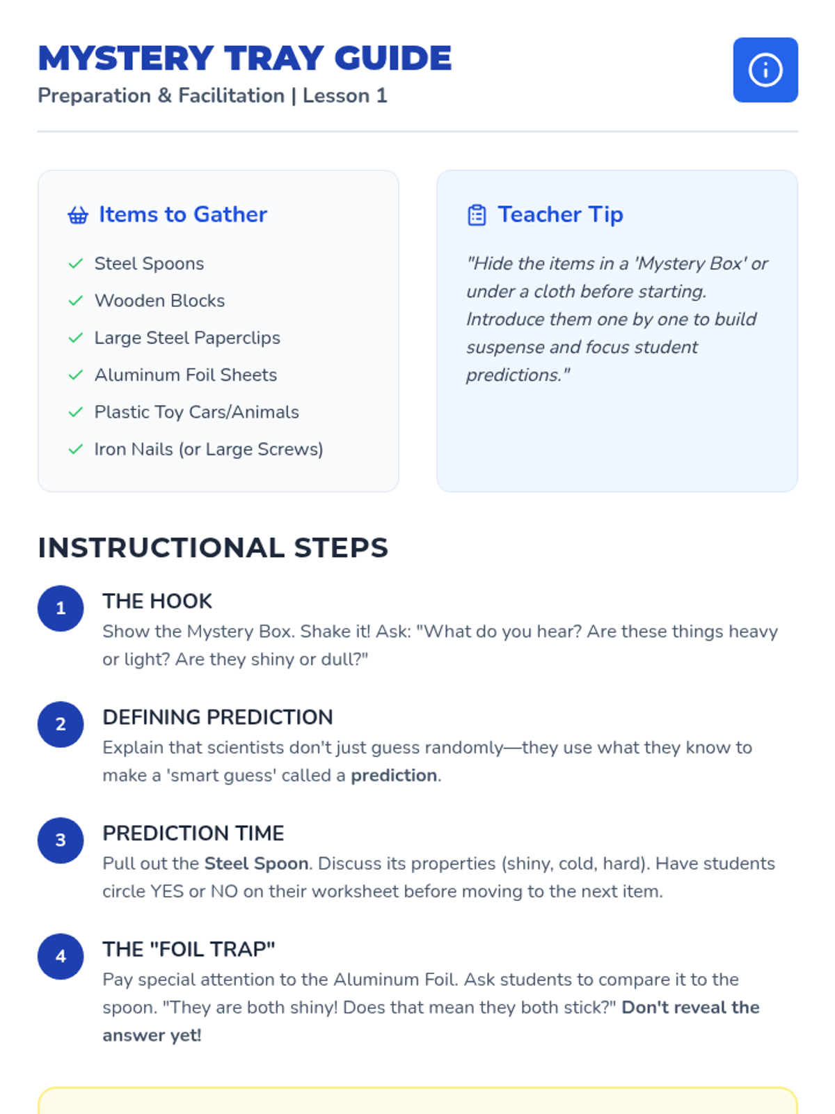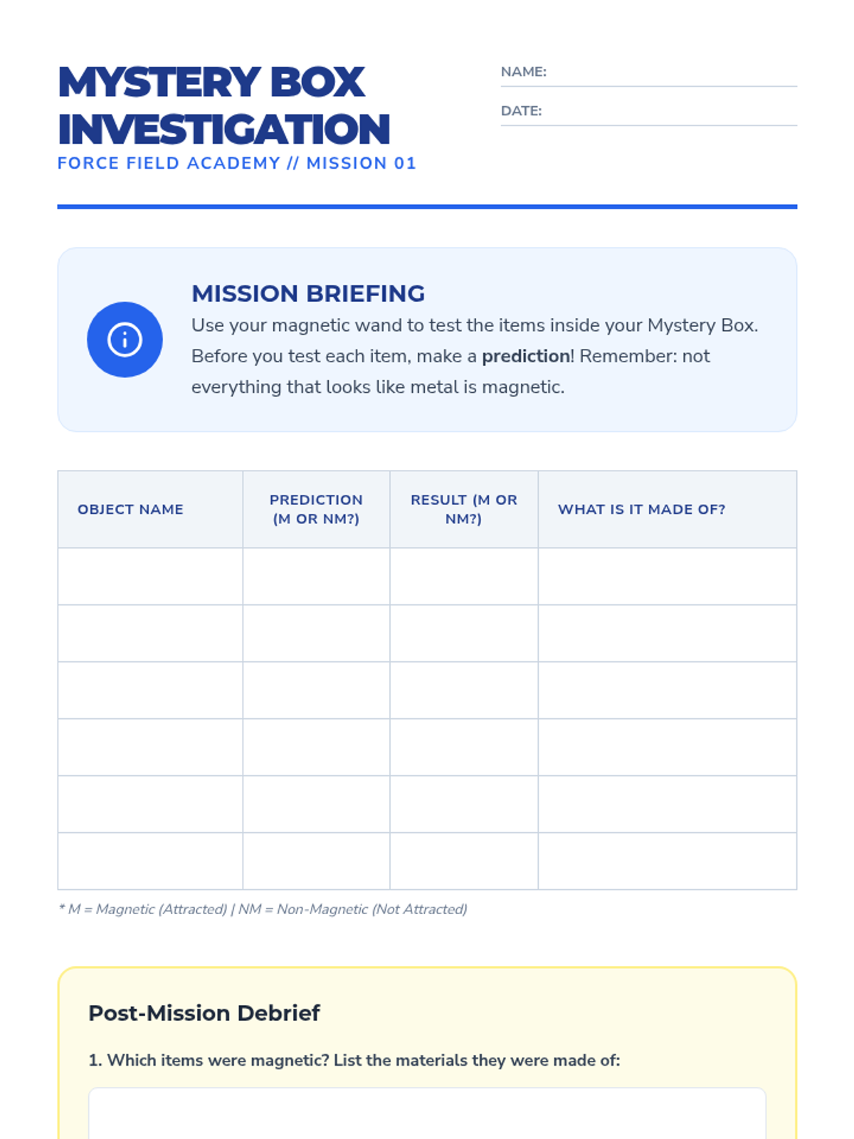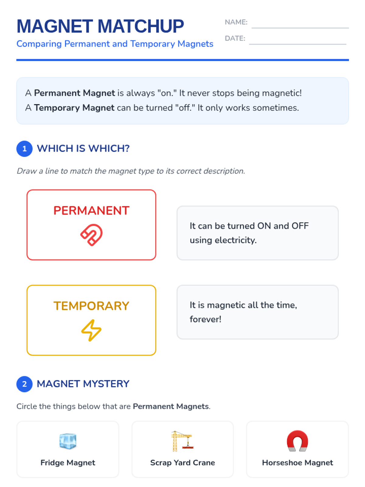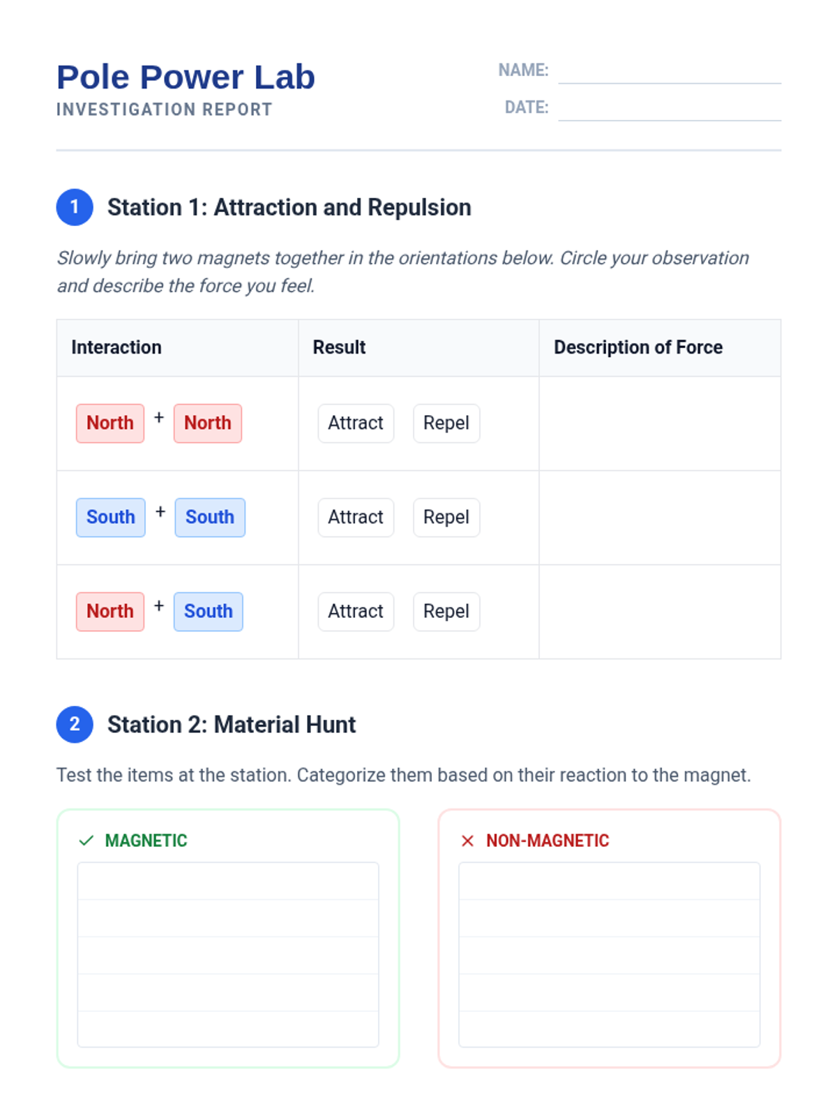 A hands-on exploration of magnetism for 2nd-grade students, focusing on material properties, metal identification, and force through barriers. Students move from basic classification to evidence-based prediction.