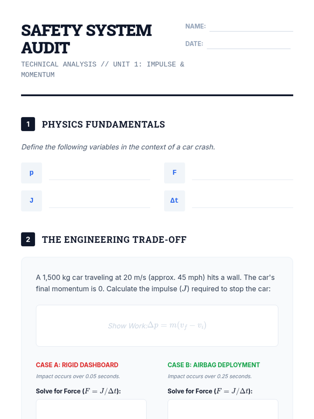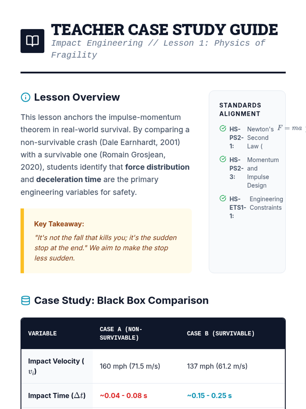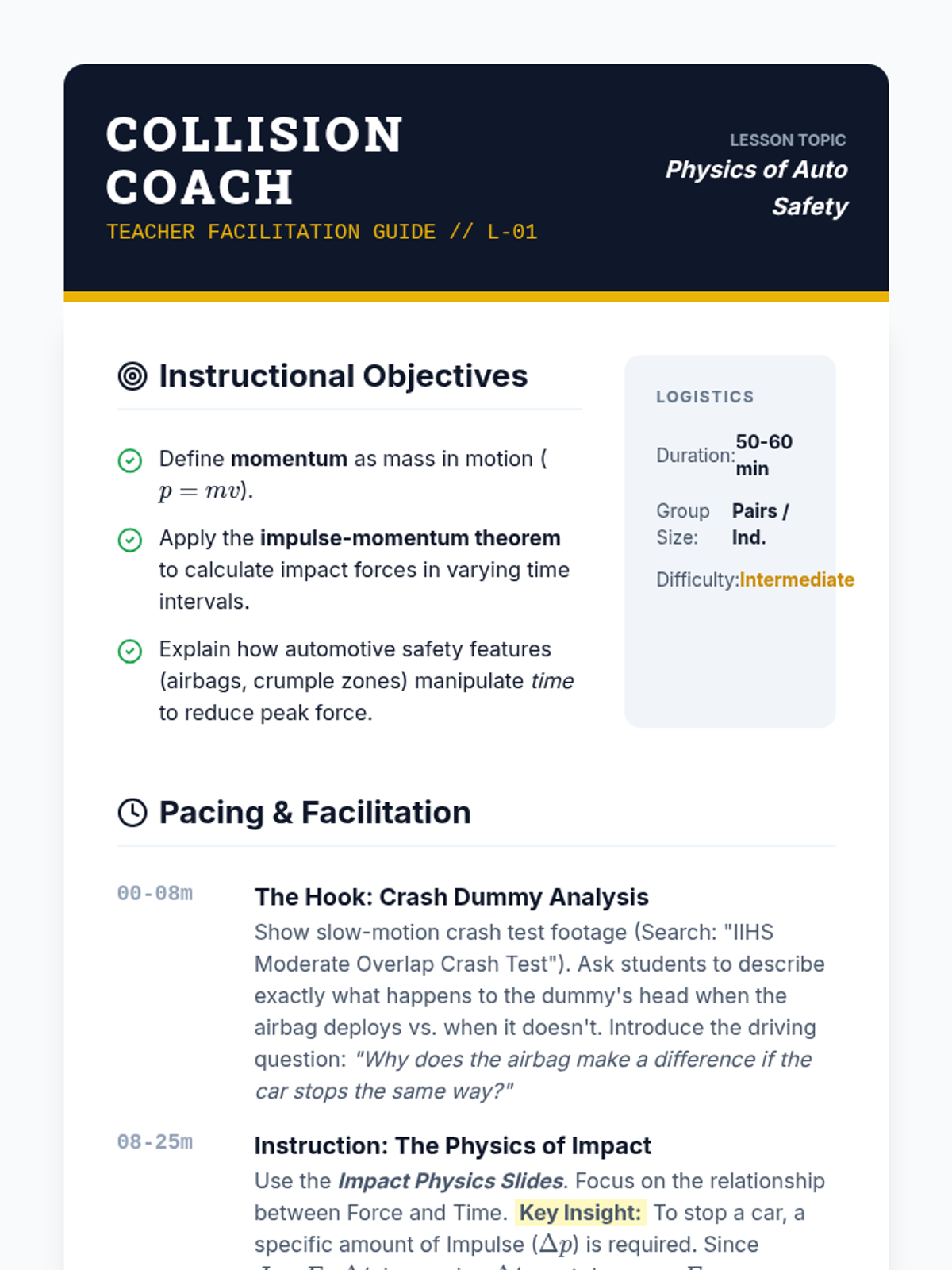 A project-based physics unit where students apply the impulse-momentum theorem to automotive safety design. Students investigate how increasing collision time reduces impact force, culminating in an engineering challenge to protect a fragile payload.