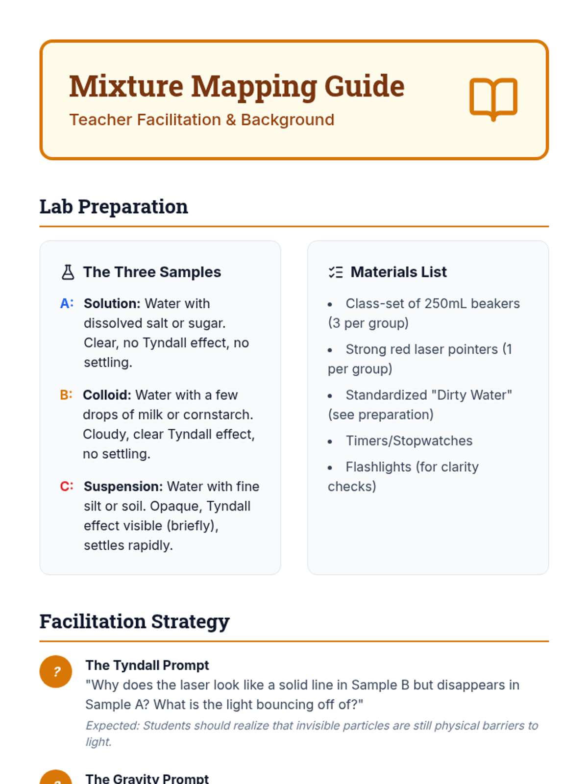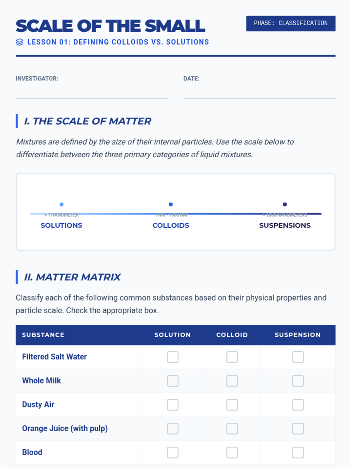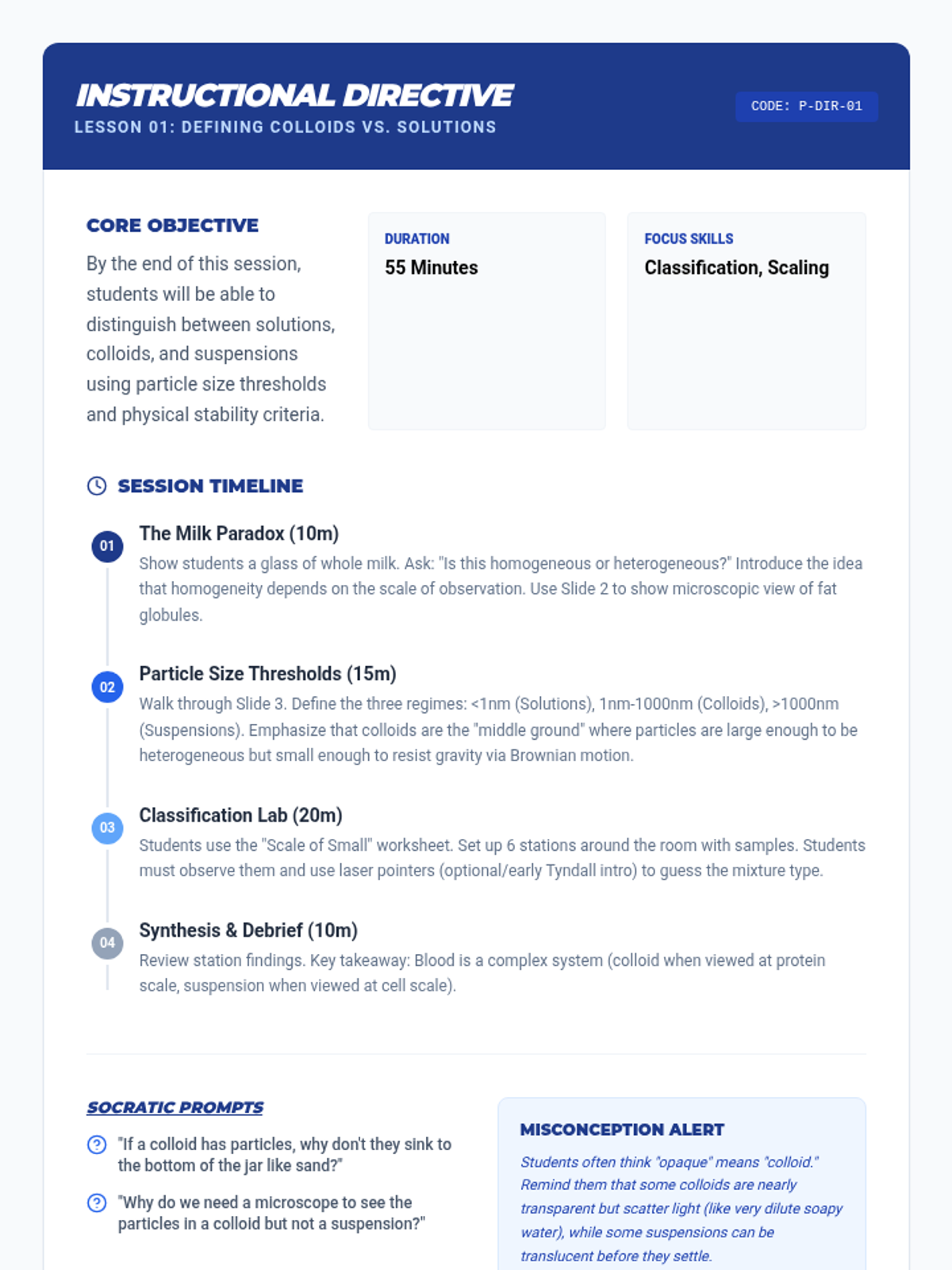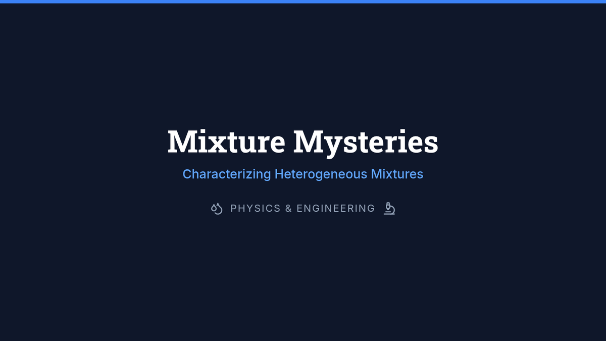 This sequence explores the physics of colloids, suspensions, and heterogeneous systems. Students investigate particle size scales, light scattering (Tyndall effect), fluid dynamics (Stokes' Law), and surface tension to understand how complex mixtures behave and how to engineer stable consumer products.