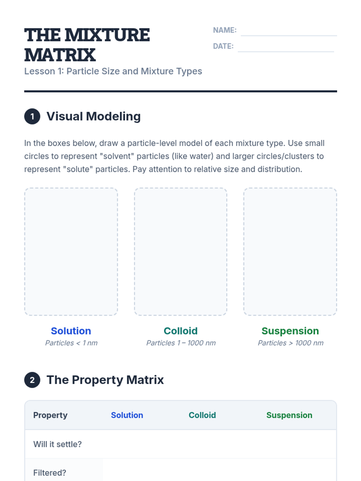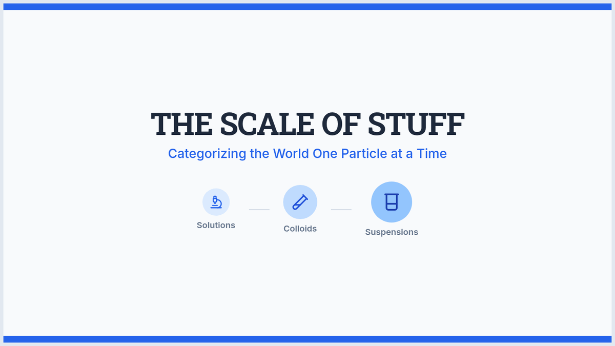 A 9th-grade physics sequence exploring the distinct properties of solutions, colloids, and suspensions based on particle size, stability, and light interaction.