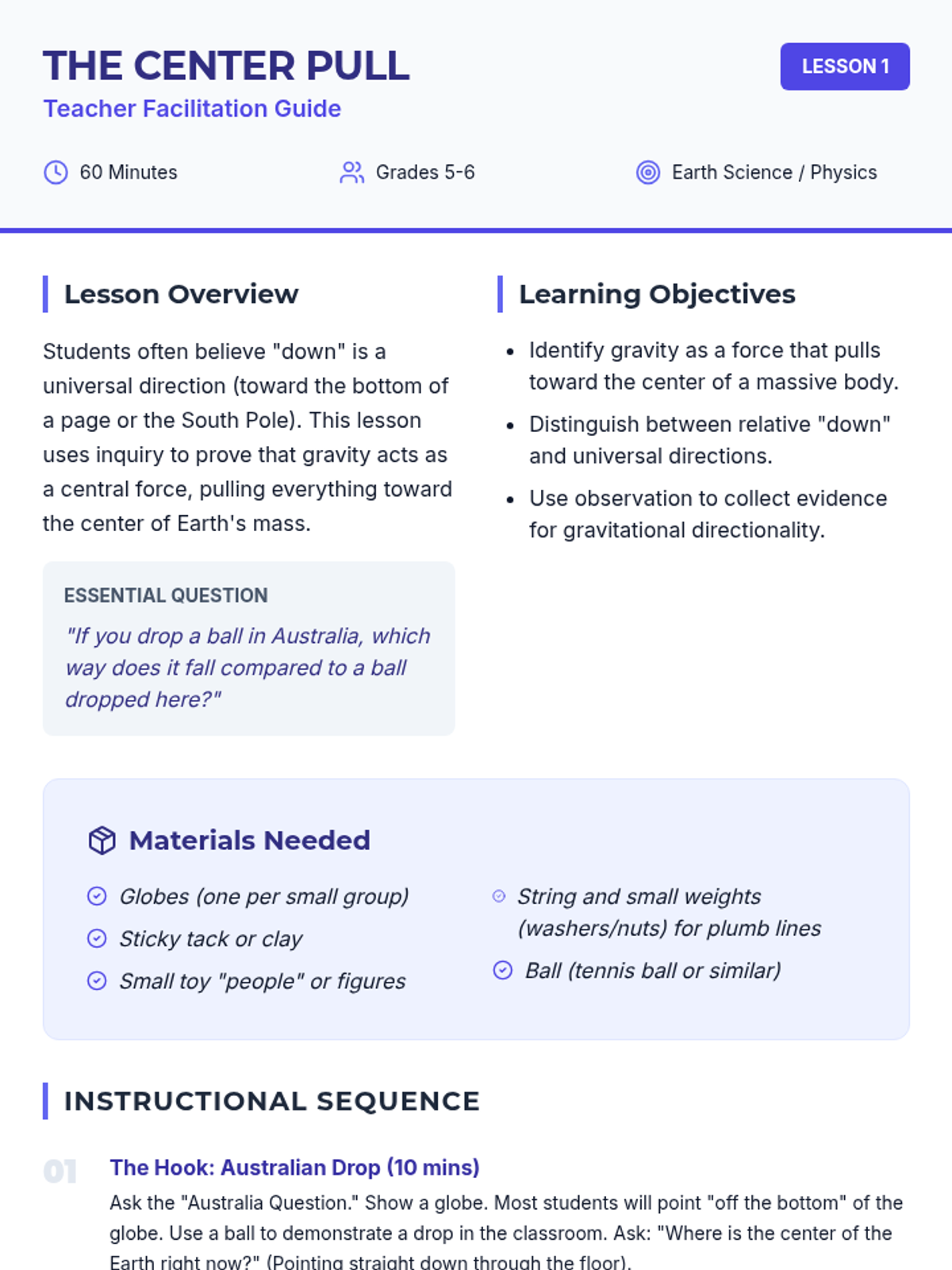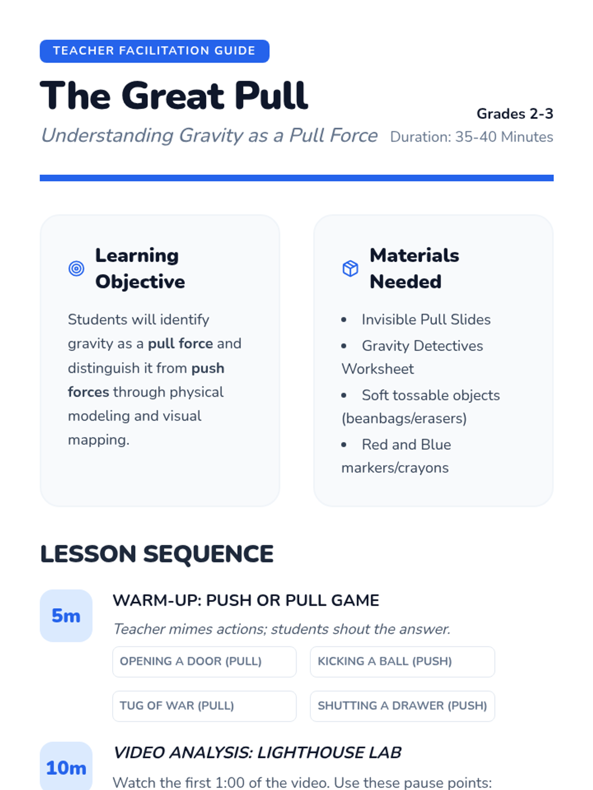A comprehensive lesson sequence exploring gravity as an invisible pull force, featuring hands-on experiments, video analysis, and historical context.