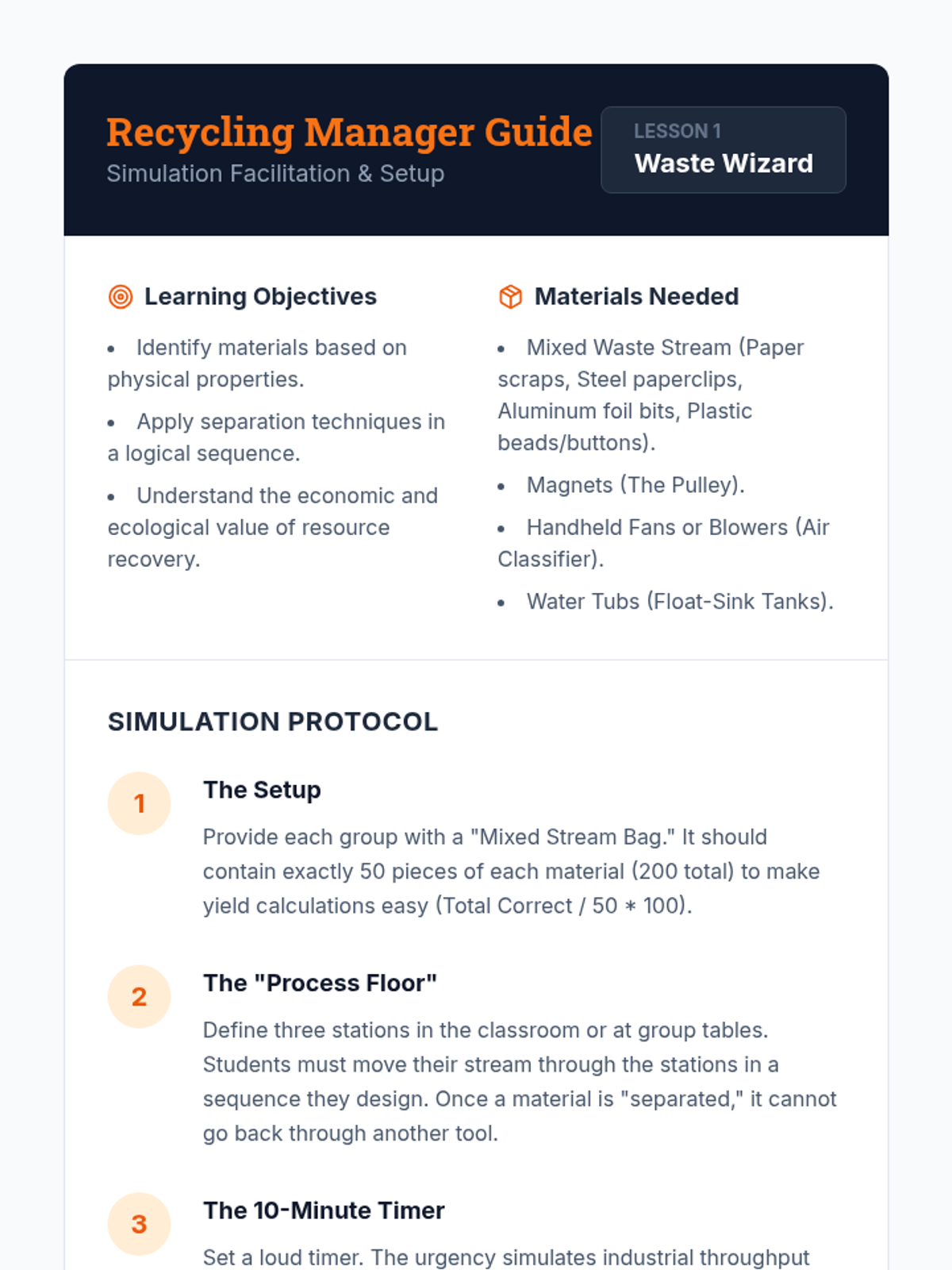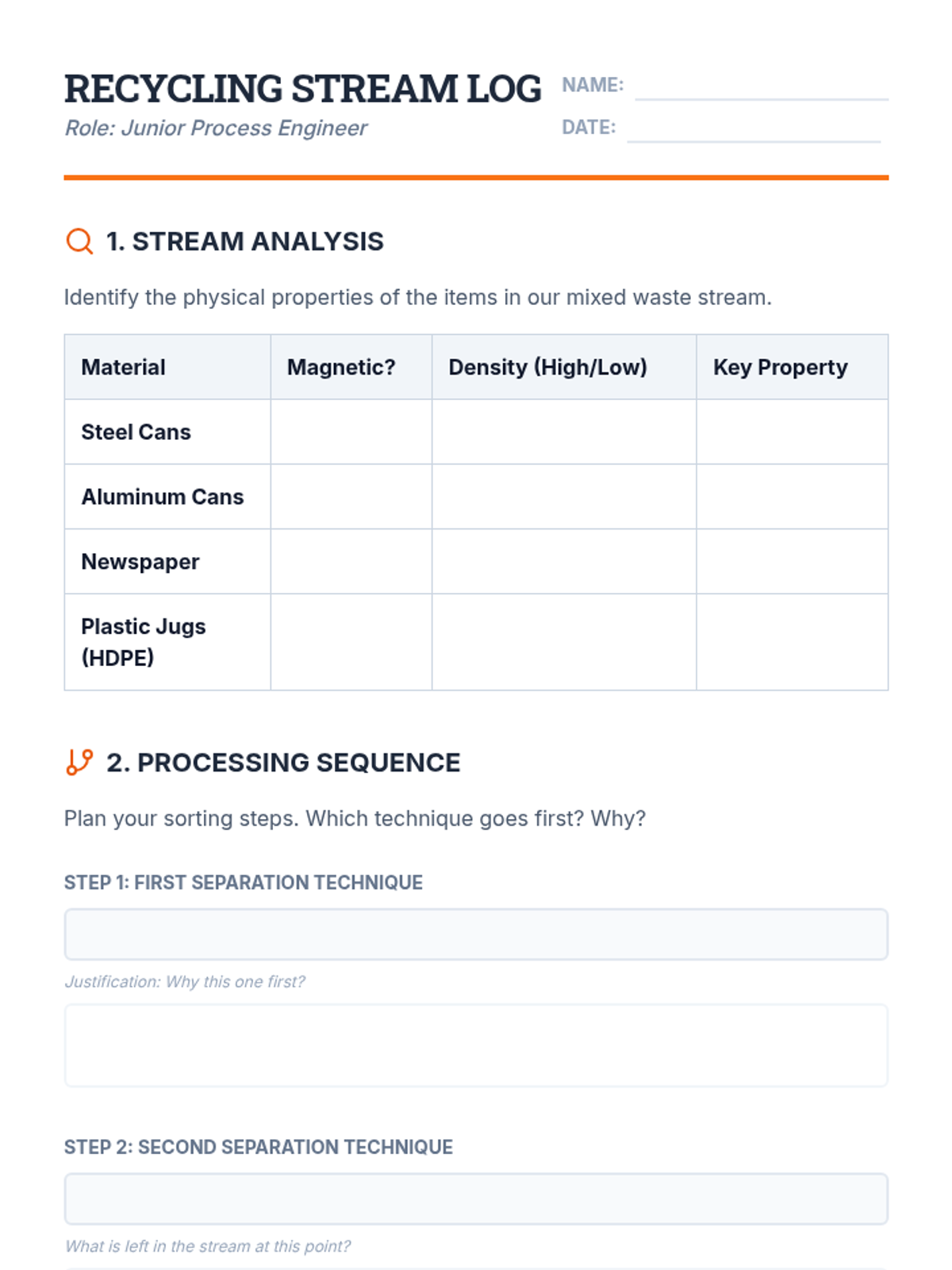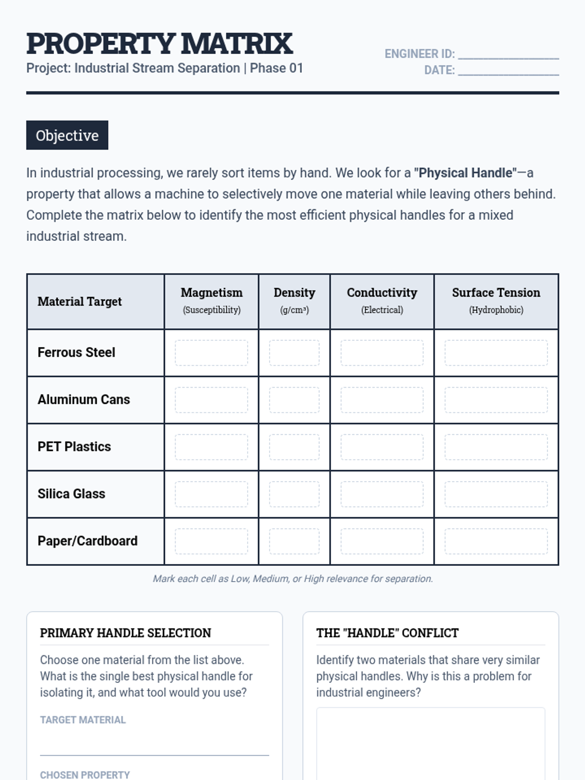 An industrial engineering-focused sequence for 11th-grade physics investigating how physical properties (density, magnetism, conductivity) dictate large-scale separation methods in recycling, mining, and environmental cleanup. Students analyze the physics of centrifuges, eddy currents, and the economic trade-offs of engineering design.