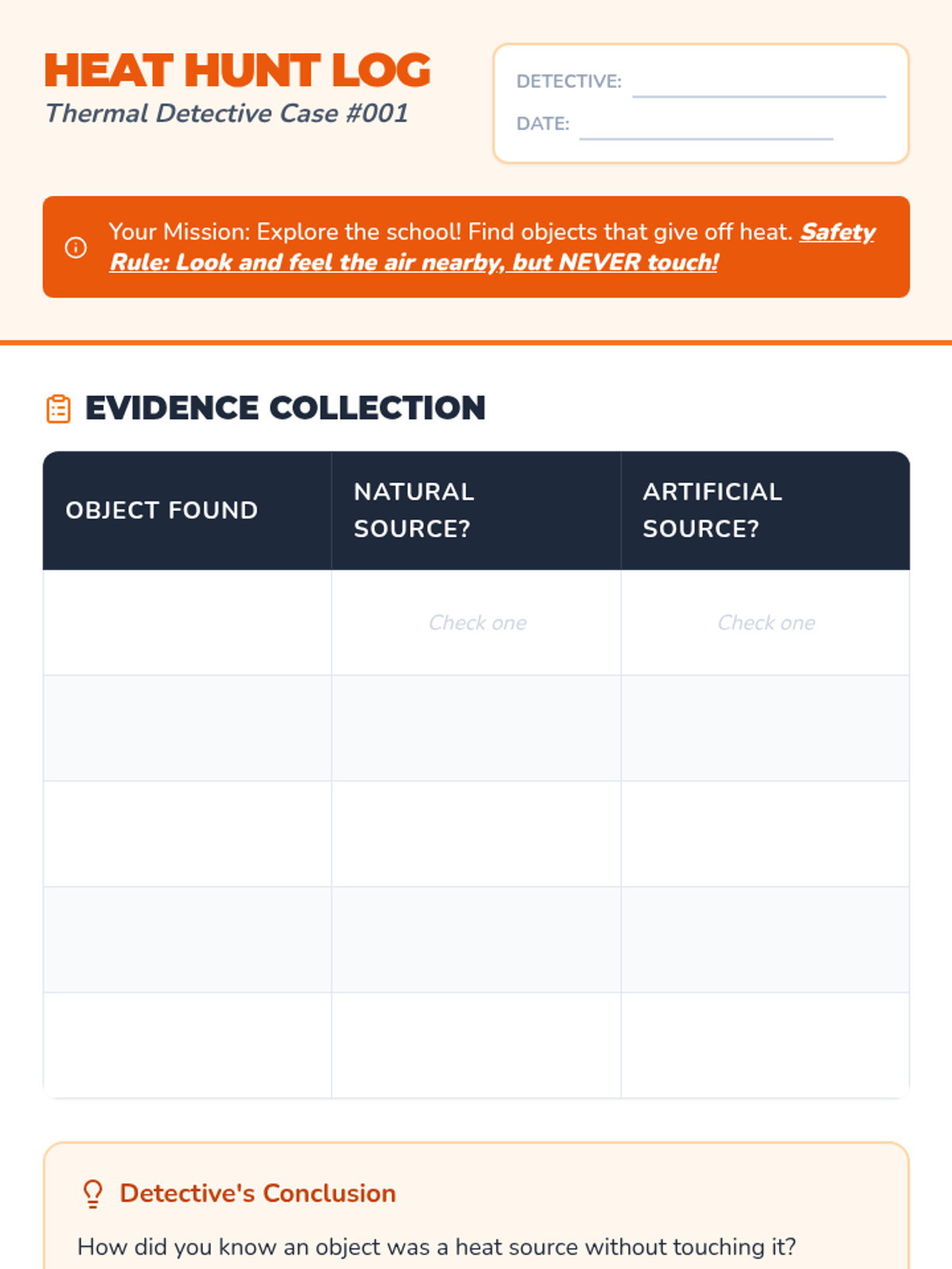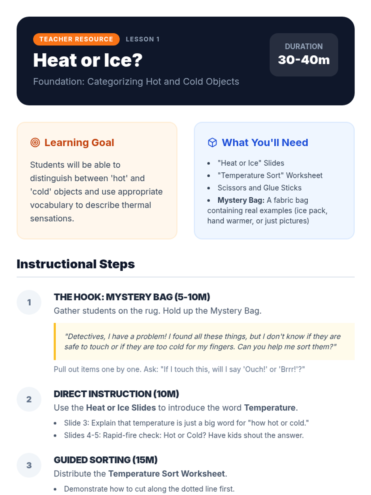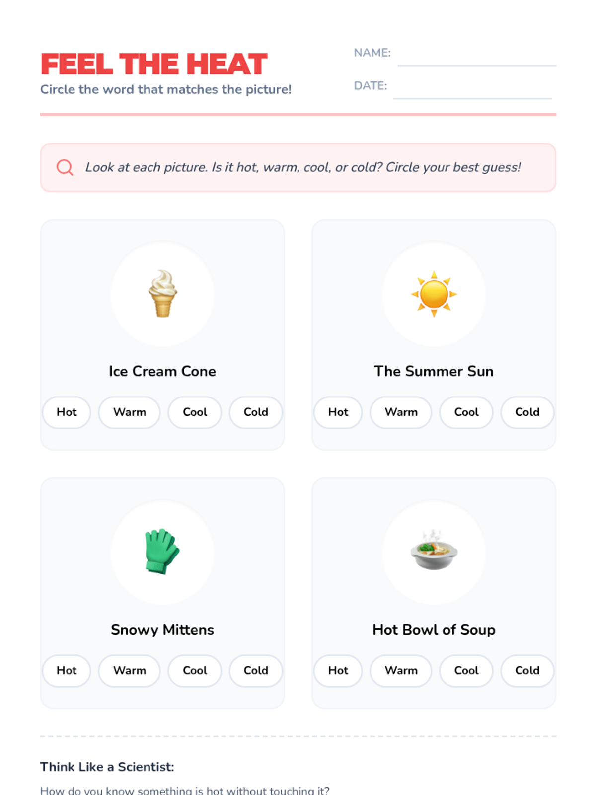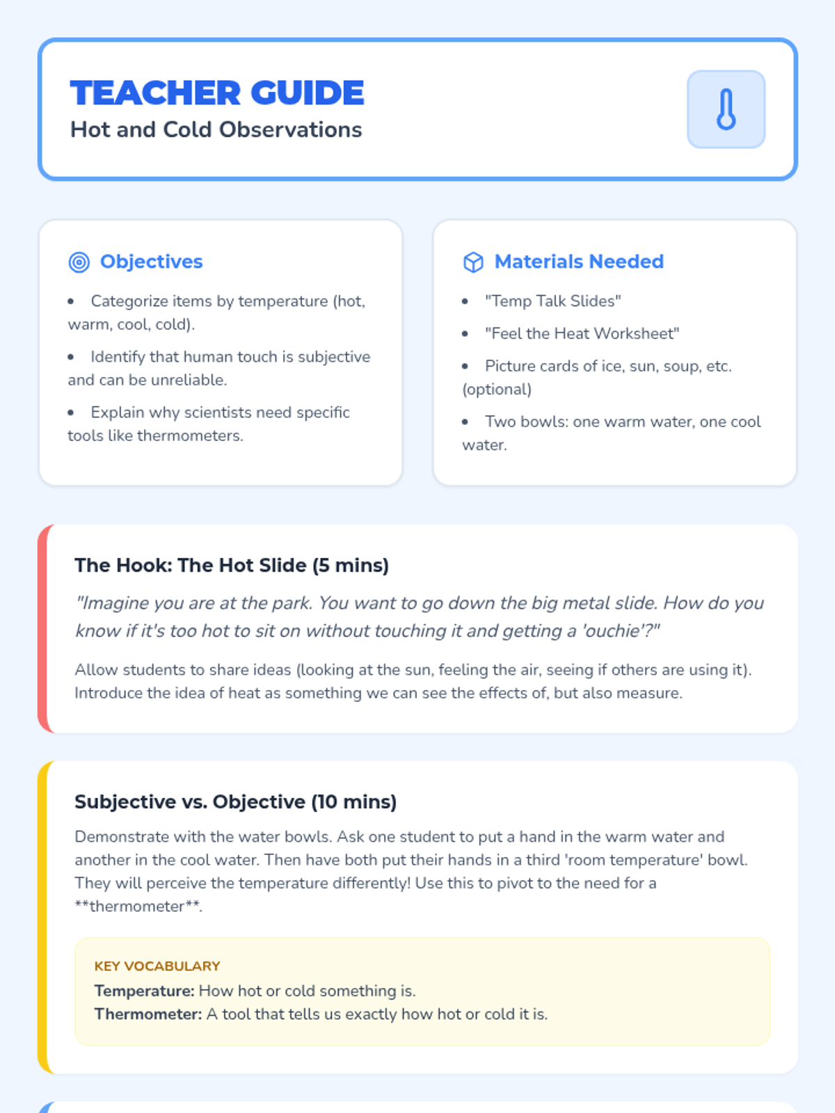 A Kindergarten sequence focused on temperature vocabulary, sensing differences, using thermometers, and identifying heat sources safely. Students transition from sensory observation to scientific measurement.