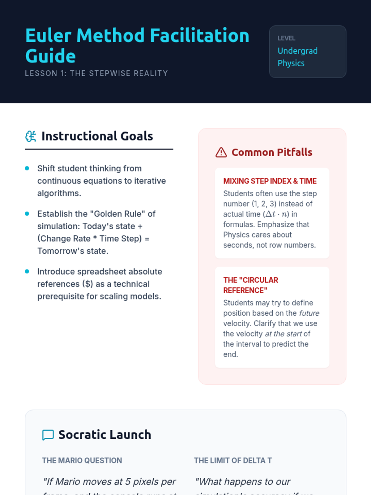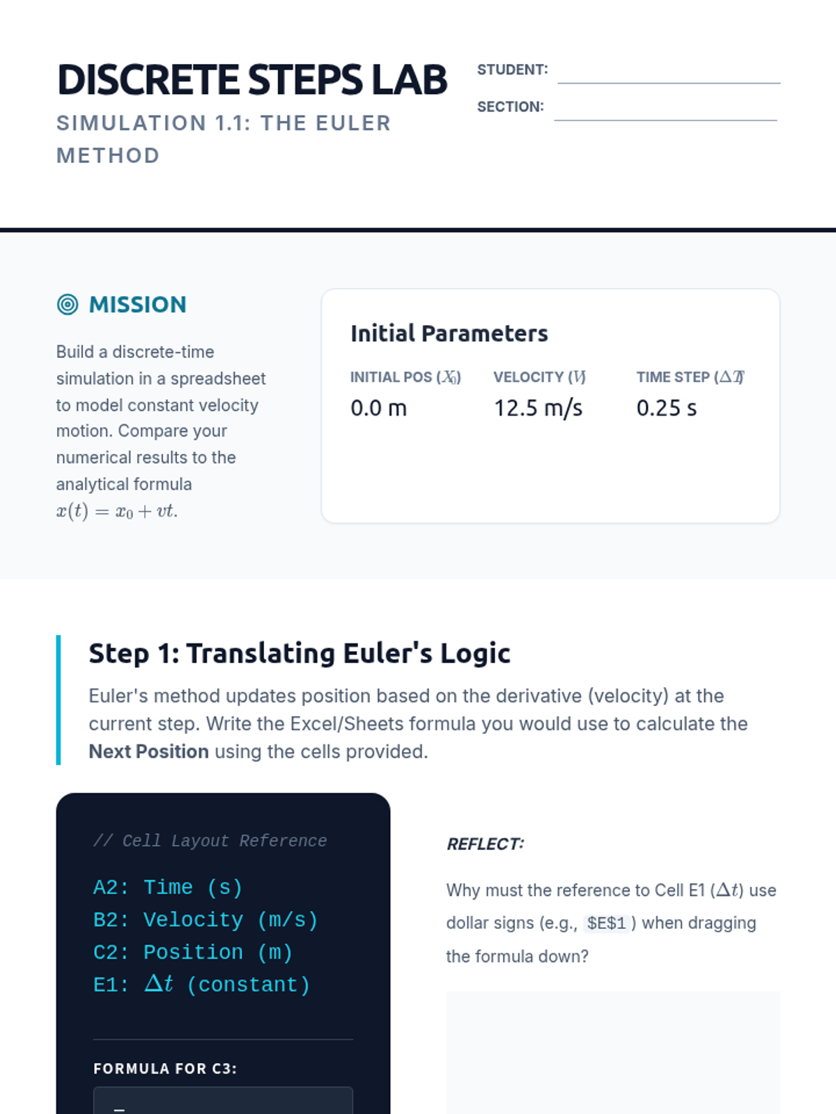 This undergraduate sequence introduces students to computational physics by using coding and spreadsheet modeling to simulate 1D motion. Students move from simple discretization (Euler's method) to complex scenarios like collisions and non-uniform acceleration, bridging the gap between analytical theory and modern engineering practice.