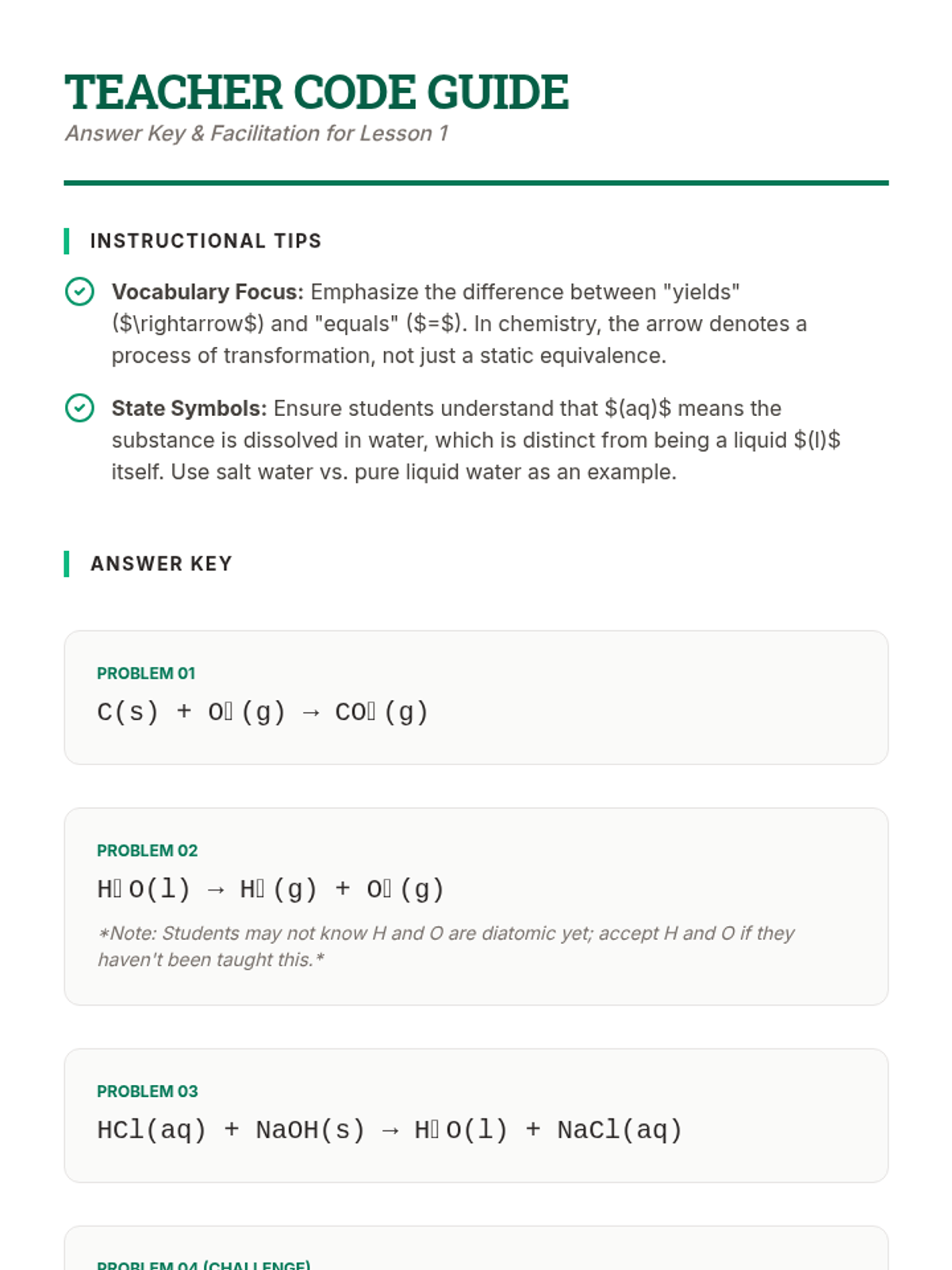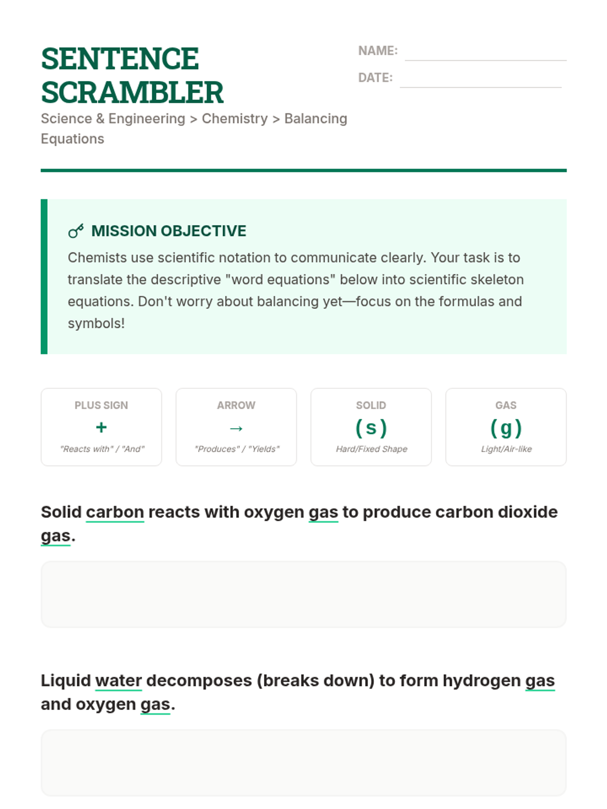 This sequence connects the skill of balancing equations to real-world chemical phenomena, emphasizing that equations represent actual physical events. Students explore decoding word equations into formulas, investigate photosynthesis and combustion, and culminate in a creative storyboard project.
