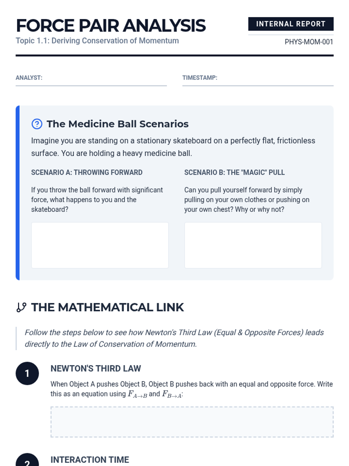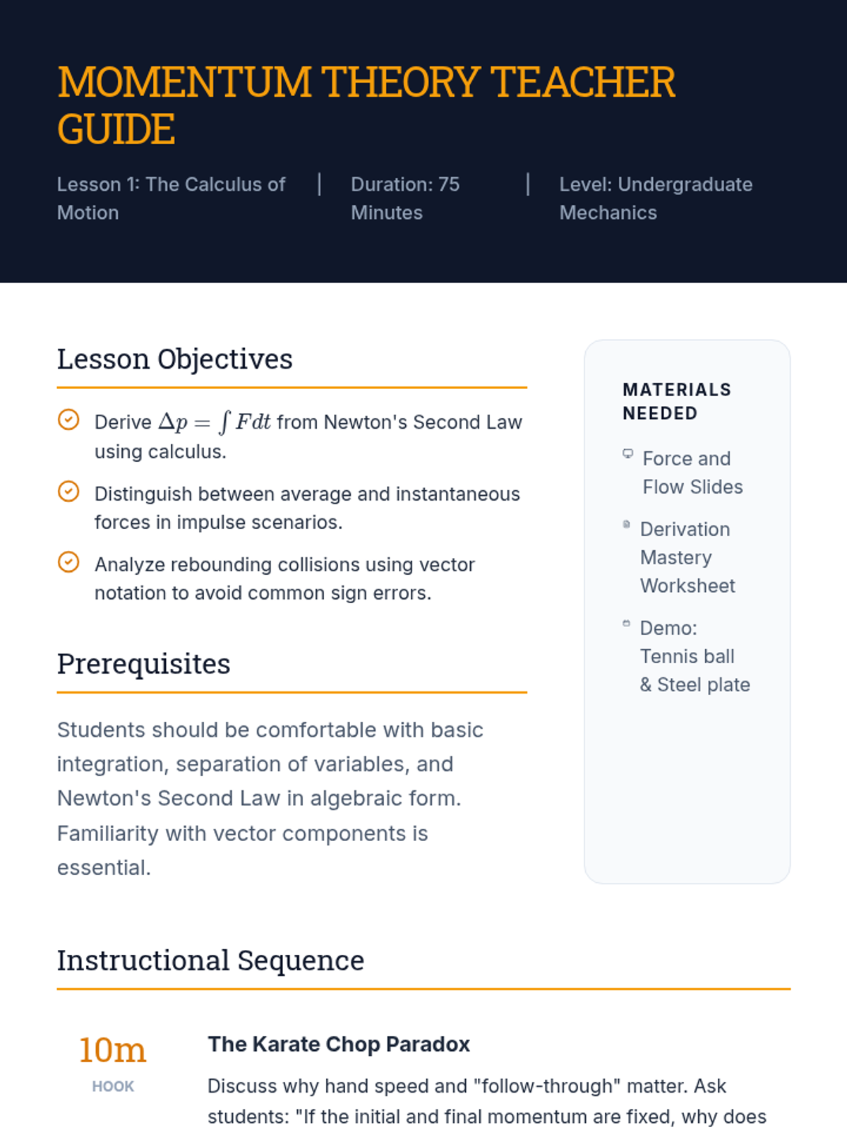 This calculus-based physics sequence explores the fundamental relationship between force, time, and momentum change. Students will derive the impulse-momentum theorem, use integration to analyze variable forces, and apply these concepts to biomechanical impact scenarios.