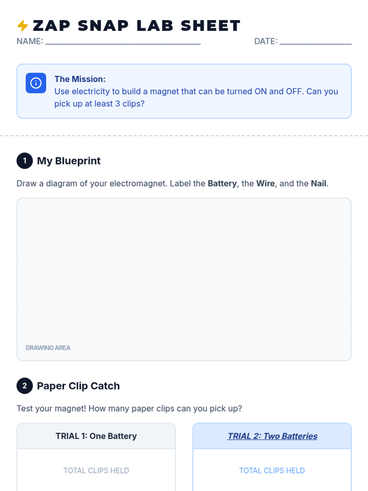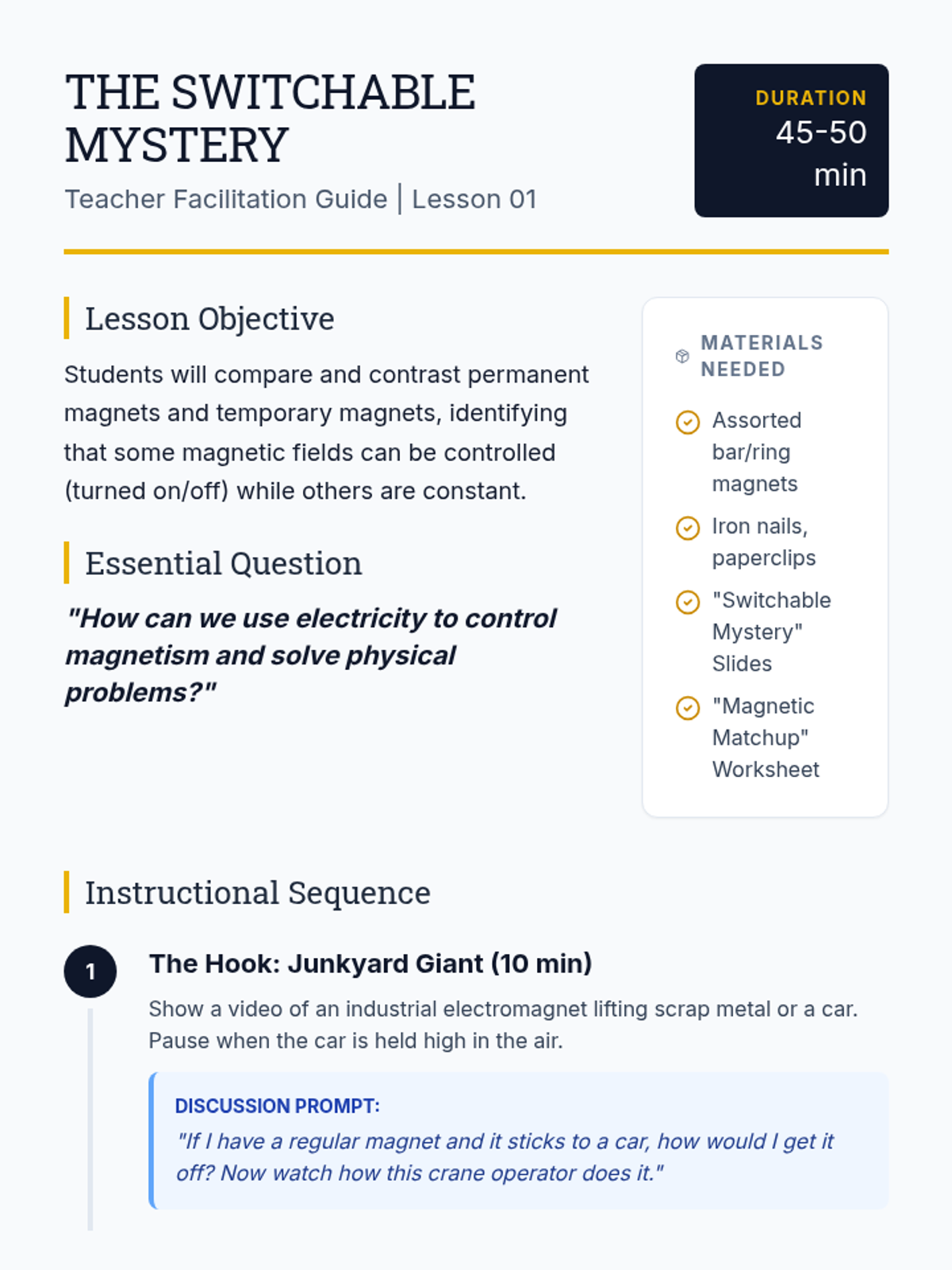 This sequence bridges the gap between electricity and magnetism by introducing simple electromagnets. Students discover that electricity can create a temporary magnetic field that can be turned on and off, contrasting with the permanent magnets they studied previously. The sequence builds from a simple circuit to constructing a functional electromagnet and simulating a scrap yard crane. By the end, students understand that magnetism can be controlled electronically.