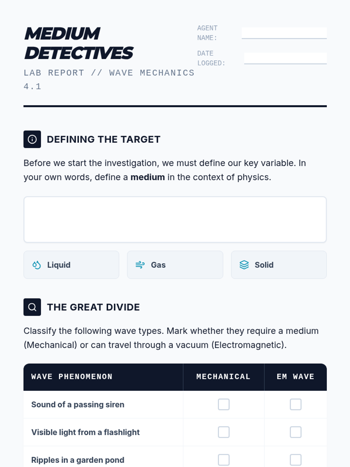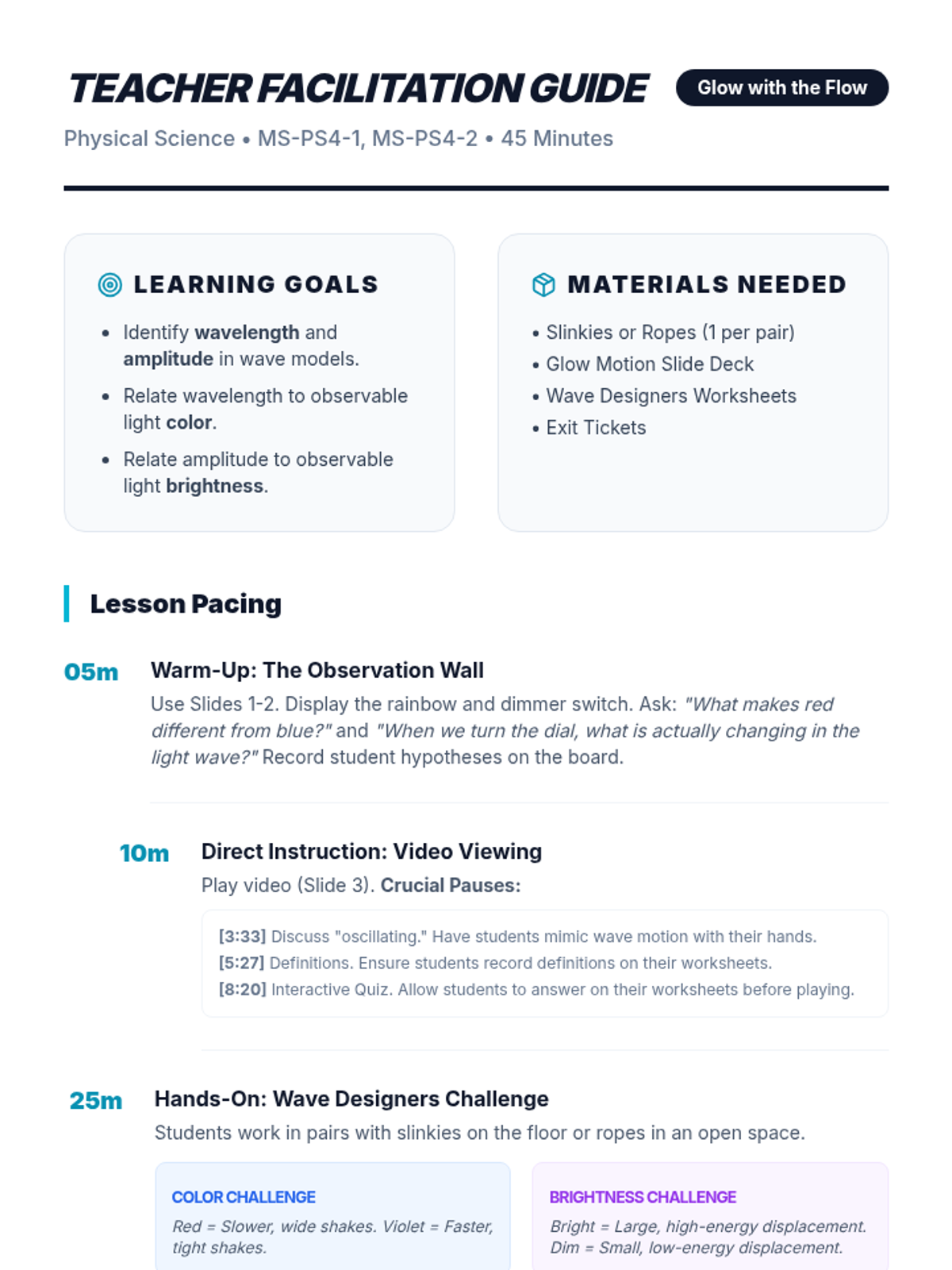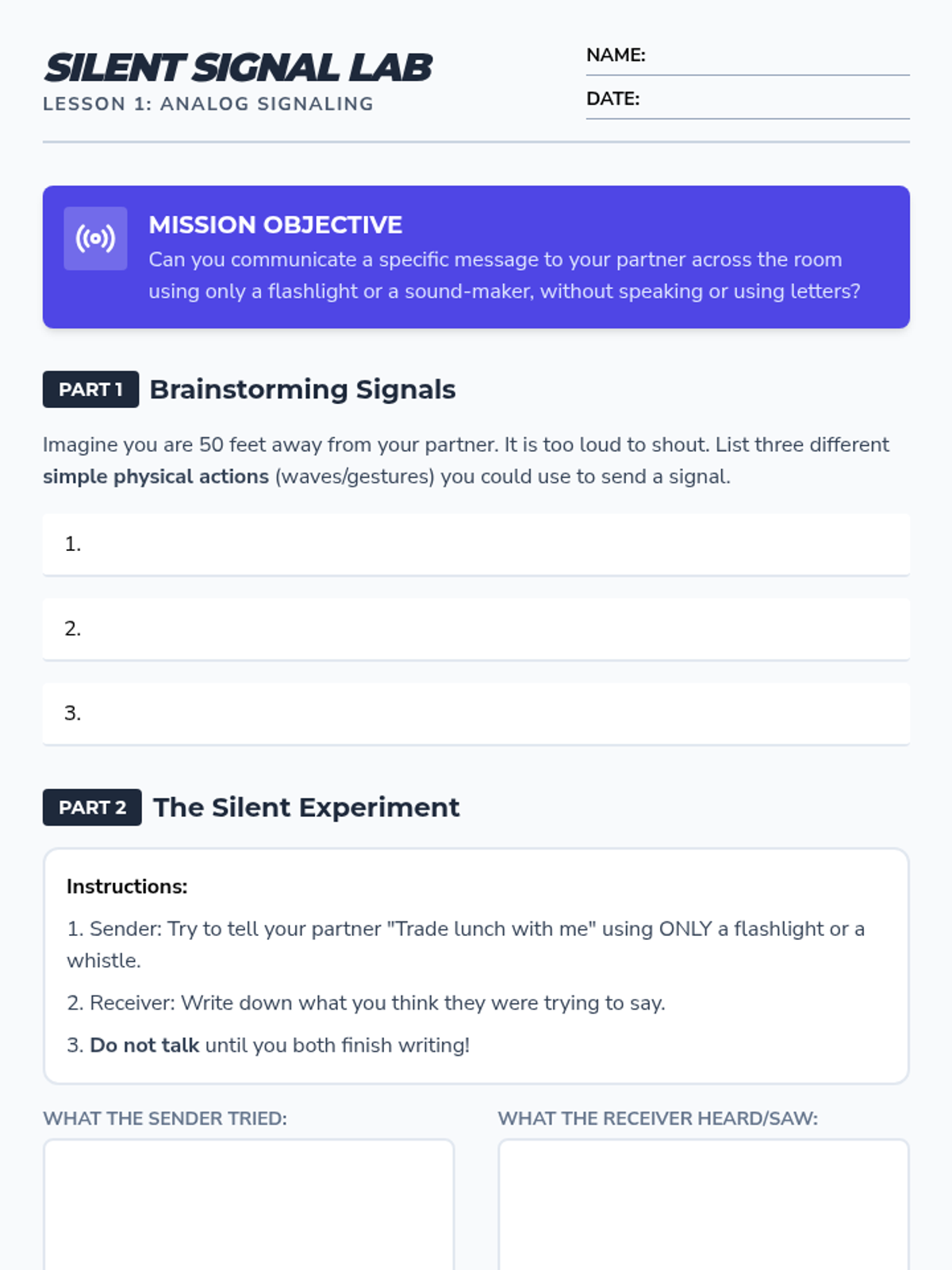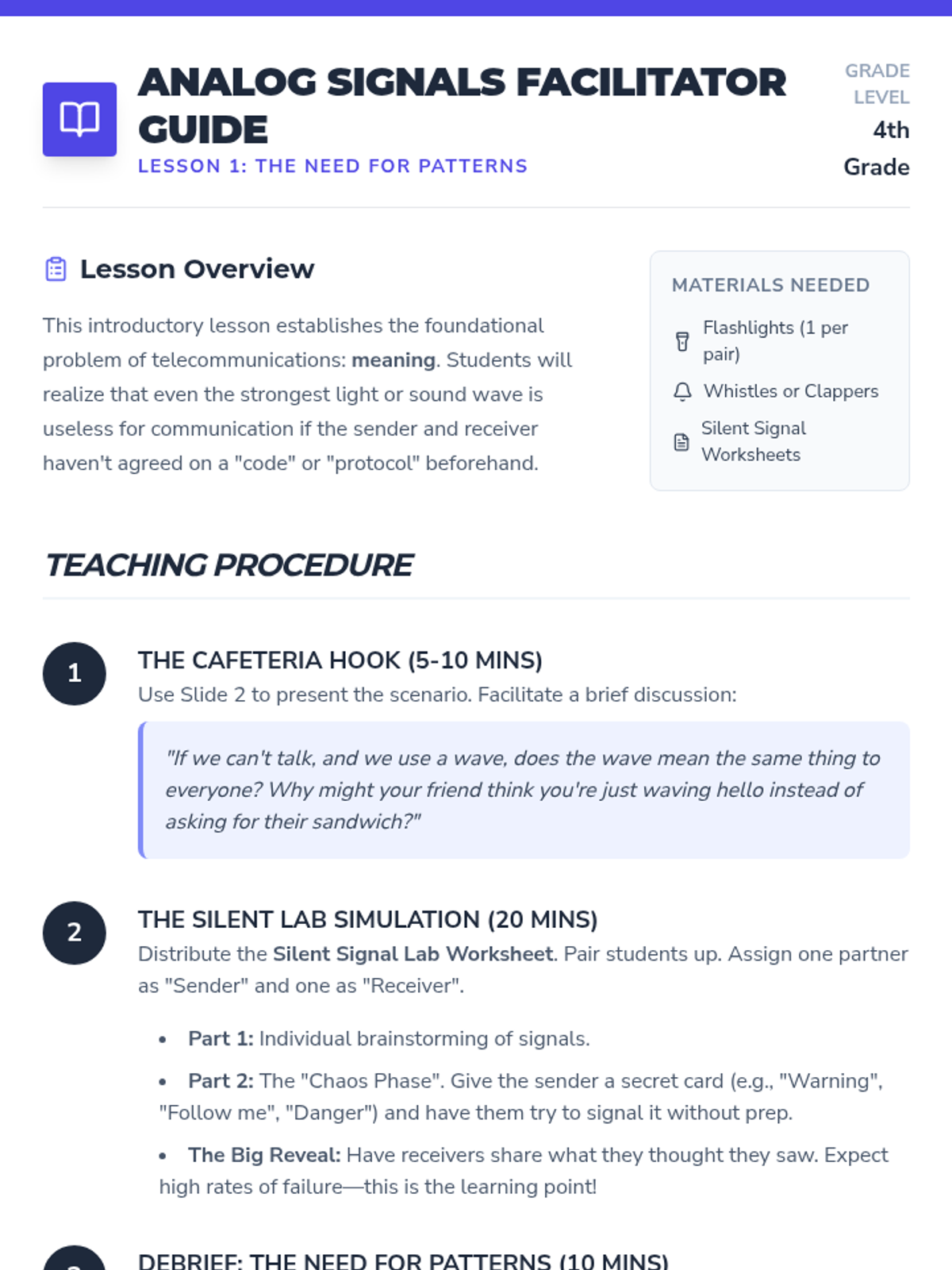 A 4th-grade physics sequence exploring how waves (sound and light) encode and transmit information. Students learn about analog signals, Morse code, binary patterns, and system design through hands-on simulations.