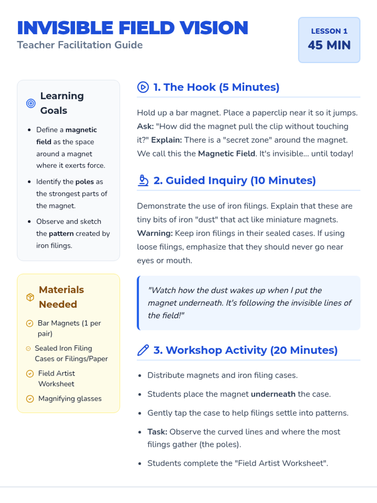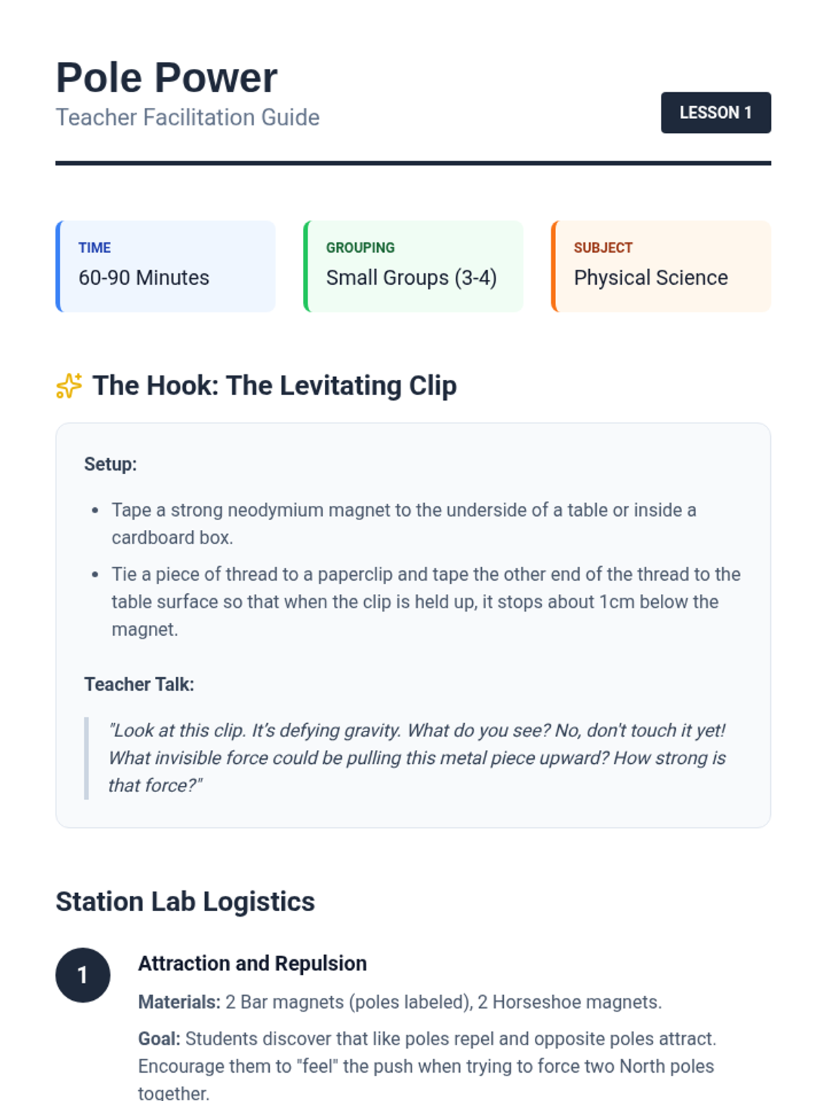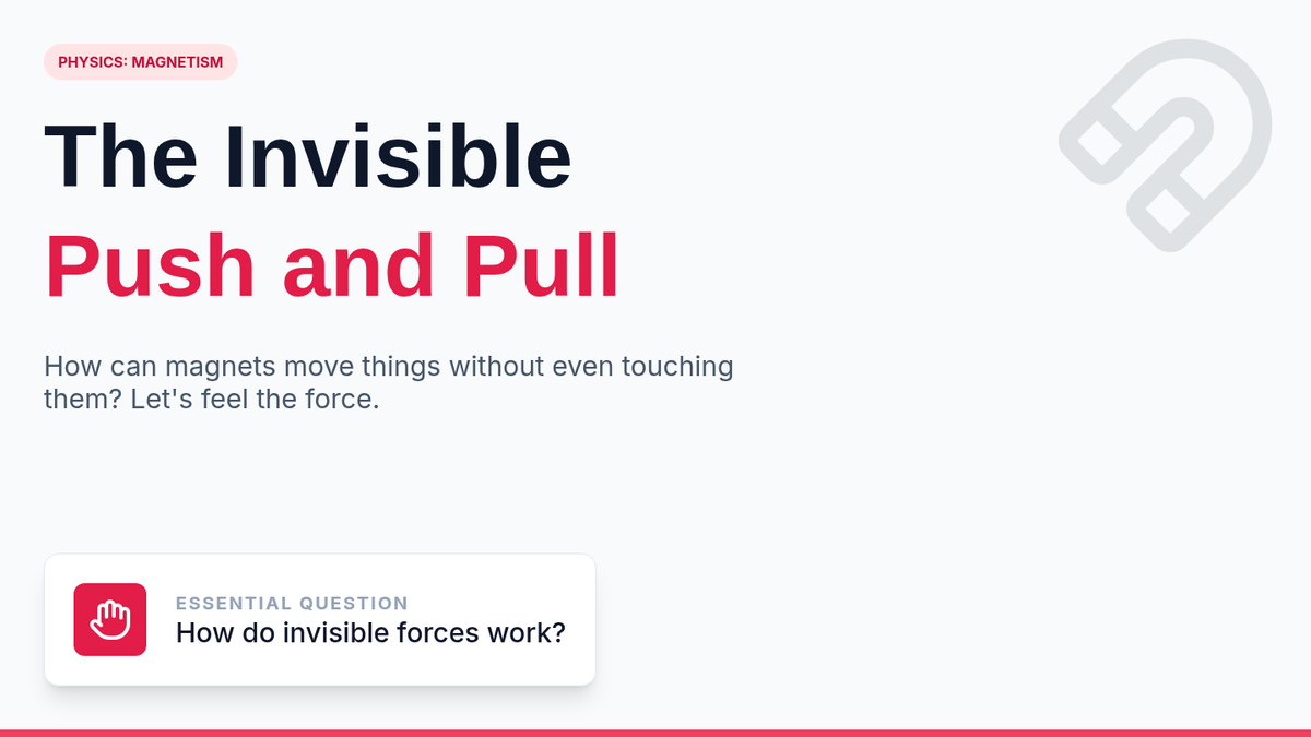 A 2nd-grade physics sequence exploring the invisible forces of magnetism, specifically focusing on poles, attraction, repulsion, and practical applications like movement and levitation.