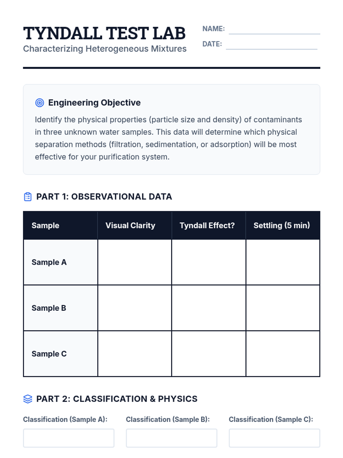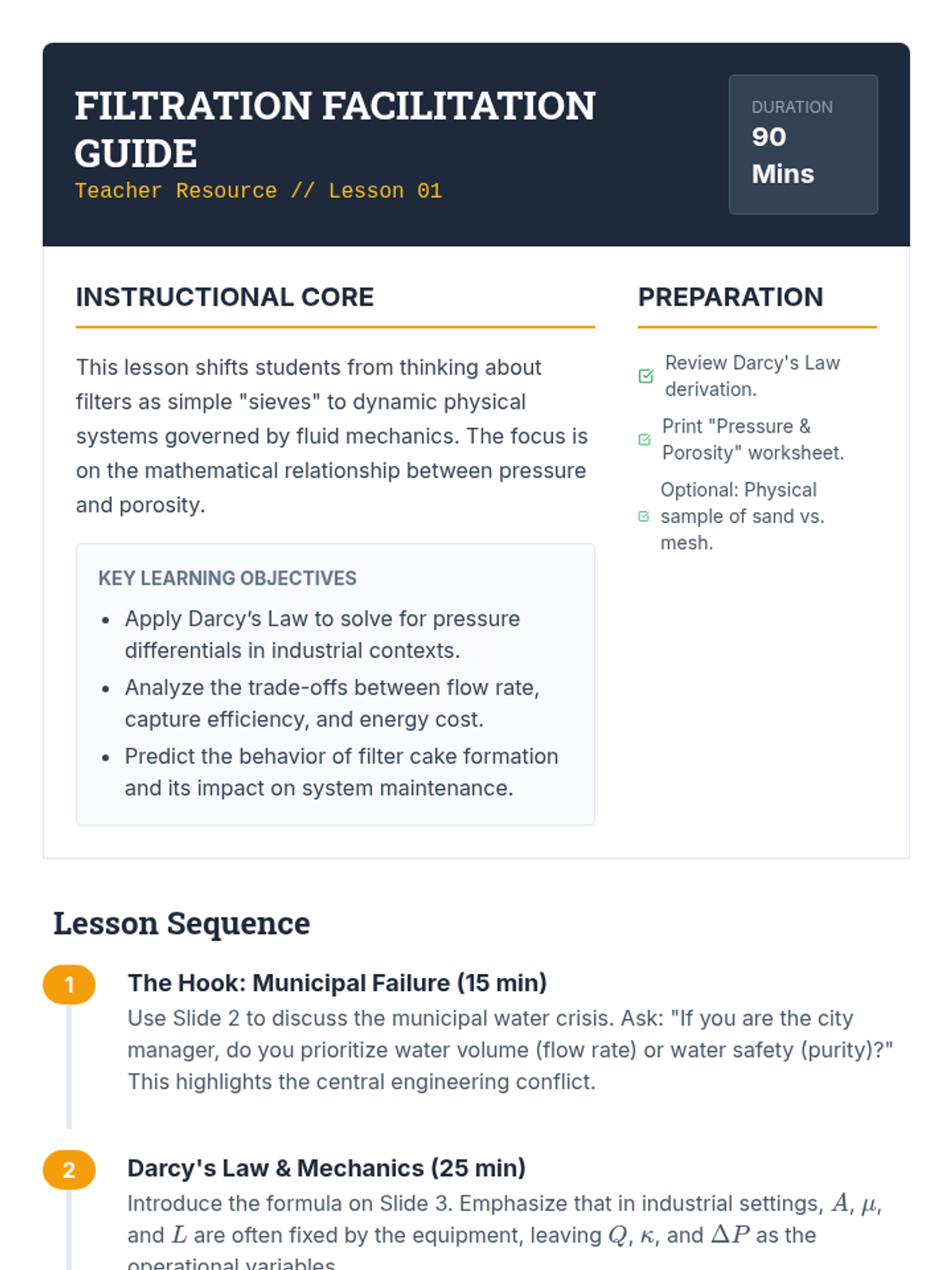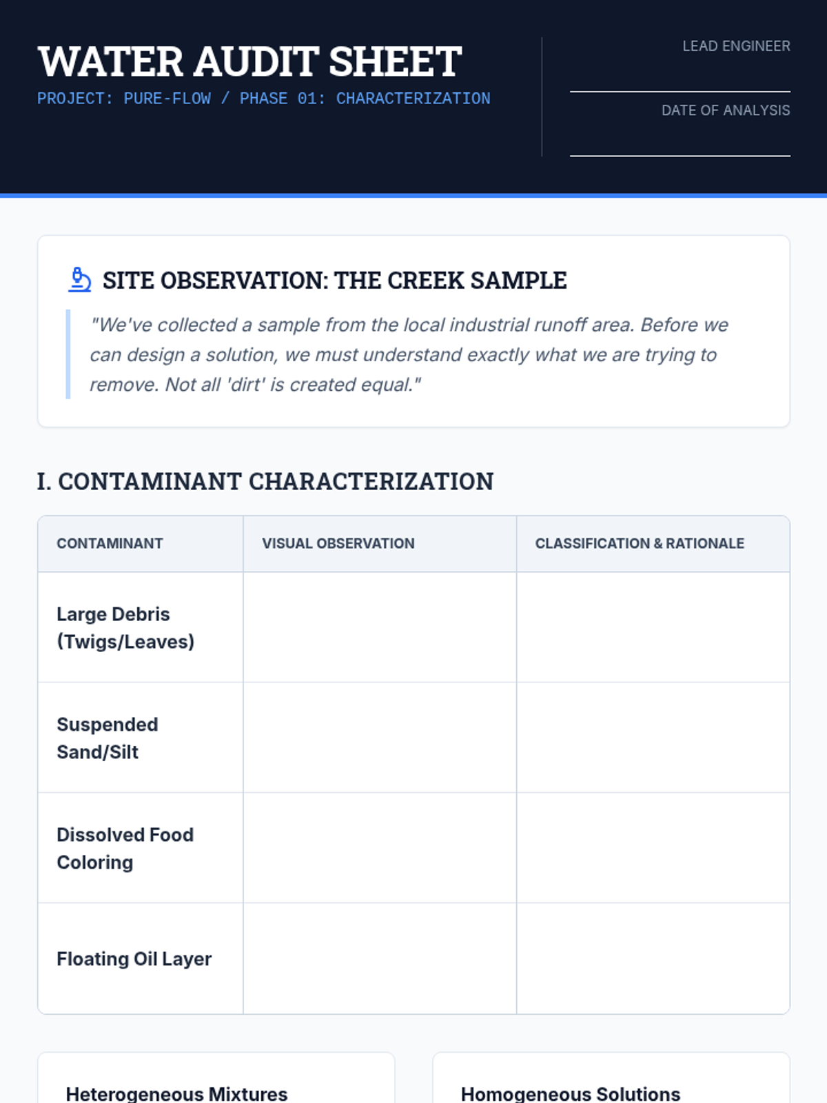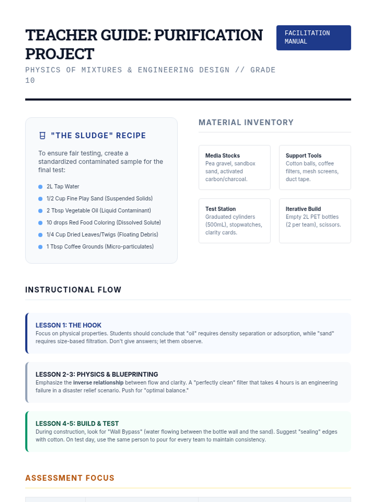 An 11th-grade physics sequence focused on separating heterogeneous mixtures through the engineering design of a multi-stage water filtration system. Students explore particle size, porosity, and flow rate to solve a real-world water crisis scenario.