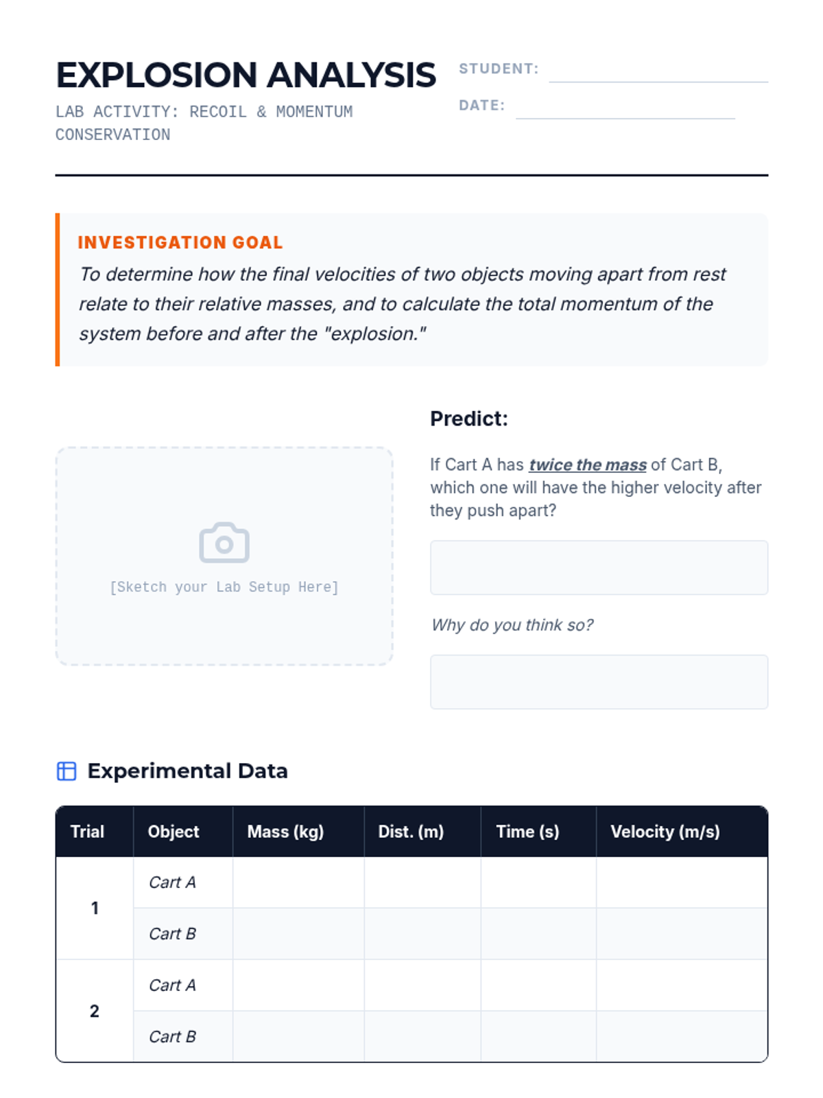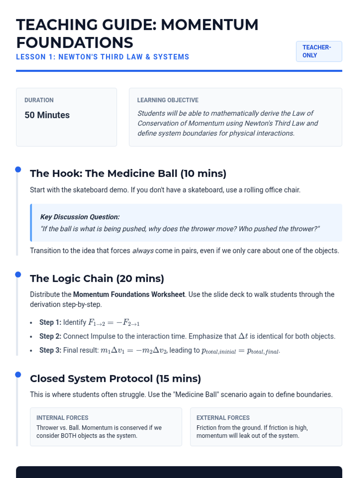 A comprehensive unit for 10th-grade physics students exploring the conservation of momentum through collisions and explosions. Students move from theoretical derivation of Newton's laws to practical mathematical modeling of elastic and inelastic interactions.