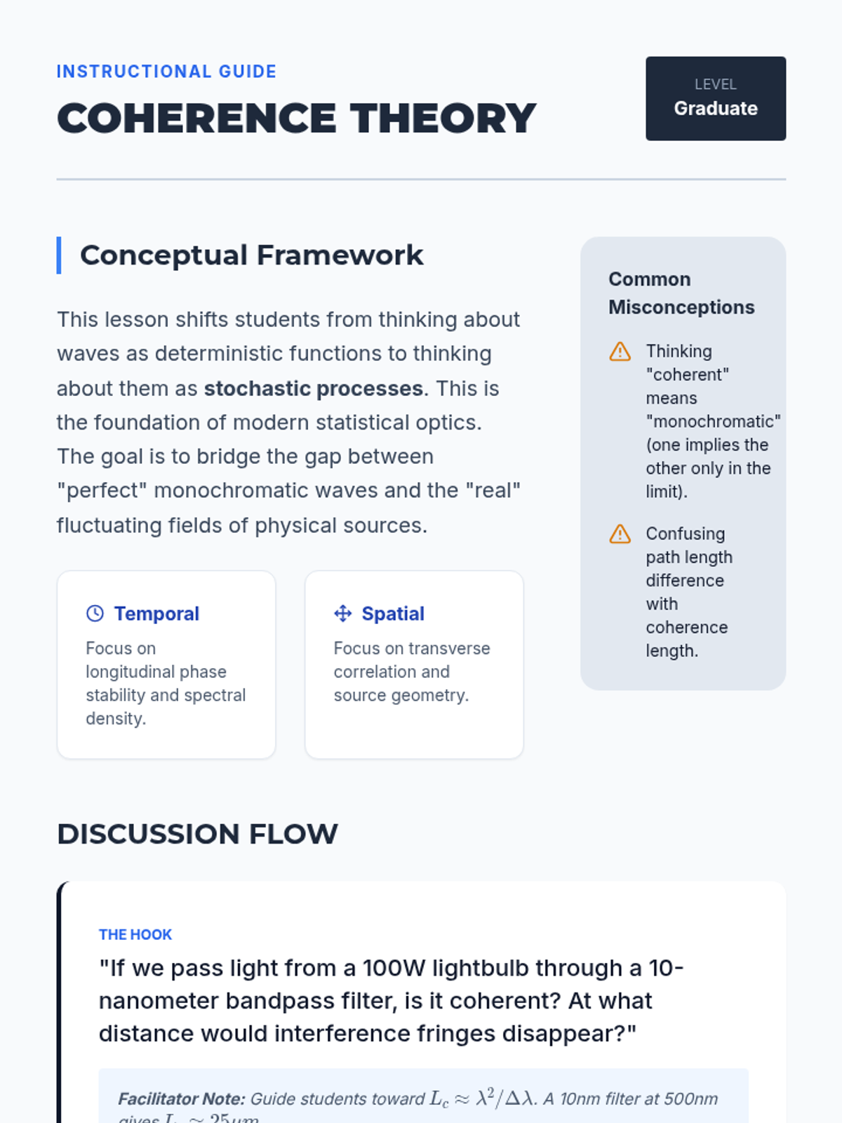 An advanced graduate-level exploration of optical physics, focusing on the statistical properties of light, Fourier analysis of optical systems, wavefront sensing, and quantum interference. Students move from classical coherence theory to cutting-edge adaptive optics and entangled photon experiments.