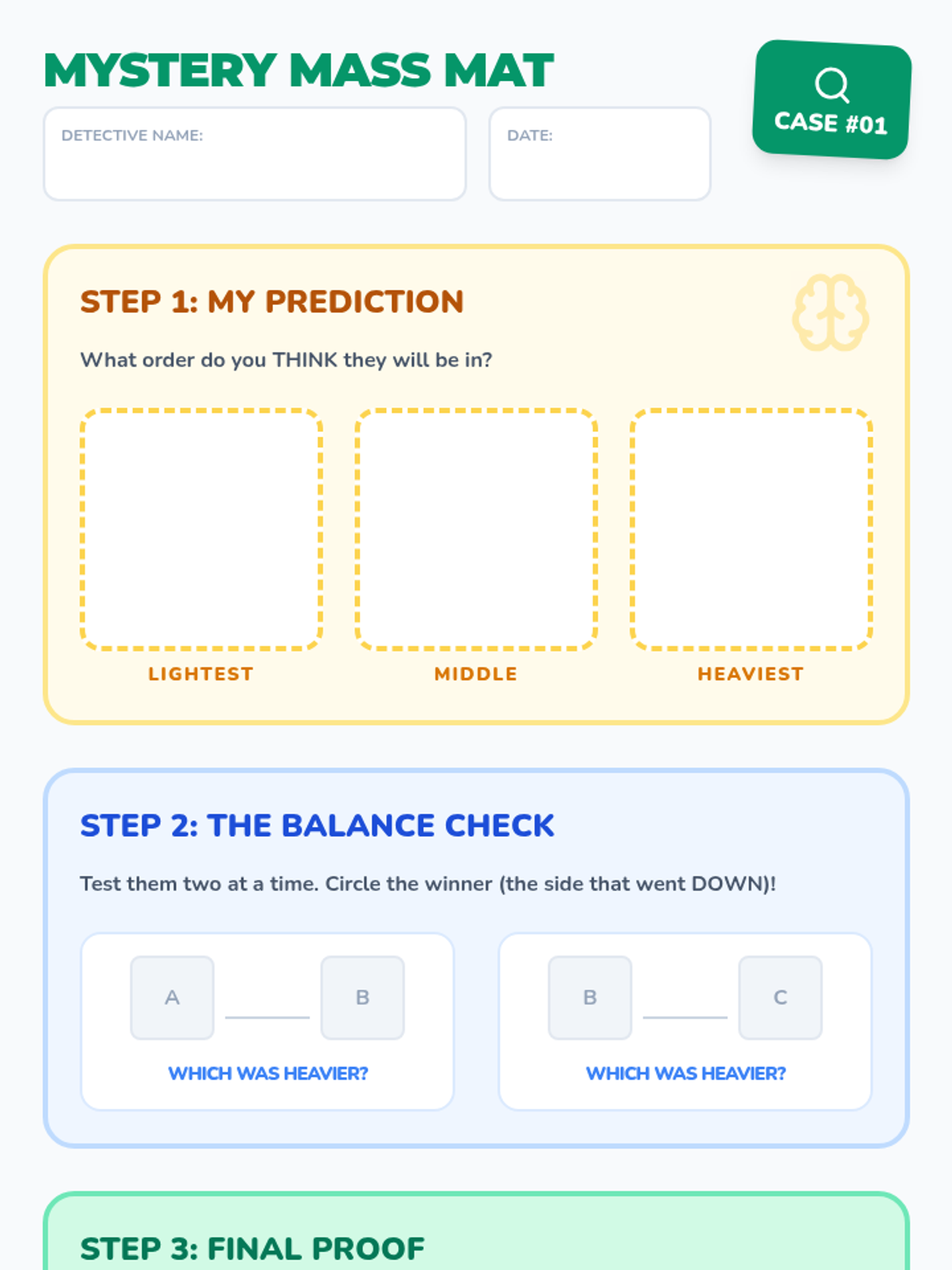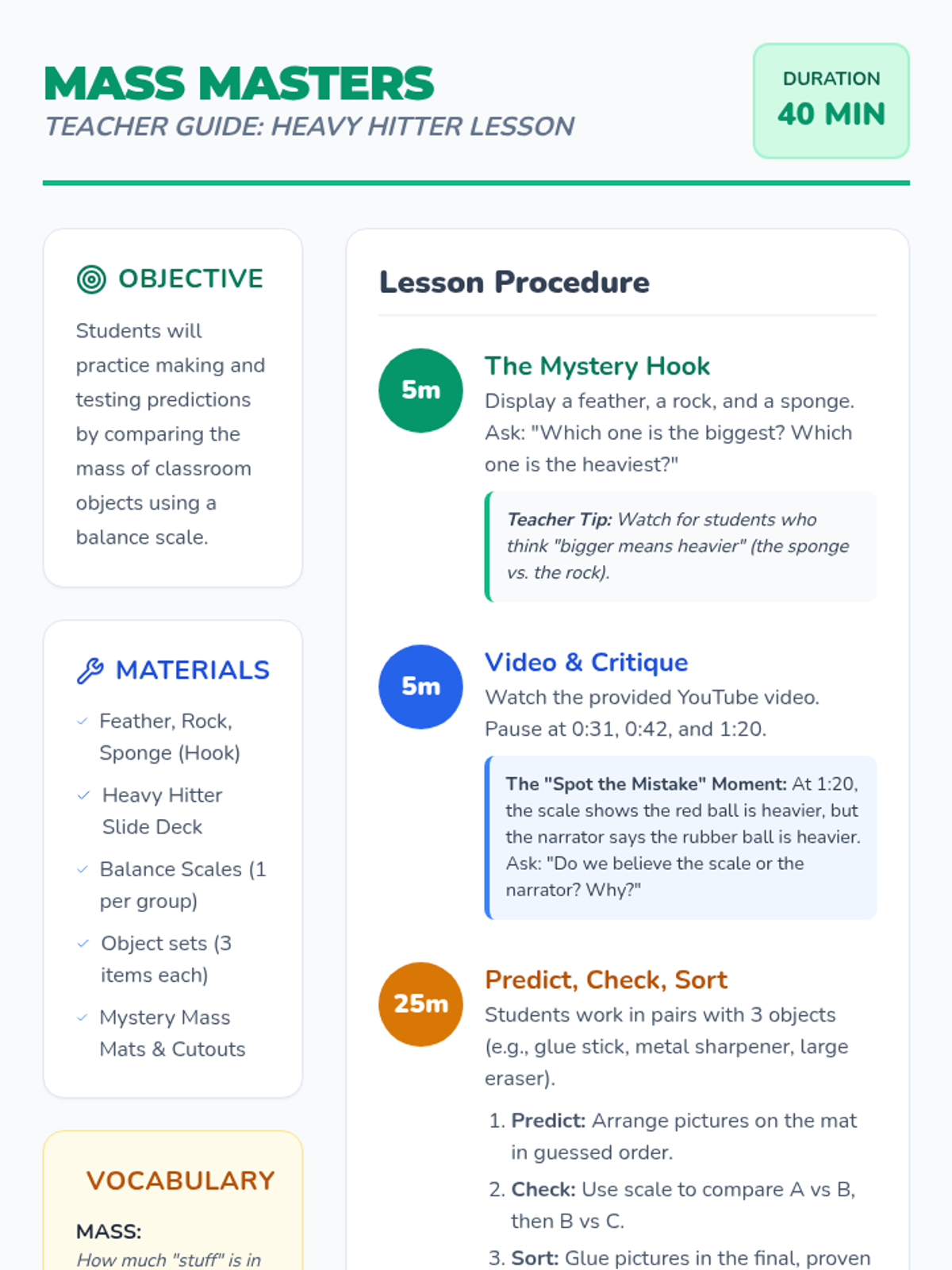 A lesson sequence for K-2 students focusing on scientific inquiry, making predictions, and using tools to measure and compare mass. Students learn to distinguish between mass (how heavy) and volume (how big) through hands-on experiments.
