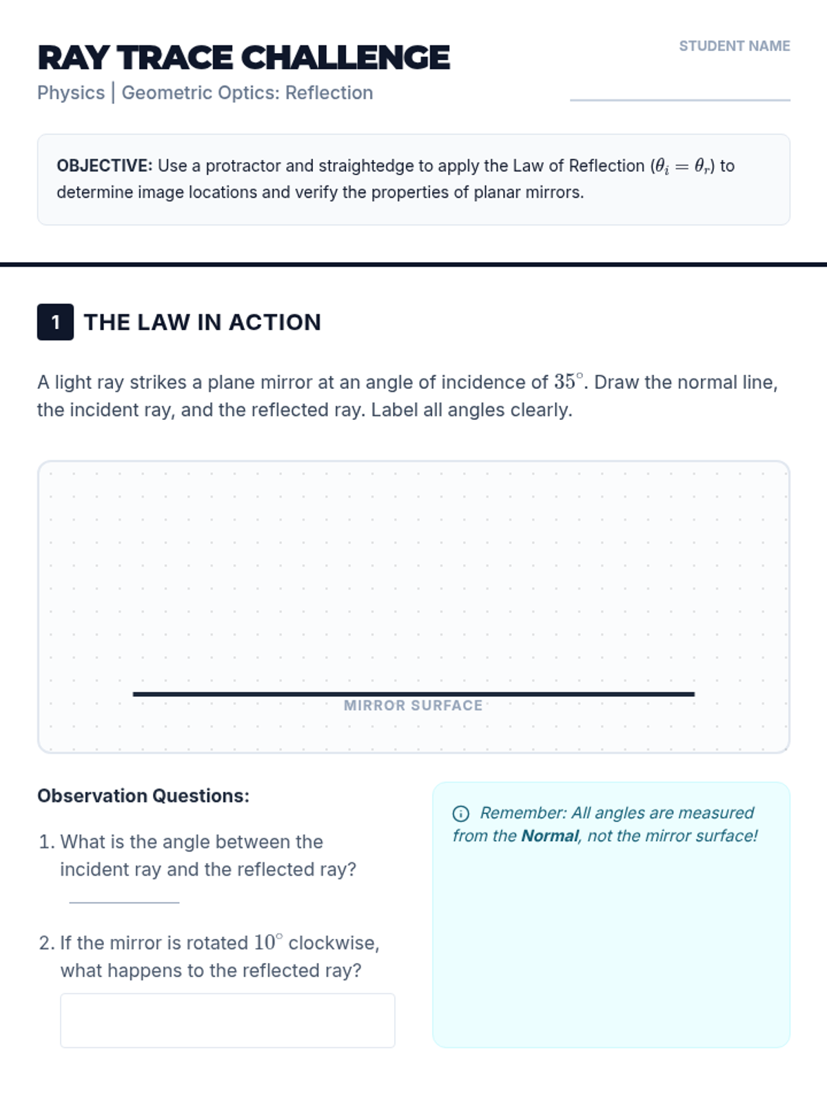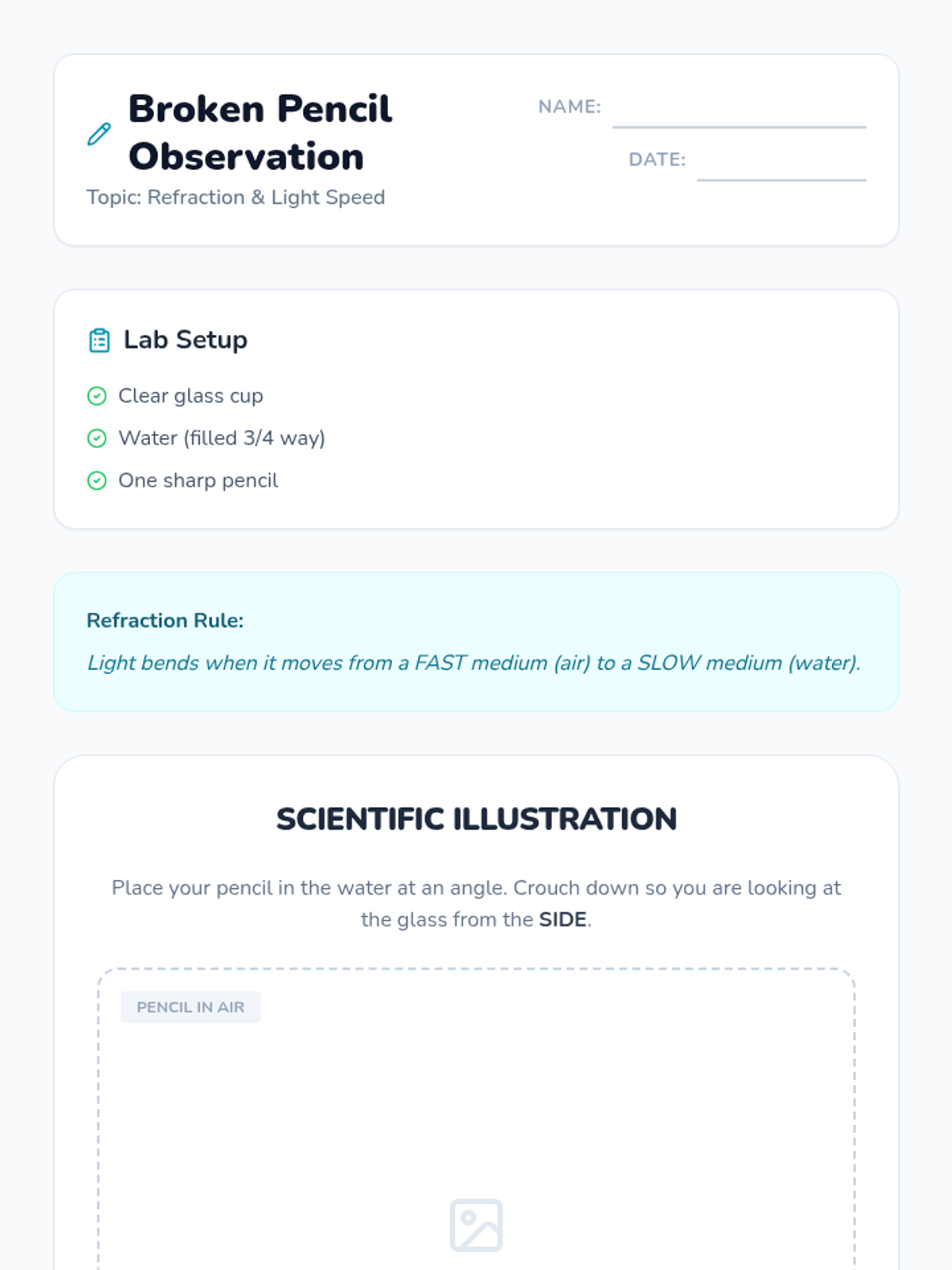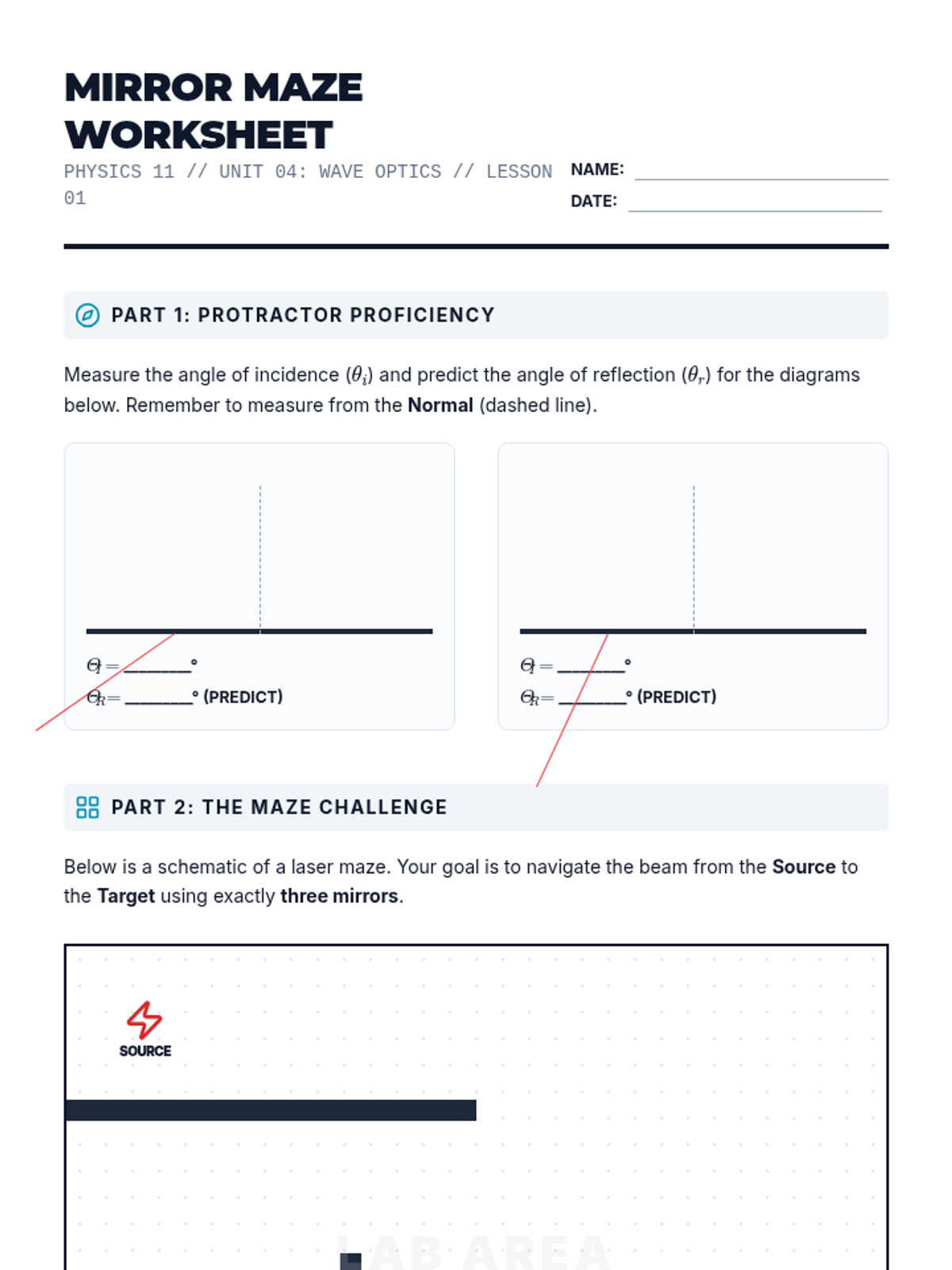 A comprehensive 11th-grade physics unit on geometric optics, covering the ray model of light, reflection, refraction, Snell's Law, total internal reflection, and lens image formation. Students engage in inquiry-based labs and quantitative analysis to understand how light is manipulated in modern technology and vision.