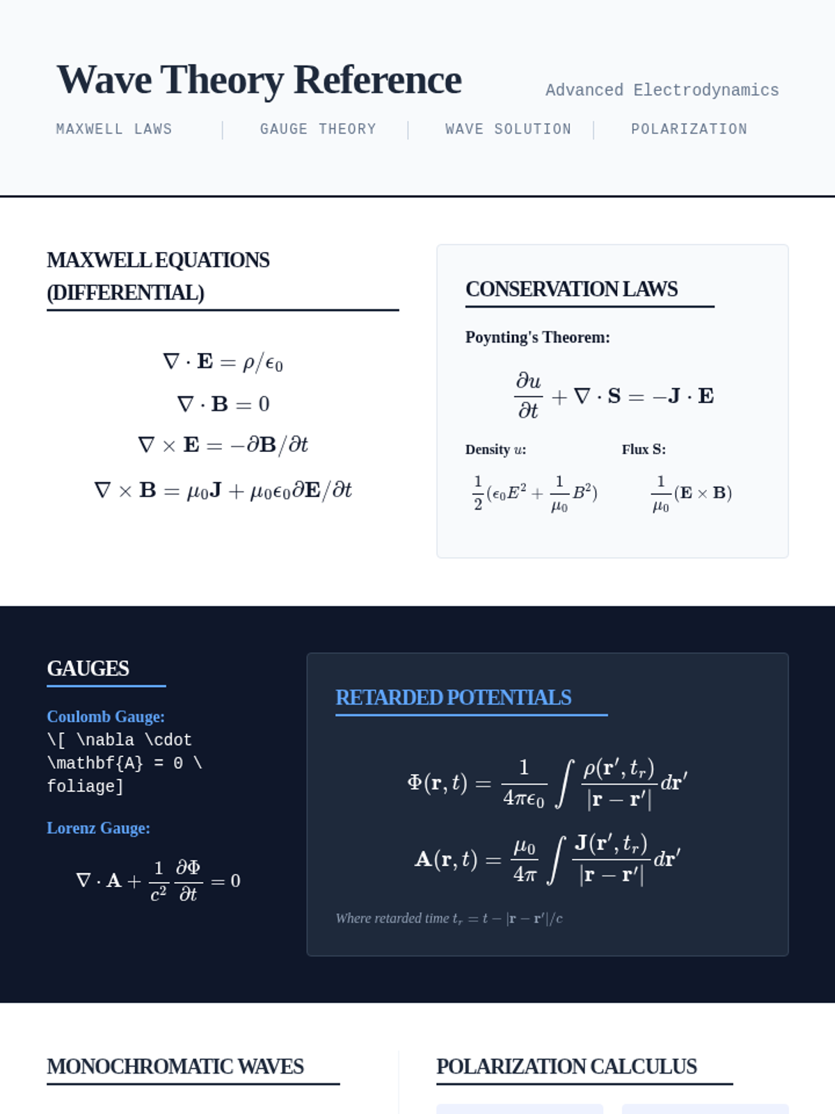This graduate-level sequence provides a rigorous mathematical foundation in classical electrodynamics. It covers Maxwell's equations, conservation laws, potential formulations, gauge invariance, Green's functions for wave equations, and the properties of monochromatic plane waves including polarization states via Jones and Stokes calculus.