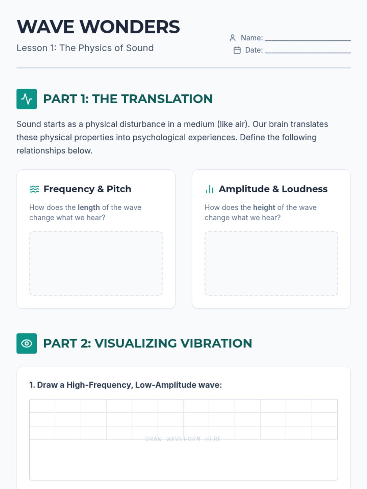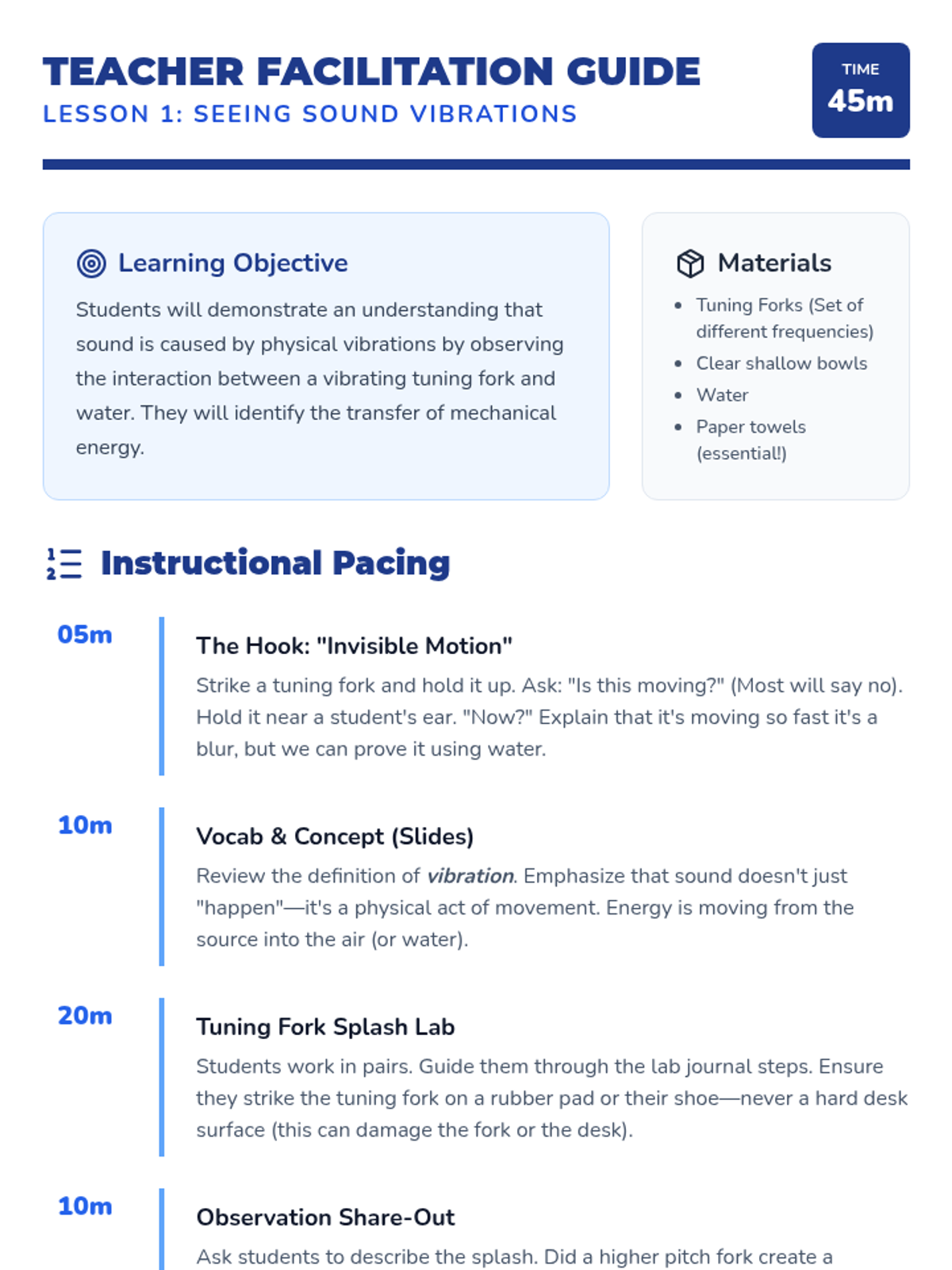 Students investigate the physics of sound, focusing on the relationship between vibration, volume, and pitch. The sequence utilizes a project-based approach where students design and test musical instruments to apply their understanding of wave properties. Learners explore how changing the physical characteristics of an object alters the sound waves it produces. The unit concludes with an acoustic engineering showcase.