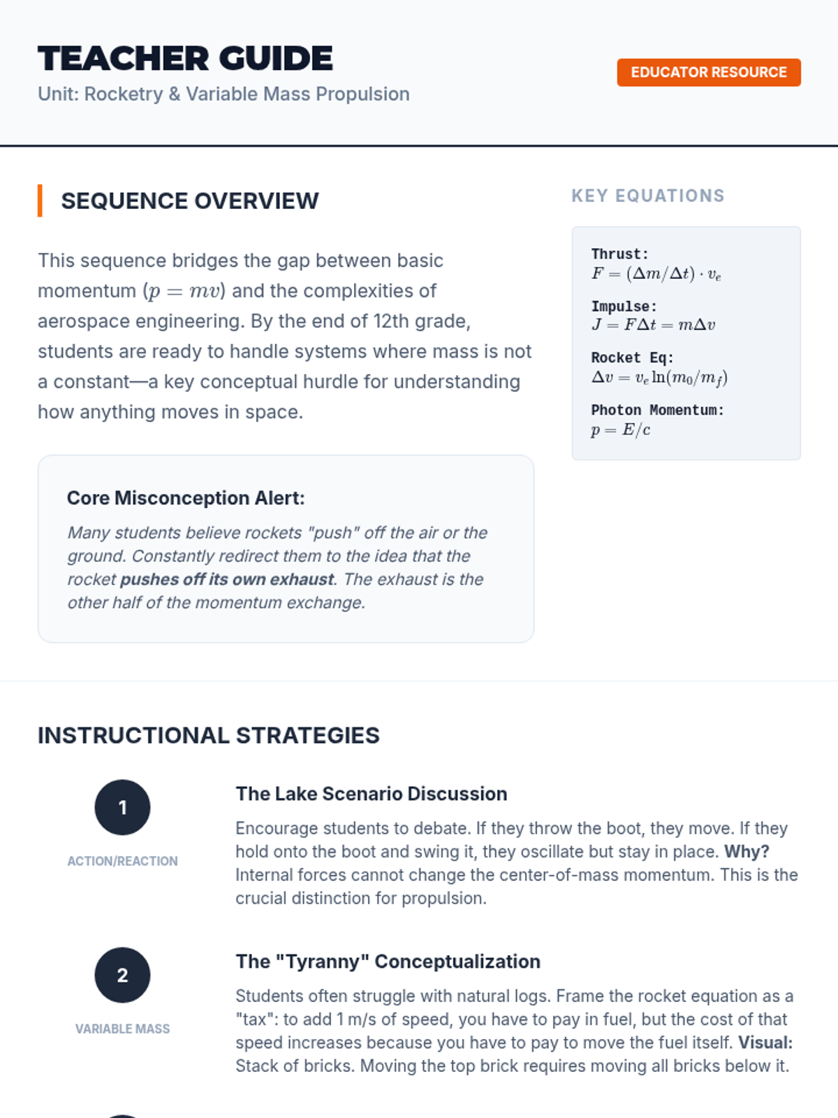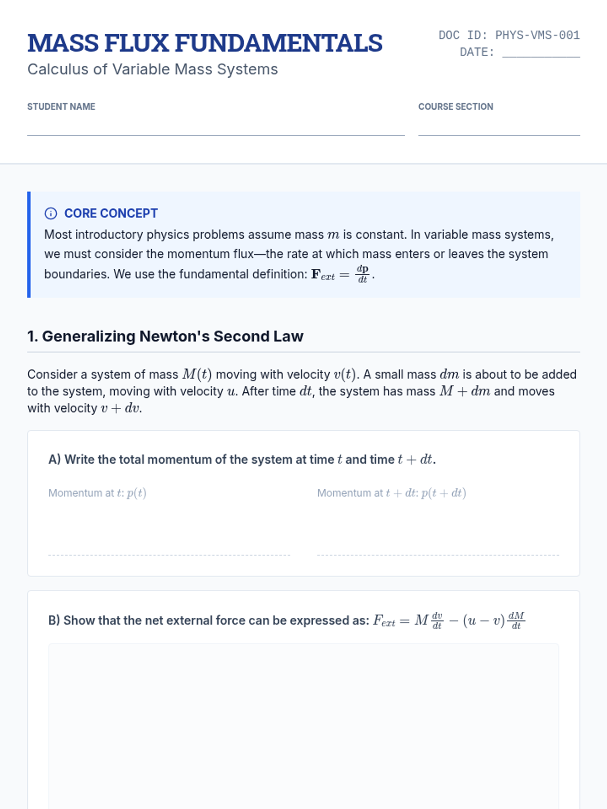 An advanced undergraduate physics sequence exploring the mechanics of variable mass systems, from the fundamental calculus of momentum flux to the engineering of multi-stage rockets and future propulsion technologies. Students will master the Tsiolkovsky Rocket Equation and solve complex problems involving continuous mass accumulation and depletion.