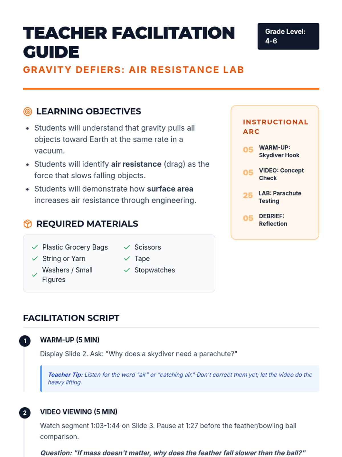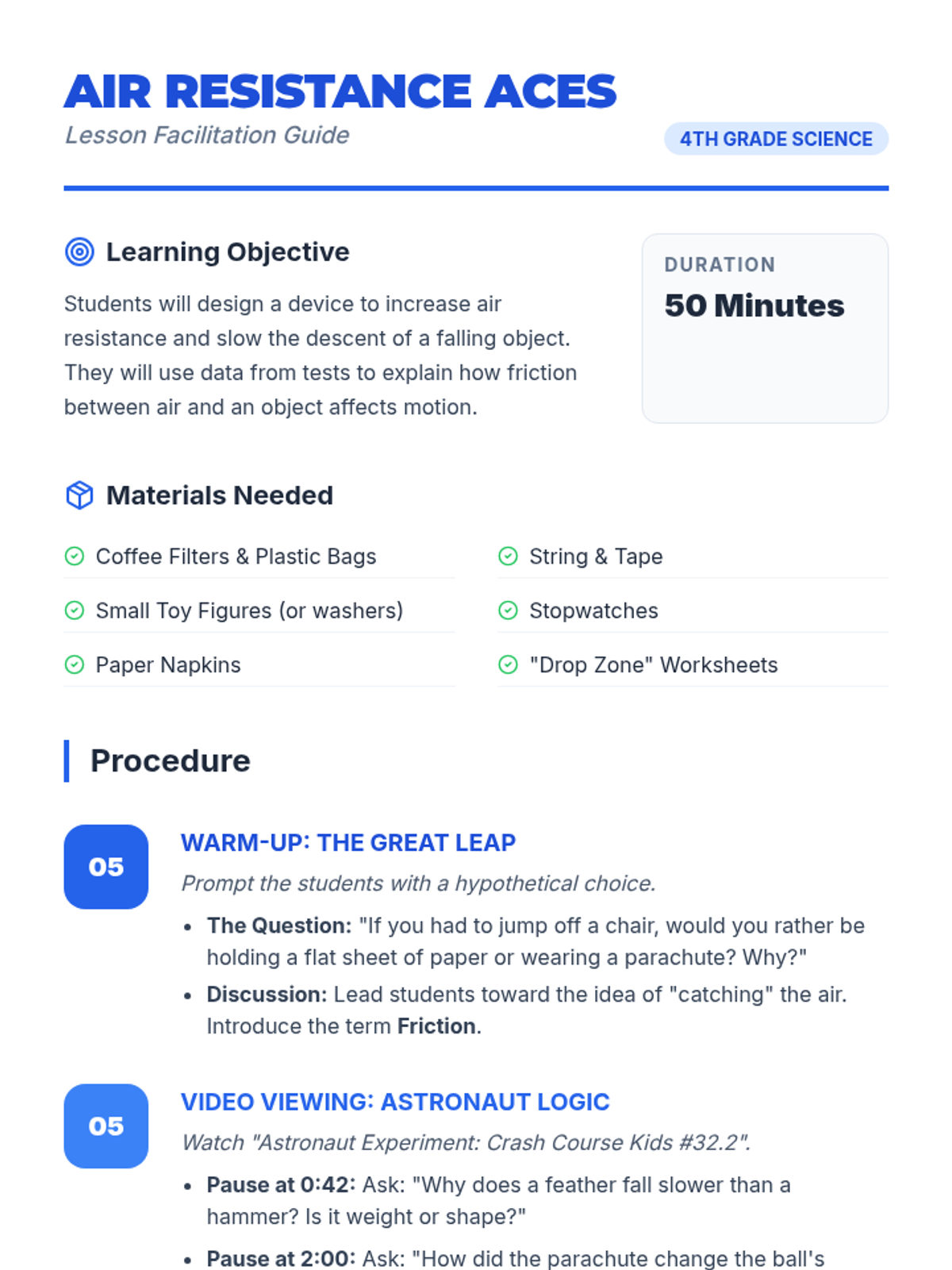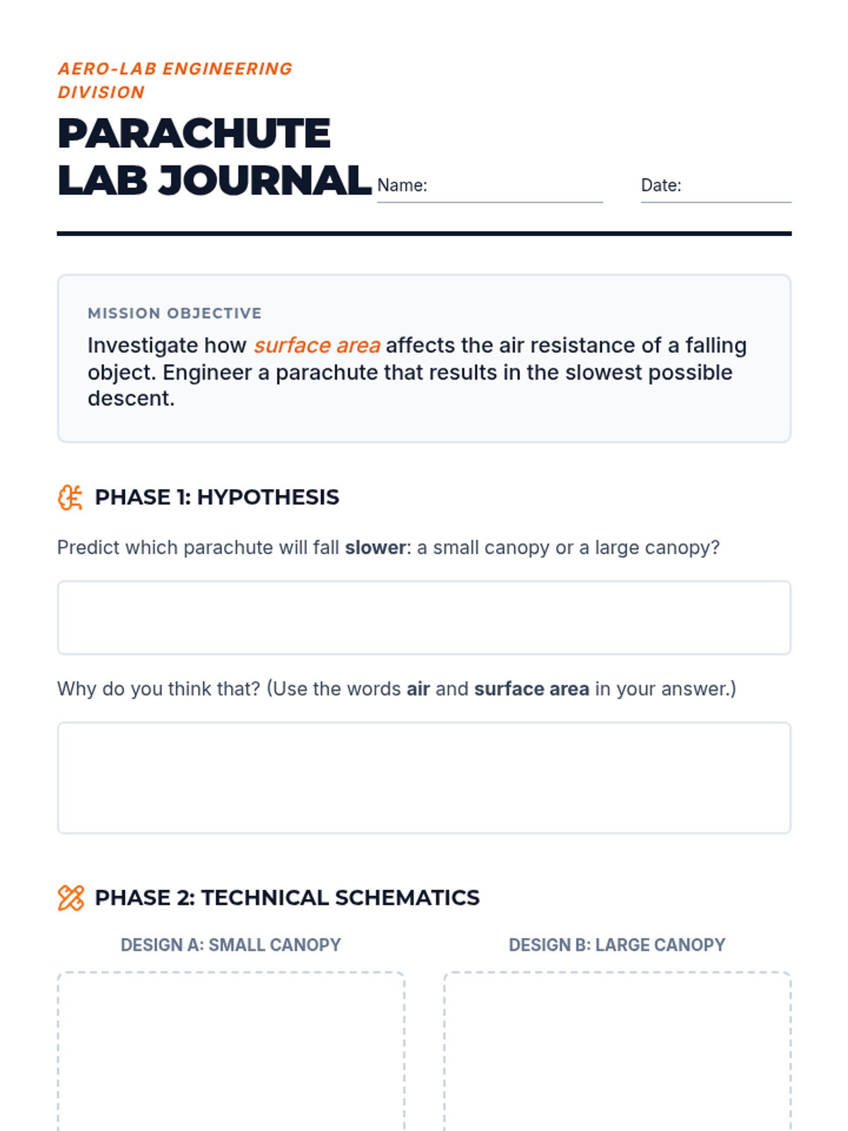 A hands-on exploration of physics and forces, focusing on gravity, motion, and air resistance through engineering challenges.