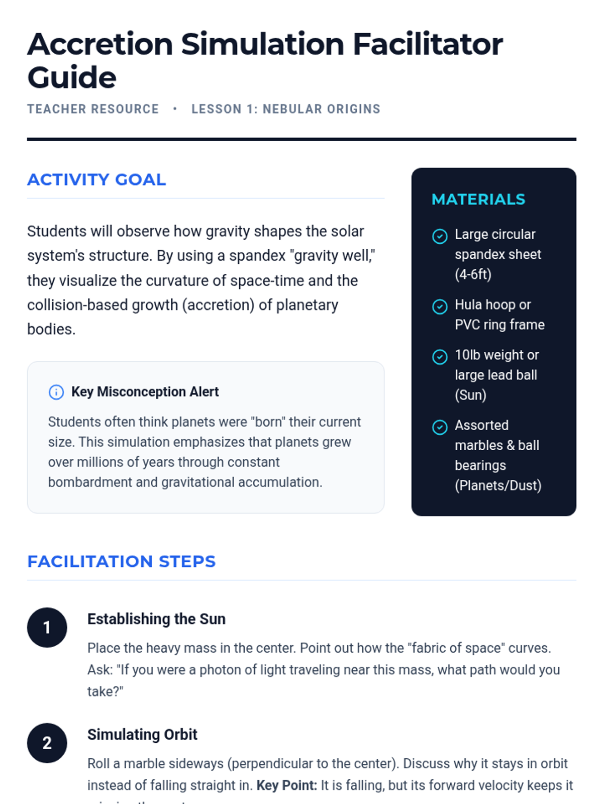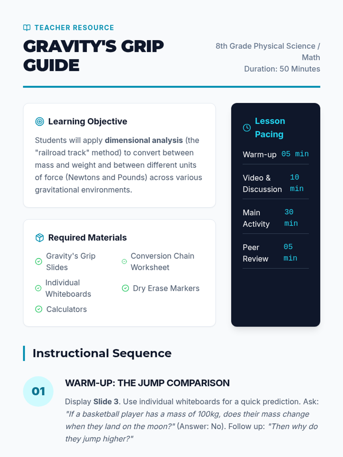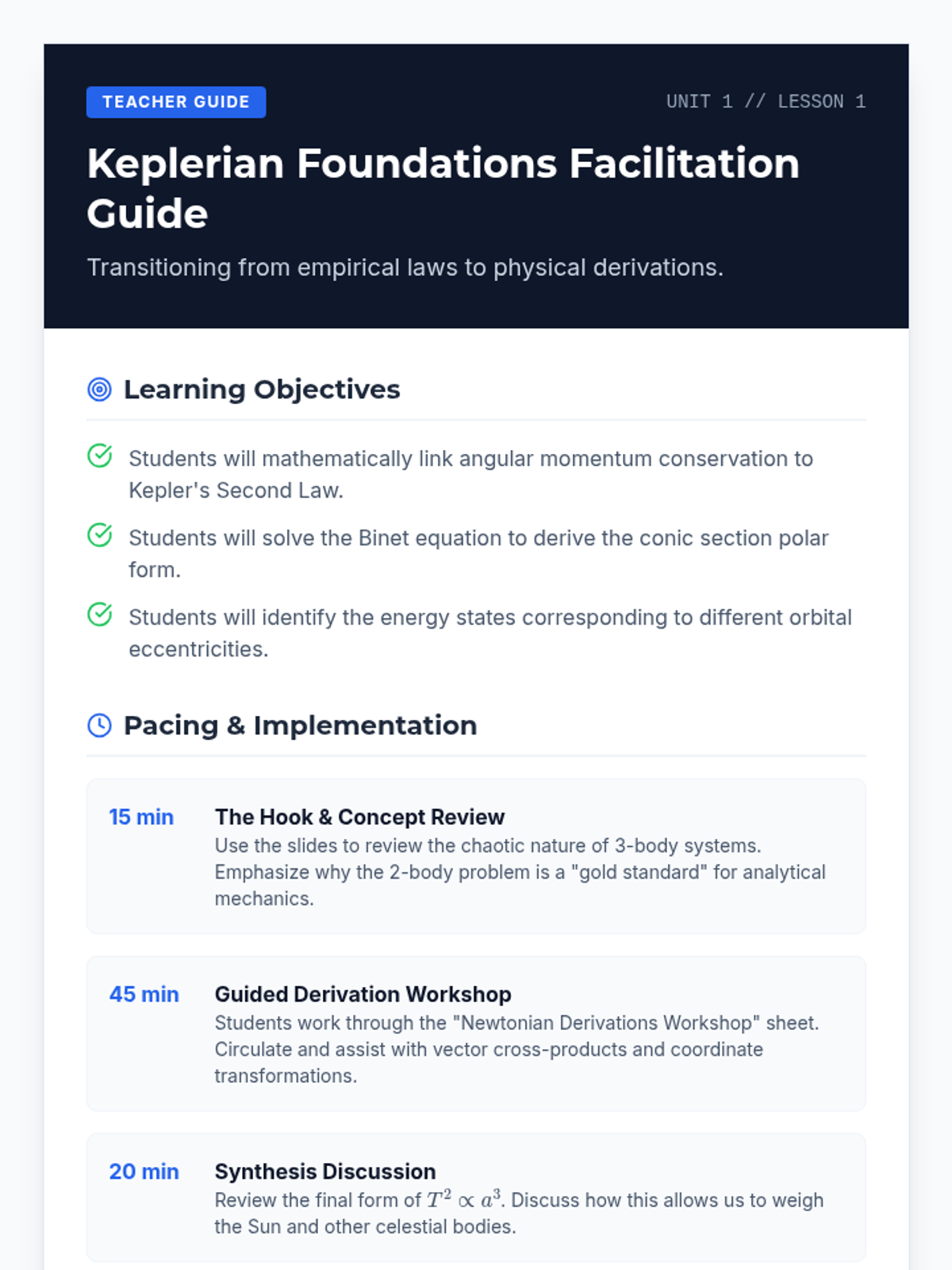 This 8th-grade astronomy sequence explores the physics of orbital motion, focusing on the relationship between gravity and inertia. Students progress from basic gravitational laws to complex orbital mechanics and mission planning.