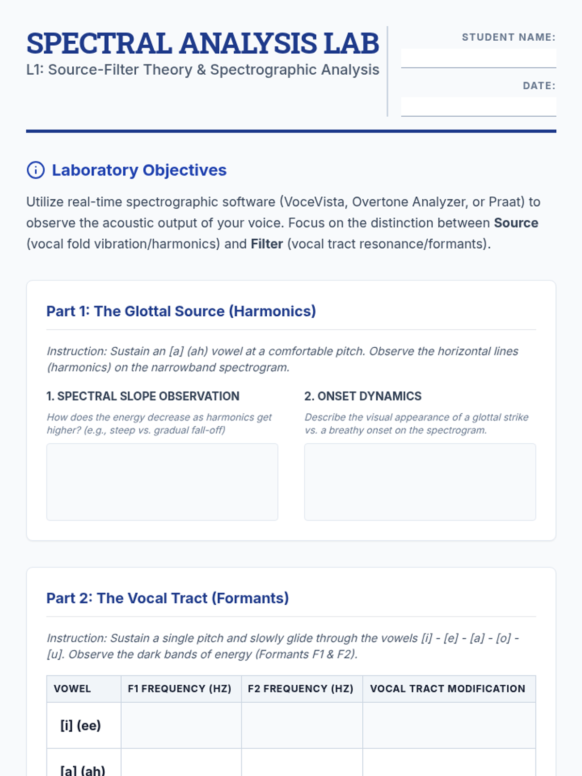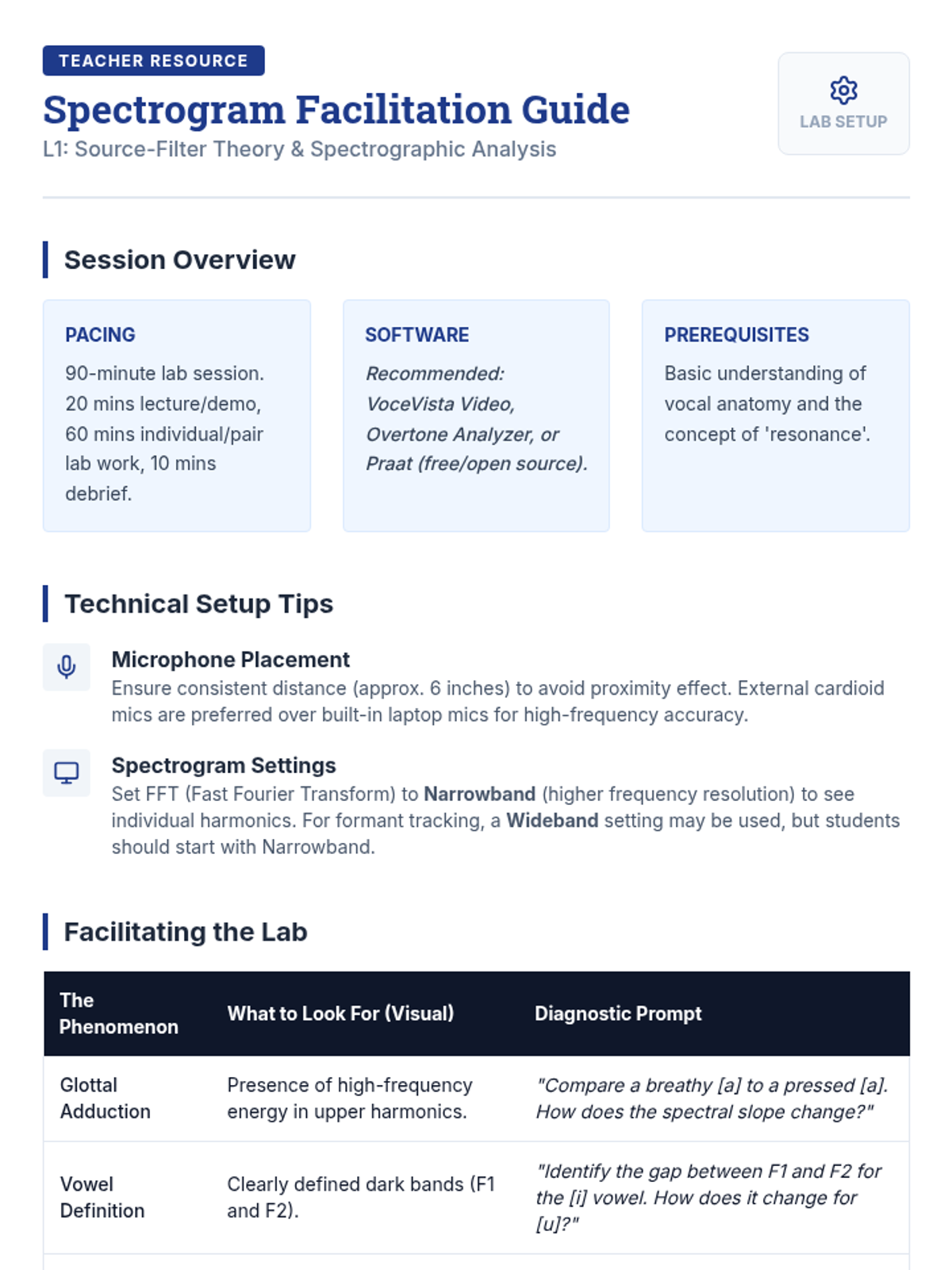 This graduate-level sequence bridges the gap between vocal science and pedagogical practice, exploring acoustics, registration, and diagnostics. Students move from theoretical physics of sound to practical clinical observation of the singing voice.