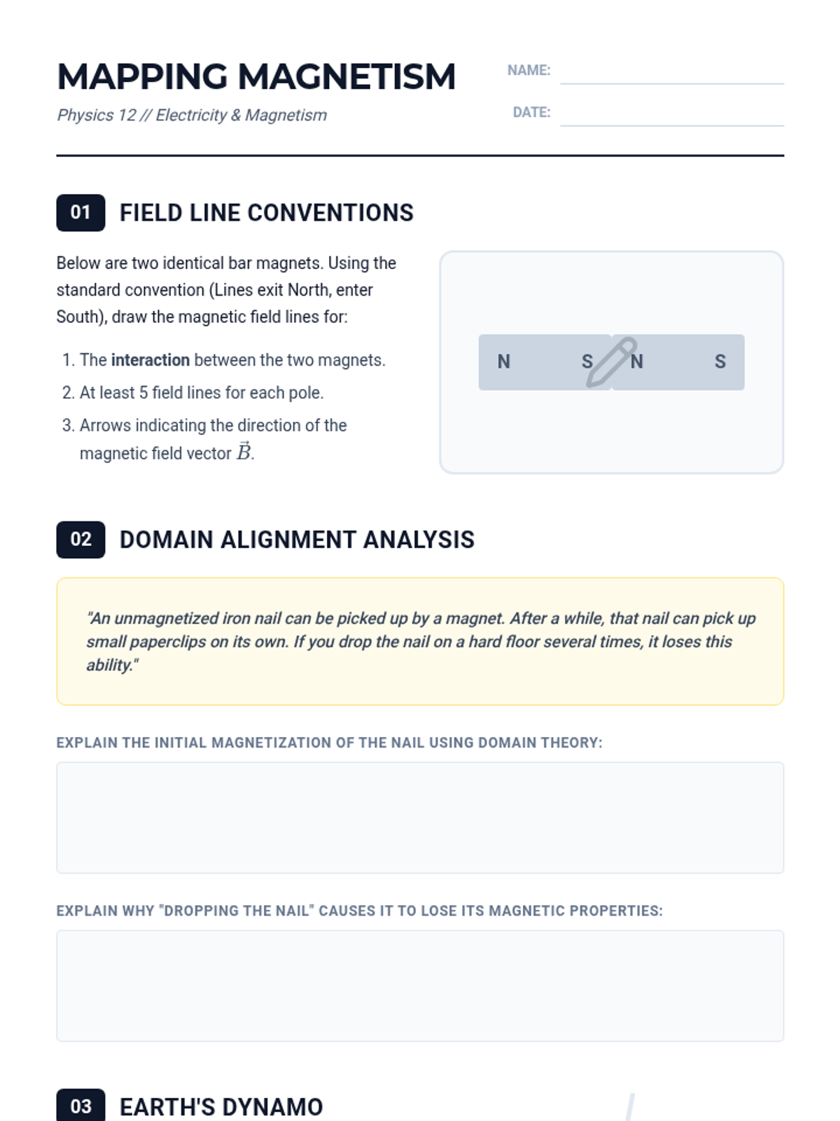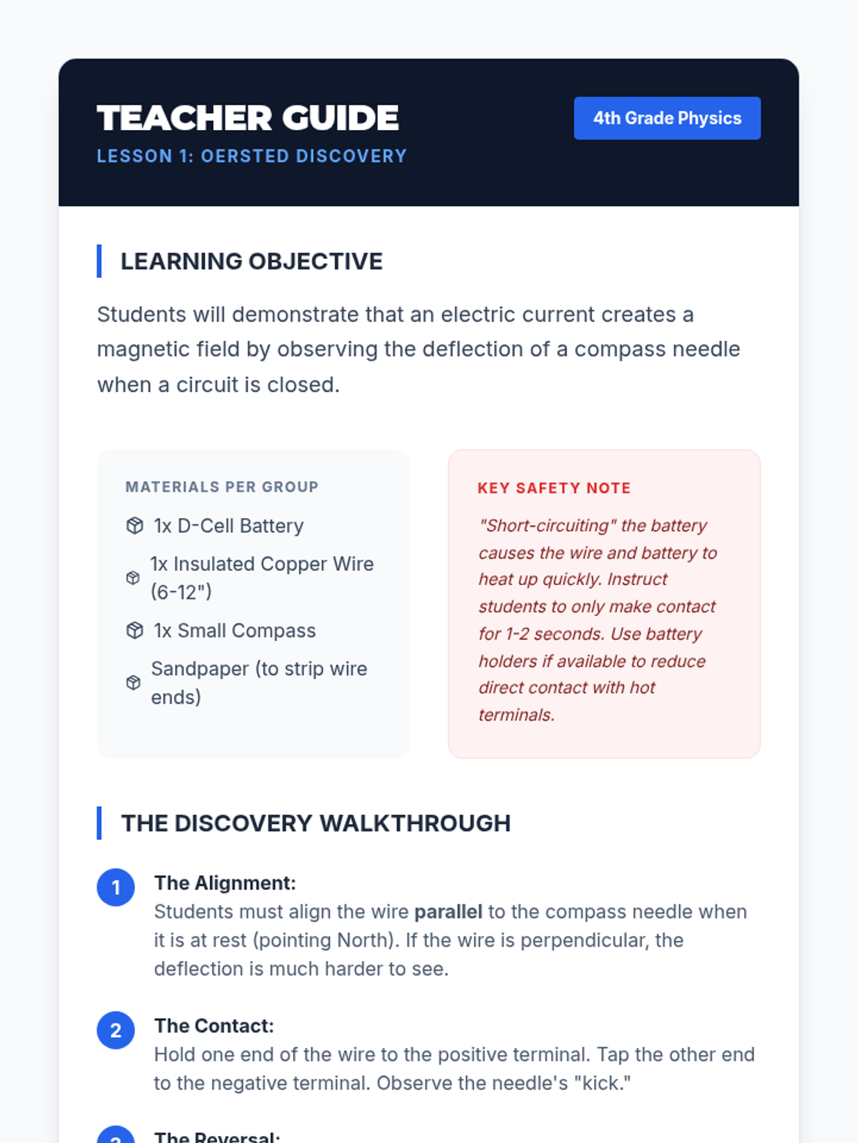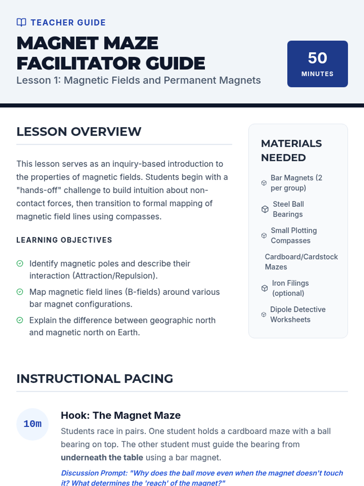 A hands-on physics sequence for 4th graders exploring magnetism through discovery, visualization, and experimentation. Students investigate magnetic materials, polarity, field patterns, and Earth's magnetic force.
