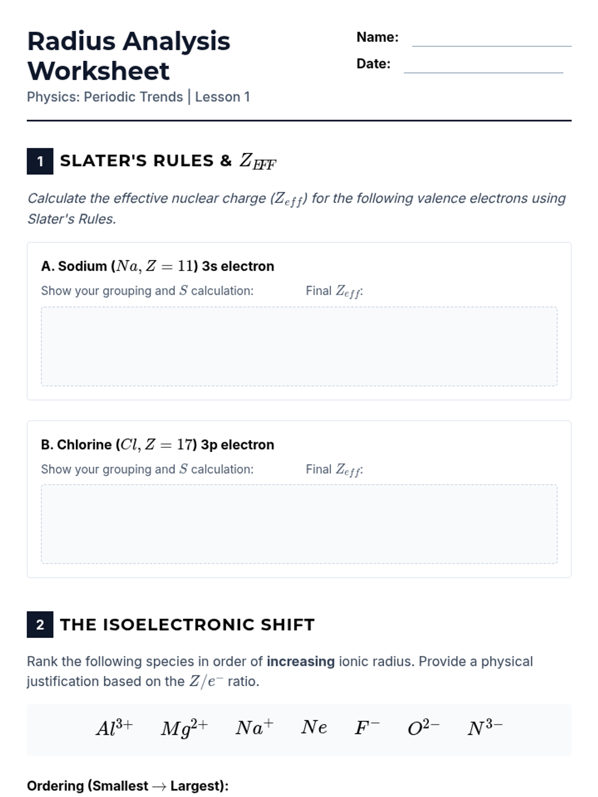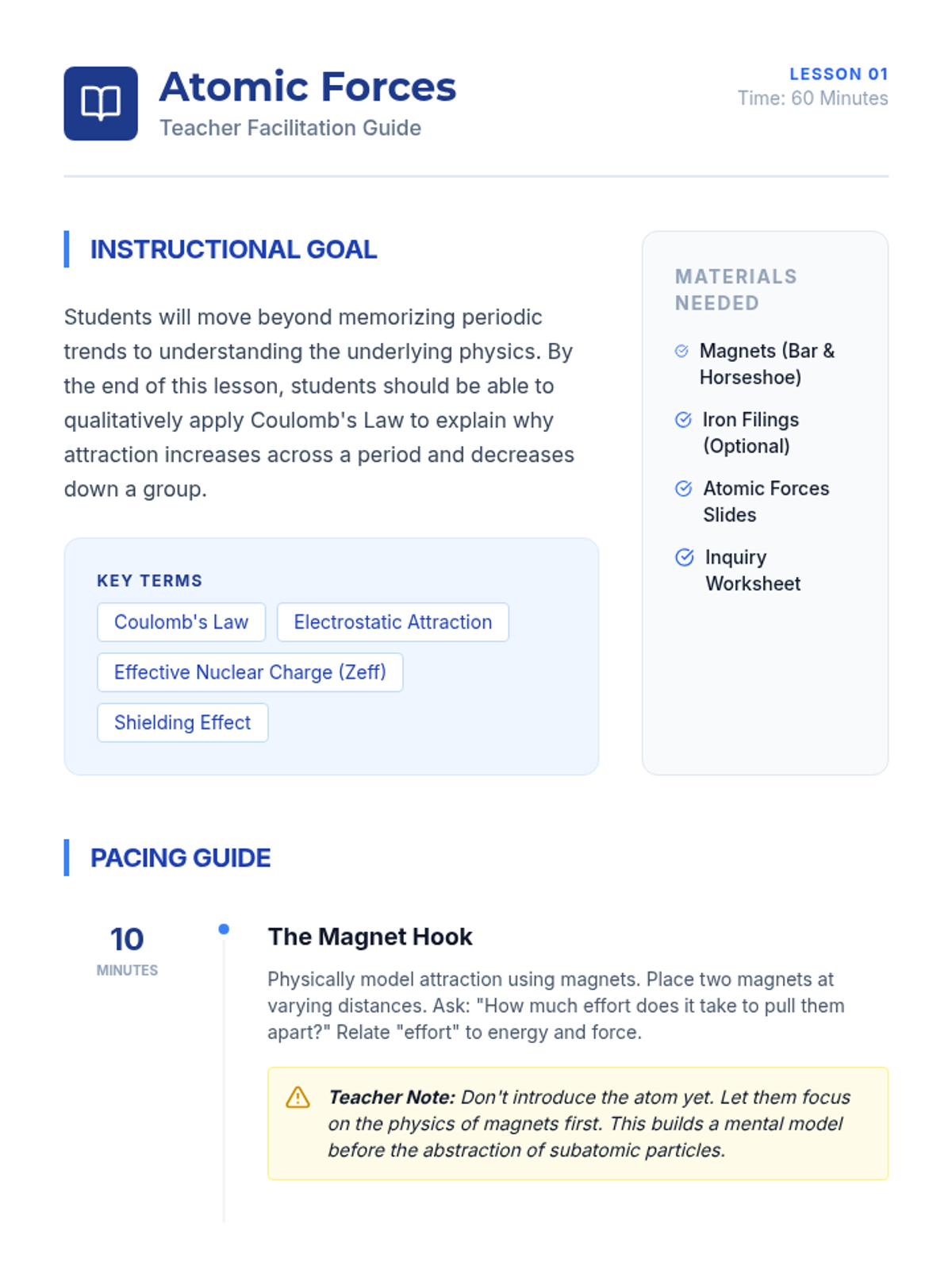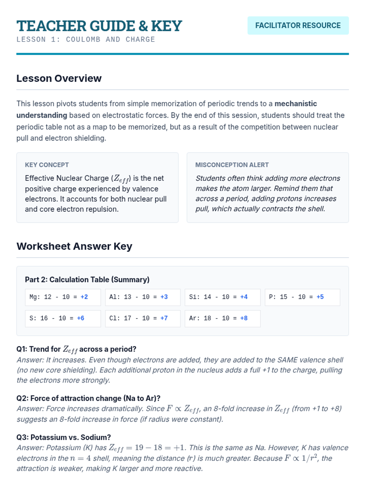 This 12th-grade physics sequence explores how Coulomb's Law and electrostatic forces govern periodic trends. Students analyze Effective Nuclear Charge (Zeff), atomic radii, ionization energies, and electronegativity to understand the underlying physical principles of chemical behavior.