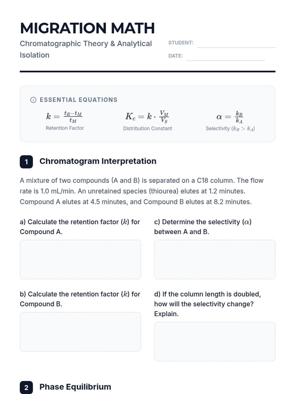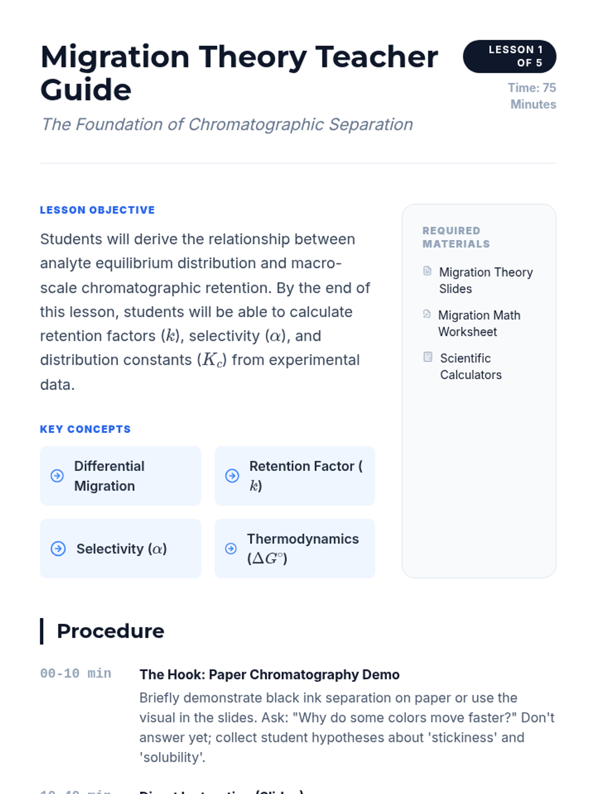 A comprehensive undergraduate sequence on the physicochemical principles of chromatography, covering thermodynamic migration theory, kinetic efficiency (Van Deemter), phase optimization, instrumentation (GC/HPLC), and quantitative analytical methods.