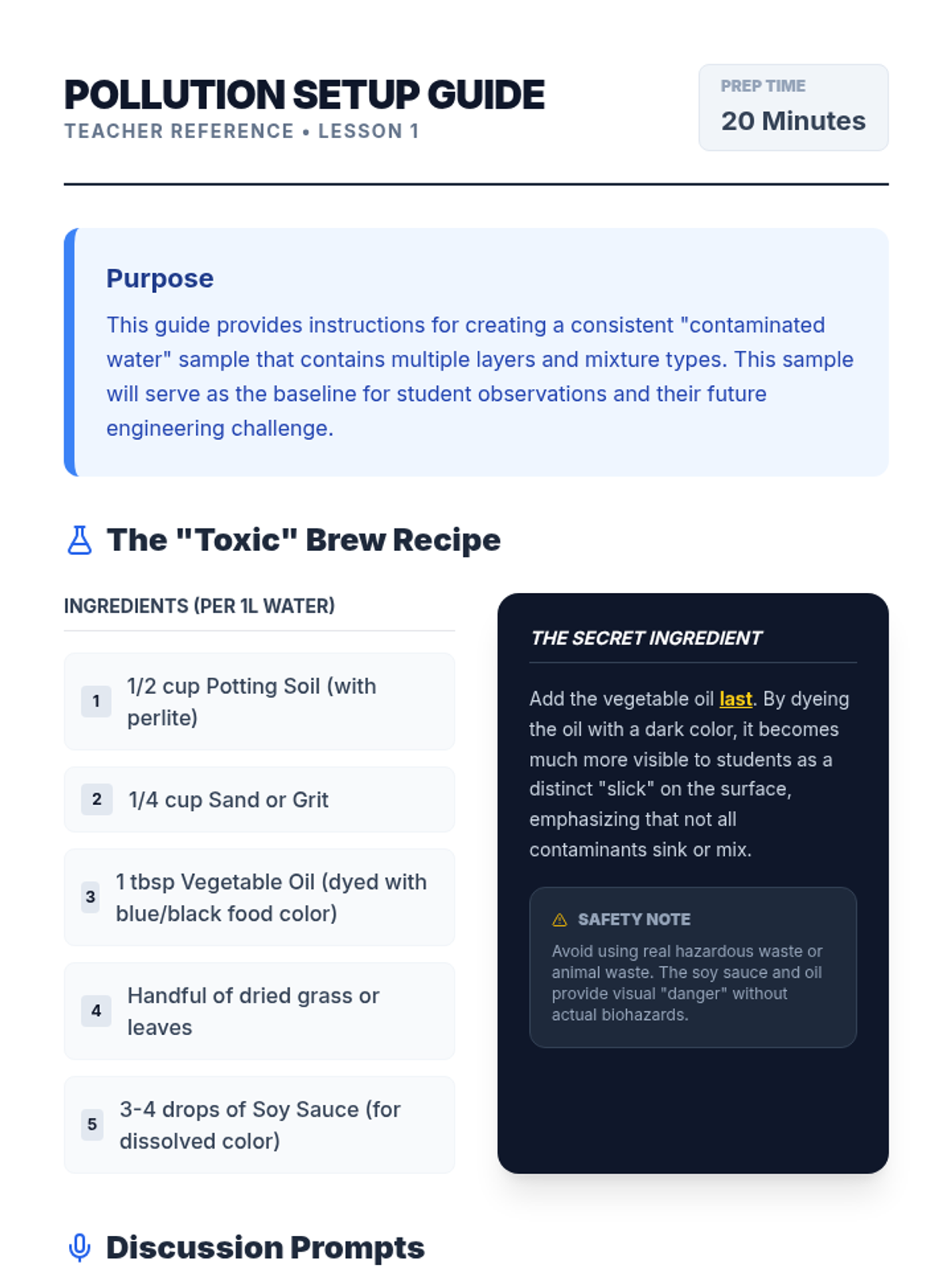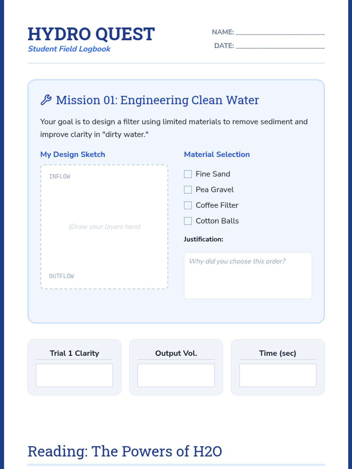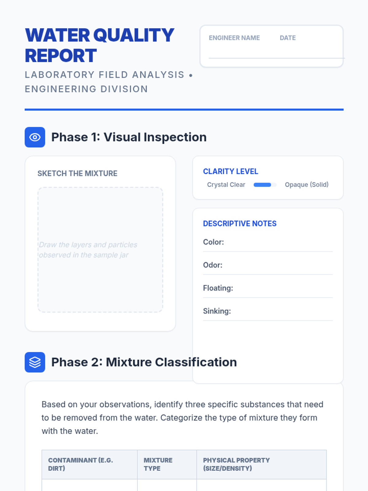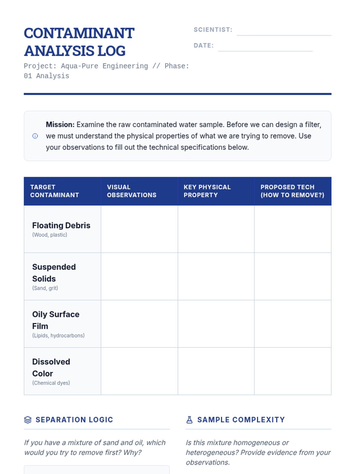 Students act as environmental engineers designing a multi-stage water filtration system. They explore sedimentation, decanting, and various filtration media to solve a real-world water contamination challenge.