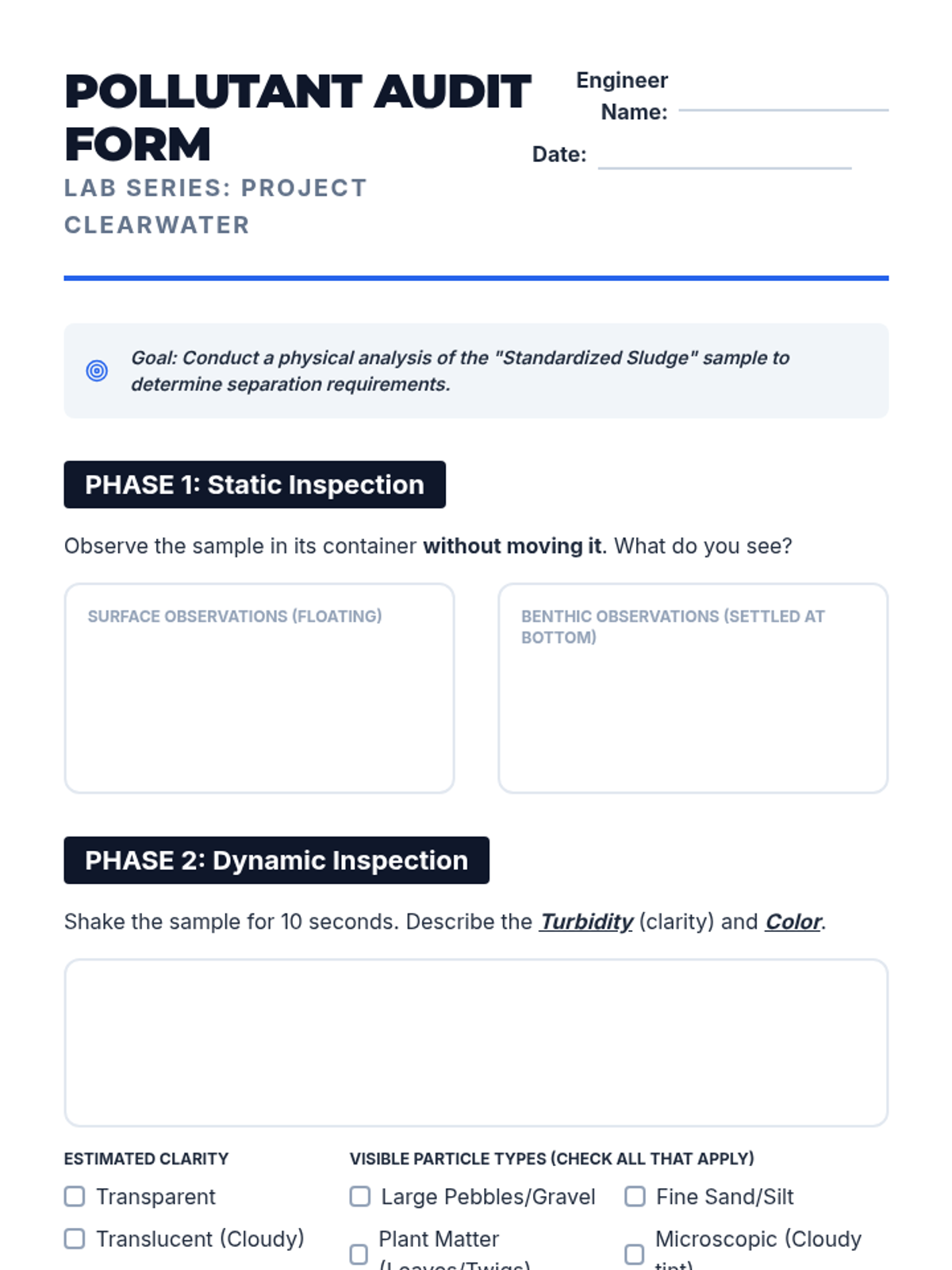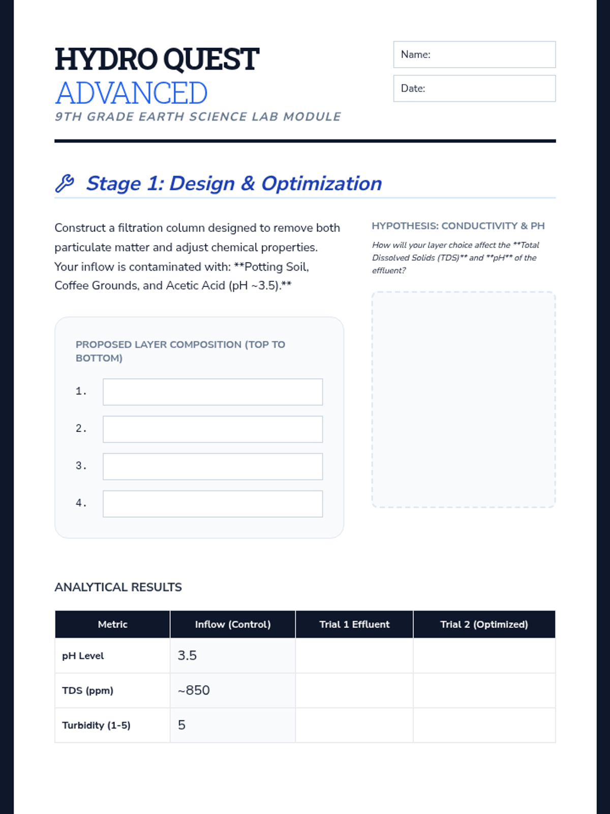 A project-based physics sequence where 10th-grade students act as environmental engineers to design, build, and test a multi-stage water filtration system. Students explore physical properties of mixtures, separation techniques, and engineering design constraints.