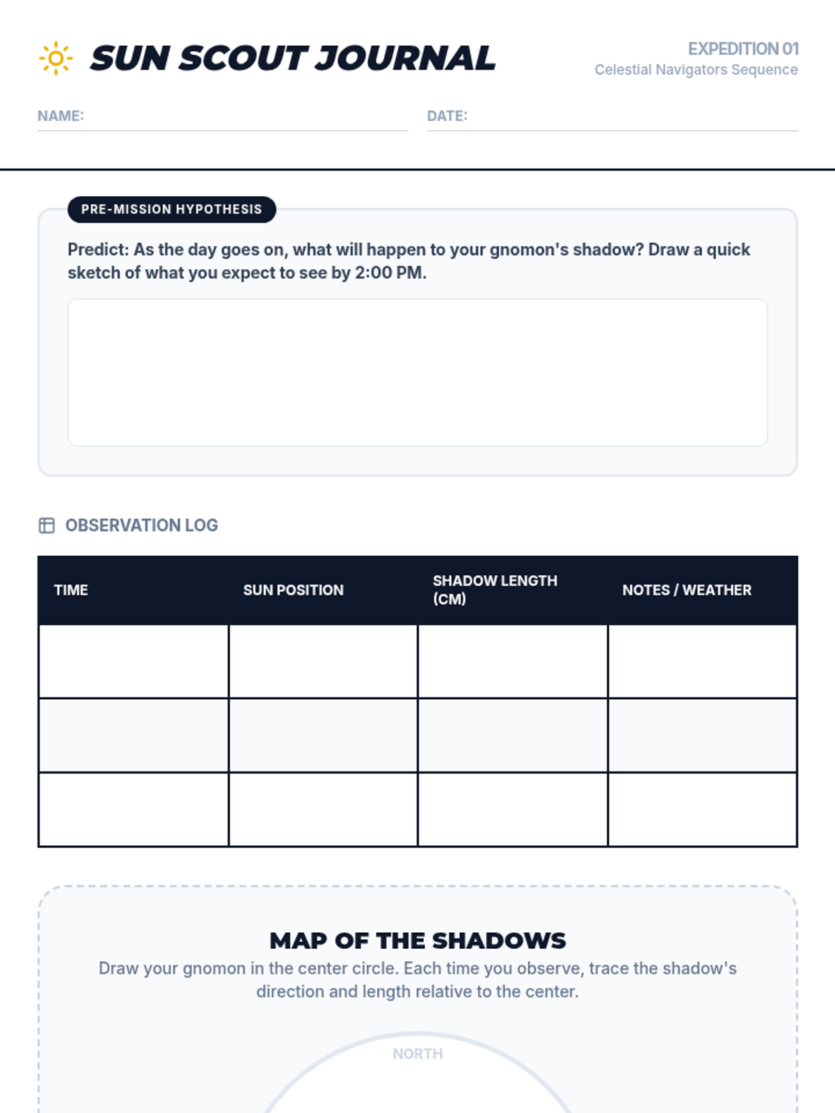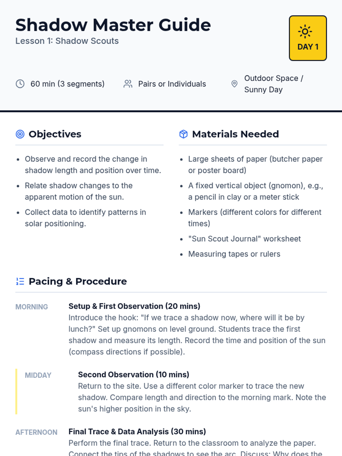 This 5th-grade astronomy sequence explores how Earth's rotation creates observable patterns like moving shadows, day and night, and apparent star movement. Students use hands-on tracking, physical modeling, and data analysis to transition from a geocentric observation to a heliocentric understanding of our planet's spin.