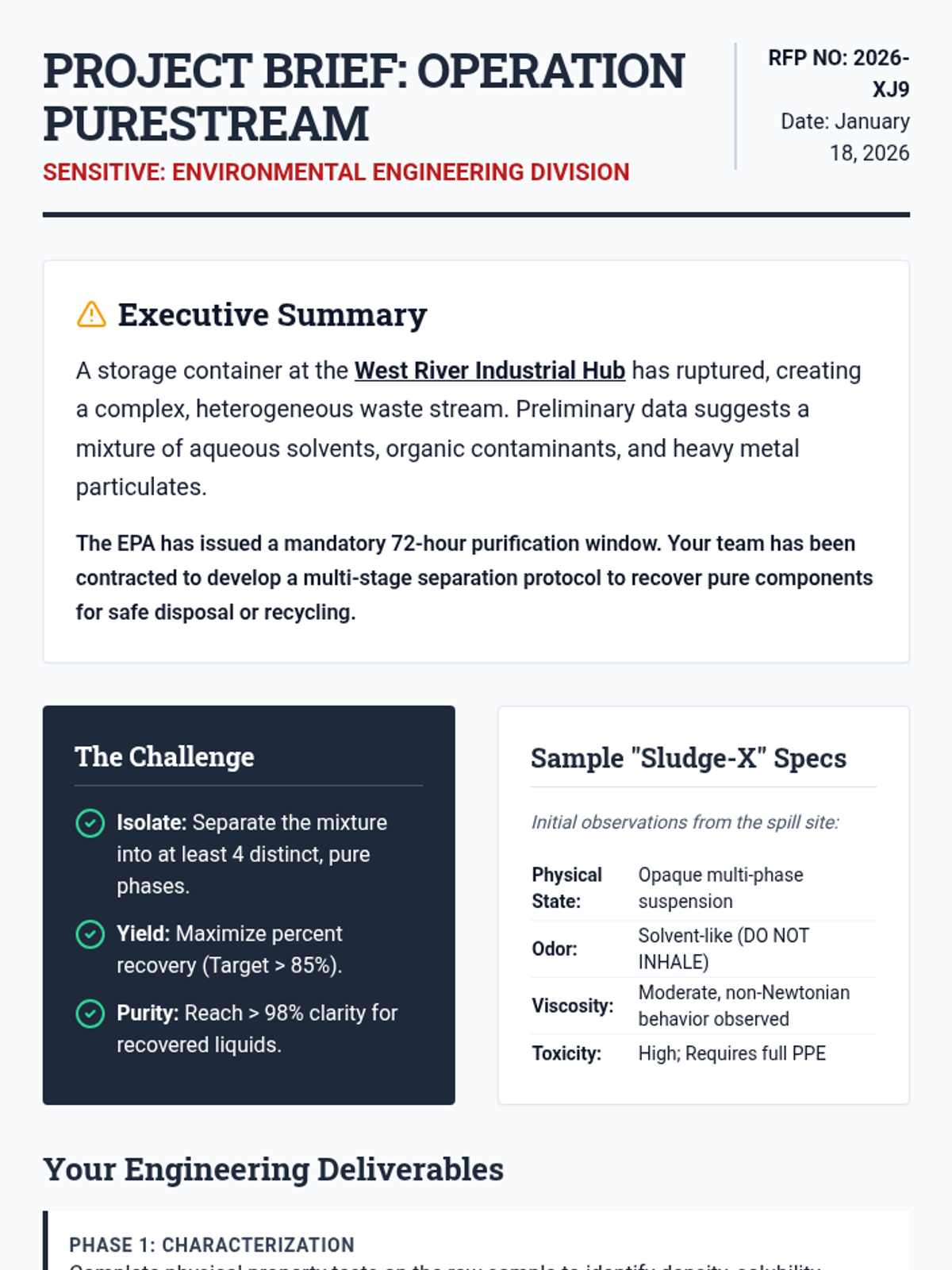 A project-based sequence where 12th-grade students act as environmental engineers to design, test, and optimize a multi-stage separation protocol for a complex hazardous waste mixture. Students apply physical principles of density, solubility, and boiling points to isolate pure substances.