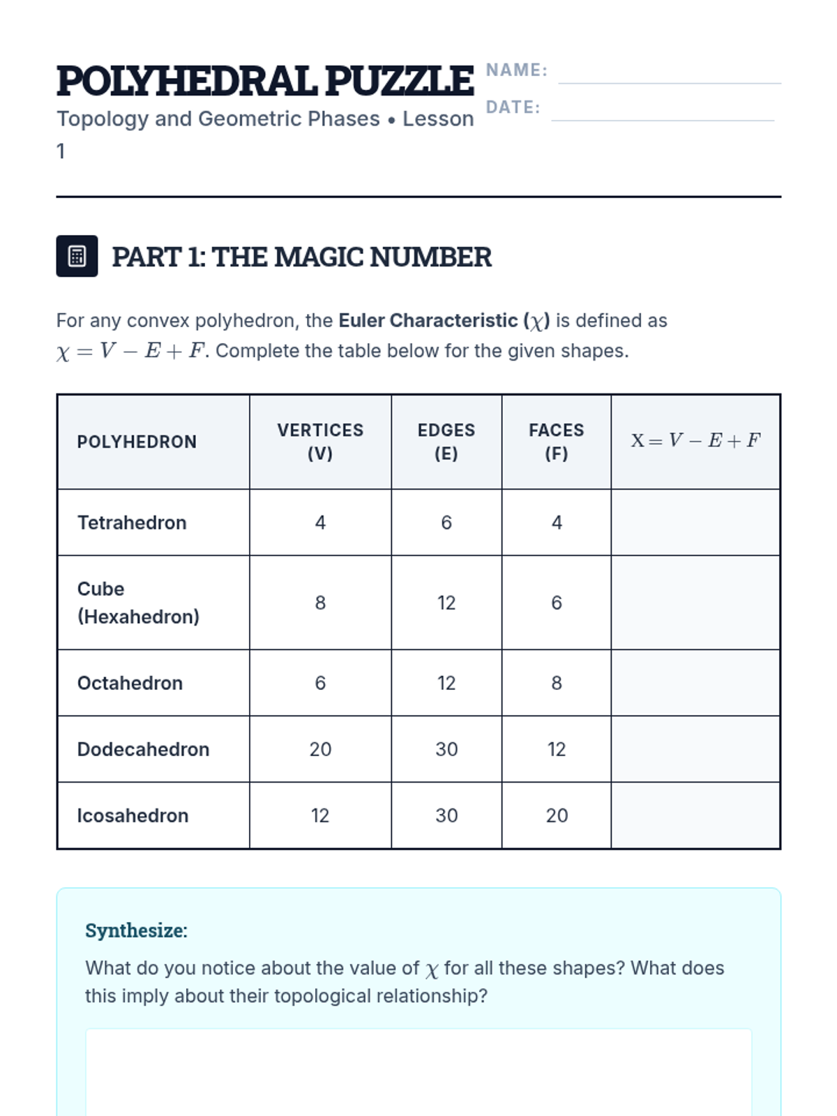 This sequence introduces students to topology—the study of geometric properties preserved under continuous deformation—and its applications in modern physics. Students explore global geometric invariants like the Euler characteristic and genus, contrasting them with local geometry, and progress to physical manifestations like the Berry phase and topological insulators.